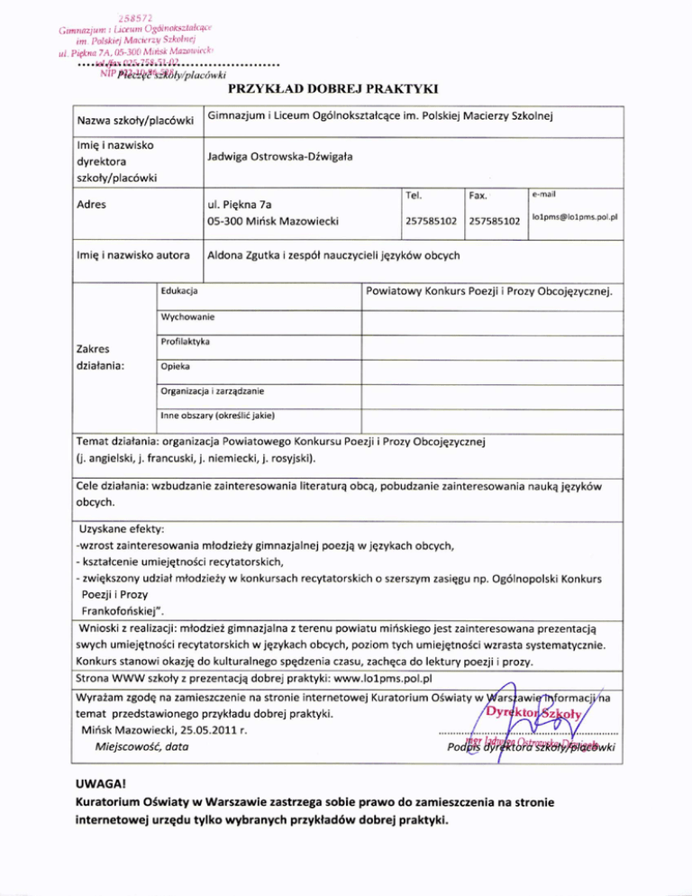 Gimnazjum 258572. i Liceum Ogólnokształcące im Polskiej Macierzy Szkolnej ul. Piękna 7A, 05-300 h\\mk Mazowicck; . . . . ttW^^ 02Ul!iS-JiUV, PRZYKŁAD D O B R E J P R A K T Y K I Nazwa szkoły/placówki Imię i nazwisko dyrektora szkoły/placówki Gimnazjum i Liceum Ogólnokształcące im. Polskiej Macierzy Szkolnej Jadwiga Ostrowska-Dźwigała ul. Piękna 7a 05-300 Mińsk Mazowiecki Adres Imię i nazwisko autora Tel. Fax. e-mail 257585102 257585102 [email protected] Aldona Zgutka i zespół nauczycieli języków obcych Edukacja Powiatowy Konkurs Poezji i Prozy Obcojęzycznej. Wychowanie Zakres działania: Profilaktyka Opieka Organizacja i zarządzanie Inne obszary (określić jakie) Temat działania: organizacja Powiatowego Konkursu Poezji i Prozy Obcojęzycznej (j. angielski, j . francuski, j . niemiecki, j . rosyjski). Cele działania: wzbudzanie zainteresowania literaturą obcą, pobudzanie zainteresowania nauką języków obcych. Uzyskane efekty: -wzrost zainteresowania młodzieży gimnazjalnej poezją w językach obcych, - kształcenie umiejętności recytatorskich, - zwiększony udział młodzieży w konkursach recytatorskich o szerszym zasięgu np. Ogólnopolski Konkurs Poezji i Prozy Frankofońskiej". Wnioski z realizacji: młodzież gimnazjalna z terenu powiatu mińskiego jest zainteresowana prezentacją swych umiejętności recytatorskich w językach obcych, poziom tych umiejętności wzrasta systematycznie. Konkurs stanowi okazję do kulturalnego spędzenia czasu, zachęca do lektury poezji i prozy. Strona WWW szkoły z prezentacją dobrej praktyki: www.lolpms.pol.pl Wyrażam zgodę na zamieszczenie na stronie internetowej Kuratorium Oświaty wy/arszawi(G^formacjj/ha temat przedstawionego przykładu dobrej praktyki. /Dyr^ktoi Mińsk Mazowiecki, 25.05.2011 r. Miejscowość, data PoJ^lł^FMffi^(!/''^^^im^wki UWAGA! Kuratorium Oświaty w Warszawie zastrzega sobie prawo do zamieszczenia na stronie internetowej urzędu ty\ko wybranych przykładów dobrej pral<tyl(i.