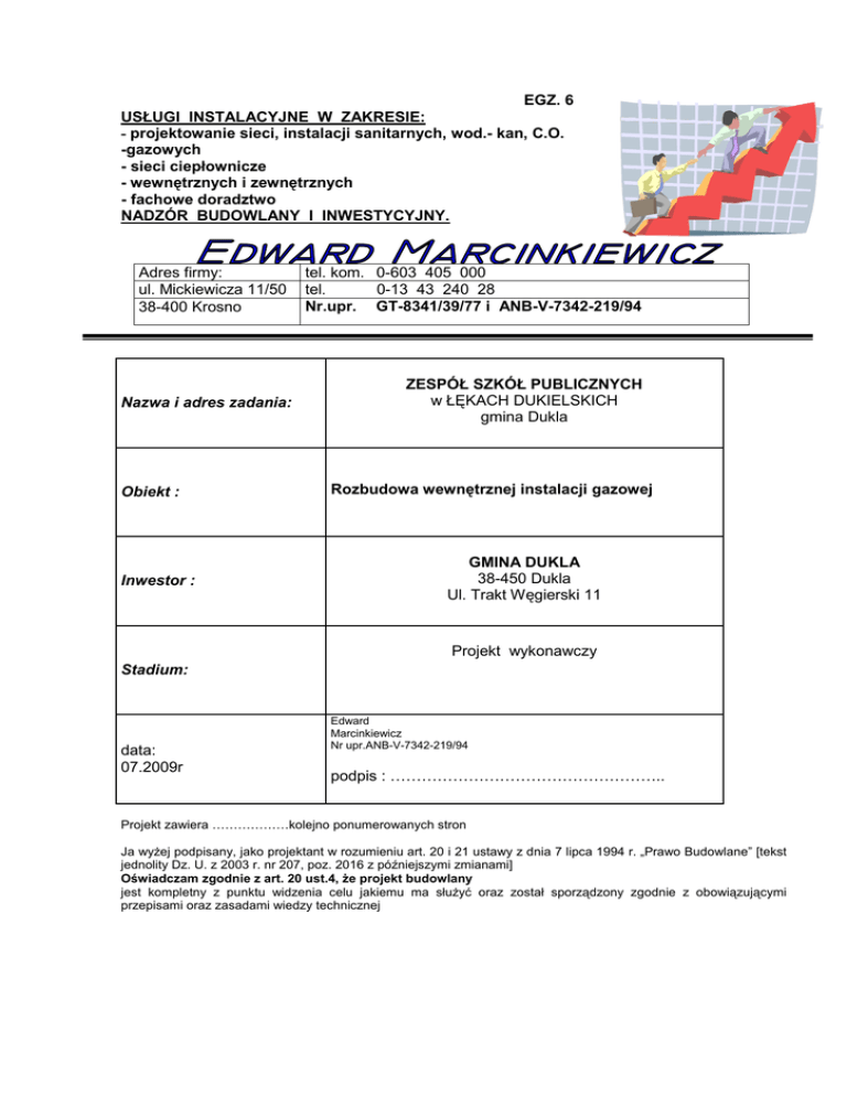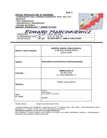 EGZ. 6 USŁUGI INSTALACYJNE W ZAKRESIE: - projektowanie sieci, instalacji sanitarnych, wod.- kan, C.O. -gazowych - sieci ciepłownicze - wewnętrznych i zewnętrznych - fachowe doradztwo NADZÓR BUDOWLANY I INWESTYCYJNY. Adres firmy: ul. Mickiewicza 11/50 38-400 Krosno Nazwa i adres zadania: Obiekt : Inwestor : tel. kom. 0-603 405 000 tel. 0-13 43 240 28 Nr.upr. GT-8341/39/77 i ANB-V-7342-219/94 ZESPÓŁ SZKÓŁ PUBLICZNYCH w ŁĘKACH DUKIELSKICH gmina Dukla Rozbudowa wewnętrznej instalacji gazowej GMINA DUKLA 38-450 Dukla Ul. Trakt Węgierski 11 Projekt wykonawczy Stadium: data: 07.2009r Edward Marcinkiewicz Nr upr.ANB-V-7342-219/94 podpis : …………………………………………….. Projekt zawiera ………………kolejno ponumerowanych stron Ja wyŜej podpisany, jako projektant w rozumieniu art. 20 i 21 ustawy z dnia 7 lipca 1994 r. „Prawo Budowlane” [tekst jednolity Dz. U. z 2003 r. nr 207, poz. 2016 z późniejszymi zmianami] Oświadczam zgodnie z art. 20 ust.4, Ŝe projekt budowlany jest kompletny z punktu widzenia celu jakiemu ma słuŜyć oraz został sporządzony zgodnie z obowiązującymi przepisami oraz zasadami wiedzy technicznej 2 SPIS TREŚCI A. CZĘŚĆ OPISOWA I.PODSTAWA OPRACOWANIA II.STAN ISTNIEJĄCY III.ZAKRES OPRACOWANIA IV.WEWNĘTRZNA INSTALACJA GAZOWA V.PRZYBORY GAZOWE VI.ODPROWADZENIE SPALIN I WENTYLACJA VII.KUREK GŁÓWNY ORAZ PUNKT REDUKCYJNO-POMIAROWY DO 60m3/h VIII.GŁÓWNA PRÓBA SZCZELNOŚCI INSTALACJI GAZOWEJ IX.AKTYWNY SYSTEM INSTALACJI GAZOWEJ X.UWAGI KOŃCOWE XI.ZESTAWIENIE PODSTAWOWYCH MATERIAŁÓW DO BUDOWY INSTALACJI B. ZAŁĄCZNIKI 1. warunki techniczne przyłączenia do sieci gazowej wydane przez Oddział Zakład Gazowniczy w Jaśle ul. Floriańska 112, znak 601/0/WP2/100/09 z dnia 27-07-2009r. 2. obliczenie strat ciśnienia w instalacji gazowej 3. informacja dotycząca Bezpieczeństwa i Ochrony Zdrowia C. 1. 2. 3. 4. 5. RYSUNKI rzut piwnic rozwinięcie aksonometryczne instalacji gazowej rysunek montaŜowy punktu red – pom. gazu rysunek obudowy szafki gazowej prowadzenie przewodów gazowych - skala 1 : 100 skala 1 : 100 skala 1 : % skala 1 : 10 skala 1 : % 3 Opis techniczny Do projektu rozbudowy wewnętrznej instalacji gazowej w Budynku Zespołu Szkół Publicznych w Łękach Dukielskich gmina Dukla [dz.nr 1244;1245] I. PODSTAWA OPRACOWANIA. Niniejszy projekt opracowano na zlecenie Inwestora oraz w oparciu o: 1. wykonaną inwentaryzację budowlaną dla celów projektowych. 2. warunki techniczne przyłączenia do sieci gazowej wydane przez Oddział Zakład Gazowniczy w Jaśle ul. Floriańska 112, znak 601/0/WP2/100/09 z dnia 24-07-2009r. a) Rozporządzenie Ministra Infrastruktury Dz.U.02.75.690 z póź. zm.) z dnia 16.12.2002 r. w sprawie warunków technicznych, jakim powinny odpowiadać budynki i ich usytuowanie. b) Polskie Normy, Rozporządzenia, literatura oraz Normy BranŜowe i aprobaty techniczne stosowanych materiałów oraz przepisy p.poŜ. i BHP. c) Prawo Budowlane art. 7 ust. 2 pkt. 1 ustawy z dnia 7 lipca 1994r. (Dz.U.z 2000 r. Nr 106 poz. 1126, nr 109 poz. 1157 i nr 120 poz. 1268, z dnia 2001r. Nr 5 poz. 42, nr 100 poz. 1085, nr 110 poz. 1190, nr 115 poz. 1229, nr 129 poz. 1439 i nr 154 poz. 1800 oraz z 2002 r. Nr 74 poz.676) z późn. zm. d) Rozporządzenie Ministra Spraw Wewnętrznych i Administracji z dnia 16.06.2003r. w sprawie ochrony przeciwpoŜarowej budynków, innych obiektów i terenów. ”Dz.U. Nr 121 poz. 1138 e) Techniczna ochrona przeciwpoŜarowa w budownictwie wymagania dla materiałów i elementów budowlanych Dz.U.nr 75 poz. 690 Rozporządzenie Ministra Infrastruktury z dnia 12 kwietnia 2002r. f) Prawo Budowlane z dnia 7 lipca 1994r. Dz.U.03.207.2016 01.01.2004 zm. Przen. Dz.U.03.80.718 II.STAN ISTNIEJĄCY. Budynek Zespołu Szkół Publicznych wyposaŜony jest w wewnętrzną instalację gazową wykonaną z rur stalowych czarnych bez szwu o połączeniach spawanych i skręcanych. Gaz ziemny do budynku doprowadzony jest przyłączem gazowym średniego ciśnienia o średnicy 20 [mm] zakończonym kurkiem Dn 20 [mm]. Pomiar ilości zuŜycia gazu odbywa się poprzez dwa istniejące gazomierze miechowe typ G6 oraz trzy reduktory R-10 zlokalizowane na zewnętrznej ścianie budynku. Do instalacji gazowej podłączone są: − dwa kotły gazowe firmy OLSZAR o mocy 63 KW kaŜdy[rok produkcji 1992]. III. ZAKRES OPRACOWANIA. Budynek Szkoły posiada własną kotłownię opalaną gazem ziemnym wyposaŜoną w dwa kotły gazowe o mocy 63 KW kaŜdy. Wskutek długotrwałej eksploatacji kotły te uległy naturalnemu zuŜyciu, oraz to, Ŝe do istniejącej instalacji została podłączona instalacja centralnego ogrzewania sali widowiskowo – sportowej – obecna kotłownia posiada zbyt małą wydajność i w pełni nie zabezpiecza w ciepło grzewcze obiektów szkolnych. W związku z tym Inwestor zdecydował o rozbudowie istniejącej kotłowni polegającej na wymianie istniejących kotłów na kotły o większej mocy. Do projektowanych[nowych] kotłów c.o naleŜy doprowadzić instalację gazową. Istniejącą wewnętrzną instalację gazową naleŜy zdemontować. IV. WEWNĘTRZNA INSTALACJA GAZOWA. Projektowaną wewnętrzną instalację gazową naleŜy wykonać z rur stalowych czarnych bez szwu wg normy PN-EN 10208 – 1:2000 „Rury stalowe przewodowe dla mediów palnych. Rury o klasie wymagań A” lub rur stalowych bez szwu precyzyjnych wg. PN-EN 10305-1:2003 łączonych przez spawanie elektryczne. Do budowy instalacji zastosowane będą łuki gięte (bez fałdów) i kolana wg. PN-EN 10210. Miejsce włączenia do instalacji gazowej oraz trasę pokazano na rysunku. Przewody gazowe w piwnicy naleŜy prowadzić na powierzchni ścian w odległości 3÷5 cm od ściany w sposób zapewniający bezpieczeństwo ich uŜytkowania Przewodów instalacji gazowych nie naleŜy prowadzić przez pomieszczenia mieszkalne oraz pomieszczenia, których sposób uŜytkowania moŜe spowodować naruszenie stanu technicznego instalacji lub wpływać