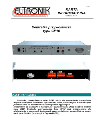 1302 KARTA INFORMACYJNA CP10-KI-811-1 Centralka przywoławcza typu CP10 ZASTOSOWANIE: Q Centralka przywoławcza typu CP10 służy do przywołania konwojenta wagonu dźwiękiem i światłem z przedziału, przez podróżnego -. Centralka jest przeznaczona do zainstalowania w wagonach sypialnych. Niezależnie od centralki w kasecie jest zamontowany układ kontroli maźnic typu UKM. Centralka przywoławcza typu CP10 jest przeznaczona do użytkowania w wagonach kolejowych typu sypialnego, szczególnie w wagonach typu 305Ad2 (produkcji H.Cegielski-FPS). 1302 OPIS: Centralka jest wykonana w technice mieszanej, tzn. z wykorzystaniem tranzystorów i bipolarnych układów scalonych oraz z układów scalonych typu CMOS. Całość układu elektronicznego jest sterowana przez mikroprocesor. Wynikiem działania układu jest informacja świetlna (diody LED), wskazująca lokalizację miejsca zgłoszenia przywołania oraz sygnalizacja dźwiękowa. W przypadku zgłoszenia z przedziału, centralka dodatkowo podaje napięcie na podświetlany przycisk sterowniczy, znajdujący się nad drzwiami przedziału, z którego nadeszło przywołanie. Zgłoszone przywołanie jest sygnalizowane świeceniem diod LED - można je zlikwidować indywidualnie przez wciśnięcie podświetlonego przycisku przedziału lub grupowo, za pomocą opisanego piktogramem przycisku, na płycie czołowej centralki. Dodatkowy przycisk umożliwia sprawdzenie diod elektroluminescencyjnych sygnalizacji. Centralka jest zmontowana na pojedynczej płycie drukowanej. Na tylnej krawędzi znajdują się trzy złącza do przyłączenia do instalacji wagonowej. Dwa z nich GZ1 i GZ2 są przeznaczone do przyłączenia sygnałów przywoławczych z przedziałów. GZD3 to złącze do przyłączenia zasilania i do wyprowadzenia przewodów do głośnika zewnętrznego. Złącze GZD4 jest przeznaczone do testowania i nie jest zamontowane we wszystkich wykonaniach centrali. Na przedniej krawędzi jest umieszczone złącze do przyłączenia sygnałów do płyty czołowej. Na płycie czołowej, której zadaniem jest przedstawienie w sposób obrazowy instalacji przywoławczej, znajdują się diody LED, odzwierciedlające przyporządkowanie sygnałów przywołania z poszczególnych przedziałów wagonu oraz przyciski do nastawiania poziomu sygnału akustycznego, informującego o przywołaniu i wyłącznik zasilania. DANE TECHNICZNE: • • • • • • • • • • • znamionowe napięcie zasilania……………………………...………………….……24 V d.c. zakres zmian napięcia zasilania ……………………………………………..(od 16 do 33) V wymiary kasety 3U ………………………………………..….…483 mm x 274 mm x 67 mm masa:………………………………………………………………………...………….….1,8 kg stopień ochrony……………………………………………………….……………………..IP20 zewnętrzna temperatura pracy …………………………….……klasa T3 wg PN-EN 50155 maksymalny prąd pobierany (bez obwodów zewnętrznych)………….…….… ok. 100 mA liczba punktów przywołania……………………………..…………………………………... 20 zewnętrzne obwody sygnalizacji………………………...….....20 żarówek 24 V/maks. 2 W Warunki Techniczne Wykonania i Odbioru…………………………..……...CP-WTO-811-1 Zespół nadzoru temperatury maźnic… maksymalny prąd pobierany…………………………………………………………….150mA sposób działania obwodu czujności……………………………………….rozwarcie obwodu PPPiH ELTRONIK Sp. z o.o. ul. Lelewela 4B 61-409 POZNAŃ tel. (+48) 61 830 42 01, 61 839 92 44, 61 839 92 49, fax. 61 830 65 02 http://www.eltronik.pl e-mail: [email protected]