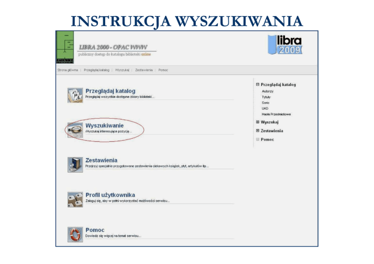 INSTRUKCJA WYSZUKIWANIA 1. WYBIERAMY OPCJĘ „WYSZUKIWANIE” 2. WYBIERAMY TYP INDEKSU (KATALOGU) 3. WYBIERAMY TYP DOKUMENTU 4. W POLU „SZUKANA FRAZA” WPISUJEMY AUTORA /REDAKTORA: Nazwisko, Imię - np.: Pilch, Tadeusz 5. KLIKAMY „WYSZUKAJ”, REZULTAT WYSZUKIWANIA: 6. KLIKAMY W POSZUKIWANĄ PRZEZ NAS POZYCJĘ EFEKT: 7. WYPISUJEMY ZAMÓWIENIE ZAWIERAJĄCE CO NAJMNIEJ DWIE SYGNATURY POZYCJI DOSTĘPNYCH (NIEWYPOŻYCZONYCH), CZYLI: ZAMÓWIENIE NA KSIĄŻKĘ 38289 38430 SYGNATURA AUTOR: ................Pilch Tadeusz…….................................. TYTUŁ: ............Zasady badań pedagogicznych............... TOM:............................................................................................ ………..Nowak Jan......... Nazwisko i imię czytelnika