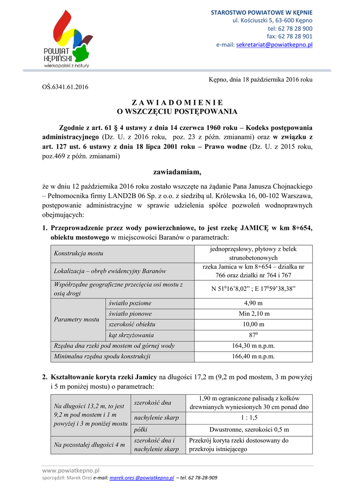 STAROSTWO POWIATOWE W KĘPNIE ul. Kościuszki 5, 63-600 Kępno tel: 62 78 28 900 fax: 62 78 28 901 e-mail: [email protected] Kępno, dnia 18 października 2016 roku OŚ.6341.61.2016 ZAWIADOMIENIE O WSZCZĘCIU POSTĘPOWANIA Zgodnie z art. 61 § 4 ustawy z dnia 14 czerwca 1960 roku – Kodeks postępowania administracyjnego (Dz. U. z 2016 roku, poz. 23 z późn. zmianami) oraz w związku z art. 127 ust. 6 ustawy z dnia 18 lipca 2001 roku – Prawo wodne (Dz. U. z 2015 roku, poz.469 z późn. zmianami) zawiadamiam, że w dniu 12 października 2016 roku zostało wszczęte na żądanie Pana Janusza Chojnackiego – Pełnomocnika firmy LAND2B 06 Sp. z o.o. z siedzibą ul. Królewska 16, 00-102 Warszawa, postępowanie administracyjne w sprawie udzielenia spółce pozwoleń wodnoprawnych obejmujących: 1. Przeprowadzenie przez wody powierzchniowe, to jest rzekę JAMICĘ w km 8+654, obiektu mostowego w miejscowości Baranów o parametrach: Konstrukcja mostu Lokalizacja – obręb ewidencyjny Baranów Współrzędne geograficzne przecięcia osi mostu z osią drogi Parametry mostu jednoprzęsłowy, płytowy z belek strunobetonowych rzeka Jamica w km 8+654 – działka nr 766 oraz działki nr 764 i 767 N 51016’8,02” ; E 17059’38,38” światło poziome 4,90 m światło pionowe Min 2,10 m szerokość obiektu 10,00 m kąt skrzyżowania 870 Rzędna dna rzeki pod mostem od górnej wody 164,30 m n.p.m. Minimalna rzędna spodu konstrukcji 166,40 m n.p.m. 2. Kształtowanie koryta rzeki Jamicy na długości 17,2 m (9,2 m pod mostem, 3 m powyżej i 5 m poniżej mostu) o parametrach: szerokość dna Na długości 13,2 m, to jest 9,2 m pod mostem i 1 m nachylenie skarp powyżej i 3 m poniżej mostu półki Na pozostałej długości 4 m szerokość dna i nachylenie skarp 1,90 m ograniczone palisadą z kołków drewnianych wyniesionych 30 cm ponad dno 1 : 1,5 Dwustronne, szerokości 0,5 m Przekrój koryta rzeki dostosowany do przekroju istniejącego www.powiatkepno.pl sporządził: Marek Oreś e-mail: marek.ores @powiatkepno.pl – tel. 62 78-28-909 Sposób umocnienia dna i skarp rzeki Dno umocnione narzutem kamiennym gr. 20 cm na długości 17,2 m; Skarpy i półki pod mostem umocnione geokratą przestrzenną szczelnie wypełnioną gruntem; Skarpy i półki poza mostem umocnione przez darniowanie. Zainteresowane strony mogą zapoznać się z dokumentacją w przedmiotowej sprawie, która udostępniona jest w Wydziale Ochrony Środowiska, Rolnictwa i Leśnictwa Starostwa Powiatowego w Kępnie przy ul. Kościuszki 5, pok. nr 110 /I piętro/ i złożyć ewentualne wnioski oraz zastrzeżenia w terminie 7 dni od dnia doręczenia niniejszego zawiadomienia. Naczelnik Wydziału Ochrony Środowiska, Rolnictwa i Leśnictwa /Marek Oreś/ Otrzymują za zwrotnym potwierdzeniem odbioru: 1) Pan Janusz Chojnacki MOFO Architekci ul. Morawskiego 5 30-102 Kraków (Pełnomocnik LAND2B 06 Sp. z o.o.) 2) Wielkopolski Zarząd Melioracji i Urządzeń Wodnych w Poznaniu Rejonowy Oddział w Ostrowie Wielkopolskim ul. Dąbrowskiego 9, 63-400 Ostrów Wielkopolski Otrzymują do wiadomości: 1) Urząd Gminy w Baranowie ul. Rynek 21, 63-604 Baranów 2) a.a. Wydziału www.powiatkepno.pl sporządził: Marek Oreś e-mail: marek.ores @powiatkepno.pl – tel. 62 78-28-909