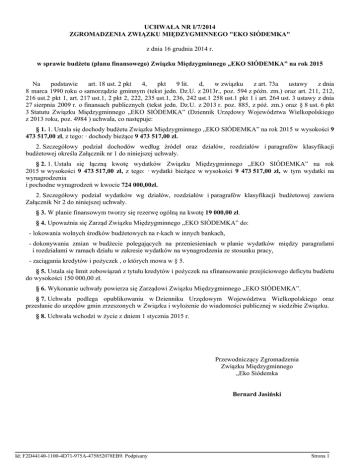 UCHWAŁA NR I/7/2014 ZGROMADZENIA ZWIĄZKU MIĘDZYGMINNEGO "EKO SIÓDEMKA" z dnia 16 grudnia 2014 r. w sprawie budżetu (planu finansowego) Związku Międzygminnego „EKO SIÓDEMKA” na rok 2015 Na podstawie art. 18 ust. 2 pkt 4, pkt 9 lit. d, w związku z art. 73a ustawy z dnia 8 marca 1990 roku o samorządzie gminnym (tekst jedn. Dz.U. z 2013r., poz. 594 z późn. zm.) oraz art. 211, 212, 216 ust.2 pkt 1, art. 217 ust.1, 2 pkt 2, 222, 235 ust.1, 236, 242 ust.1 258 ust.1 pkt 1 i art. 264 ust. 3 ustawy z dnia 27 sierpnia 2009 r. o finansach publicznych (tekst jedn. Dz.U. z 2013 r. poz. 885, z póź. zm.) oraz § 8 ust. 6 pkt 3 Statutu Związku Międzygminnego „EKO SIÓDEMKA” (Dziennik Urzędowy Województwa Wielkopolskiego z 2013 roku, poz. 4984 ) uchwala, co następuje: § 1. 1. Ustala się dochody budżetu Związku Międzygminnego „EKO SIÓDEMKA” na rok 2015 w wysokości 9 473 517,00 zł, z tego: · dochody bieżące 9 473 517,00 zł. 2. Szczegółowy podział dochodów według źródeł oraz działów, rozdziałów i paragrafów klasyfikacji budżetowej określa Załącznik nr 1 do niniejszej uchwały. § 2. 1. Ustała się łączną kwotę wydatków Związku Międzygminnego „EKO SIÓDEMKA” na rok 2015 w wysokości 9 473 517,00 zł, z tego: · wydatki bieżące w wysokości 9 473 517,00 zł, w tym wydatki na wynagrodzenia i pochodne wynagrodzeń w kwocie 724 000,00zł. 2. Szczegółowy podział wydatków wg działów, rozdziałów i paragrafów klasyfikacji budżetowej zawiera Załącznik Nr 2 do niniejszej uchwały. § 3. W planie finansowym tworzy się rezerwę ogólną na kwotę 19 000,00 zł. § 4. Upoważnia się Zarząd Związku Międzygminnego „EKO SIÓDEMKA” do: - lokowania wolnych środków budżetowych na r-kach w innych bankach, - dokonywania zmian w budżecie polegających na przeniesieniach w planie wydatków między paragrafami i rozdziałami w ramach działu w zakresie wydatków na wynagrodzenia ze stosunku pracy, - zaciągania kredytów i pożyczek , o których mowa w § 5. § 5. Ustala się limit zobowiązań z tytułu kredytów i pożyczek na sfinansowanie przejściowego deficytu budżetu do wysokości 150 000,00 zł. § 6. Wykonanie uchwały powierza się Zarządowi Związku Międzygminnego „EKO SIÓDEMKA”. § 7. Uchwała podlega opublikowaniu w Dzienniku Urzędowym Województwa Wielkopolskiego oraz przesłanie do urzędów gmin zrzeszonych w Związku i wyłożenie do wiadomości publicznej w siedzibie Związku. § 8. Uchwała wchodzi w życie z dniem 1 stycznia 2015 r. Przewodniczący Zgromadzenia Związku Międzygminnego „Eko Siódemka Bernard Jasiński Id: F2D44140-1100-4D71-975A-475852078EB9. Podpisany Strona 1 Id: F2D44140-1100-4D71-975A-475852078EB9. Podpisany Strona 2 Załącznik Nr 1 do uchwały nr I/7/2014 Zgromadzenia Związku Międzygminnego „EKO SIÓDEMKA” z dn.16 grudnia 2014r. Plan dochodów budżetu Związku Międzygminnego „EKO SIÓDEMKA” z siedzibą w Krotoszynie na 2015 r. (w złotych) Dz. Rozdz. § 900 90002 0490 0690 90013 2900 Wyszczególnienie Dochody budżetu ogółem Plan na 2015 9 473 517,00 Gospodarka komunalna i ochrona środowiska 9 473 517,00 Gospodarka odpadami Wpływy z innych lokalnych opłat pobieranych przez jednostki samozadu terytorialnego na podstawie ustaw 9 250 000,00 9 200 000,00 Wpływy z różnych opłat Schroniska dla zwierząt Wpływy z wpłat gmin i powiatów na rzecz innych jednostek samorządu terytorialnego oraz związków gmin lub związków powiatów na dofinansowanie zadań bieżących Id: F2D44140-1100-4D71-975A-475852078EB9. Podpisany 50 000,00 223 517,00 223 517,00 Strona 1 Załącznik Nr 2 do uchwały nr I/7/2014 Zgromadzenia Związku Międzygminnego "EKO SIÓDEMKA” z dn.16 grudnia 2014r. Plan wydatków budżetu Związku Międzygminnego „EKO SIÓDEMKA” z siedzibą w Krotoszynie na 2015 r. (w złotych) Dział Rozdz. Par. Treść Wydatki budżetu ogółem Plan na 2015 9 473 517,00 Administracja publiczna Pozostała działalność 994 245,00 994 245,00 - wydatki bieżące 994 245,00 750 75095 3020 Nagrody i wydatki osobowe nie zaliczane do wynagrodzeń 180,00 3030 Różne wydatki na rzecz osób fizycznych 100,00 4010 Wynagrodzenia osobowe pracowników 4040 Dodatkowe wynagrodzenie roczne 40 000,00 4110 Składki na ubezpieczenia społeczne 109 300,00 4120 Składki na Fundusz Pracy 14 700,00 4210 Zakup materiałów i wyposażenia 25 000,00 4260 Zakup energii 4300 Zakup usług pozostałych 4350 Zakup usług dostępu do sieci Internet 4360 Opłaty z tytułu usług telekomunikacyjnych świadczonych w telefoni komórkowej 4 000,00 4370 Opłaty z tytułu usług telekomunikacyjnych świadczonych w stacjonarnej publicznej sieci tel. 2 300,00 4410 Podróże służbowe 4430 Różne opłaty i składki 4440 Odpis na zakładowy fundusz świadczeń socjalnych 4480 Podatek od nieruchomości 4610 Koszty postępowania sądowego i prokurator. 4700 Szkolenia pracowników niebędących członkami Id: F2D44140-1100-4D71-975A-475852078EB9. Podpisany 560 000,00 4 000,00 200 000,00 500,00 10 000,00 2 000,00 12 865,00 1 000,00 300,00 8 000,00 Strona 1 korpusu służby cywilnej 758 75818 4810 900 90002 4300 90013 4300 Różne rozliczenia 19 000,00 Rezerwy ogólne i celowe 19 000,00 Rezerwy 19 000,00 Gospodarka komunalna i ochrona środowiska 8 460 272,00 Gospodarka odpadami 8 236 755,00 Zakup usług pozostałych 8 236 755,00 Schroniska dla zwierząt 223 517,00 Zakup usług pozostałych 223 517,00 Id: F2D44140-1100-4D71-975A-475852078EB9. Podpisany Strona 2 UZASADNIENIE DO BUDŻETU (PLANU FINANSOWEGO) ZWIĄZKU MIĘDZYGMINNEGO „EKO SIÓDEMKA” NA ROK 2015 I Wprowadzenie Budżetu Związku Międzygminnego „EKO SIÓDEMKA” opracowano zgodnie z zasadami określonymi w ustawie z dnia 27 sierpnia 2009 r. o finansach publicznych. Przy opracowaniu budżetu kierowano się możliwością zabezpieczenia niezbędnych środków na wydatki bieżące i majątkowe. Budżet Związku Międzygminnego "EKO SIÓDEMKA" sk