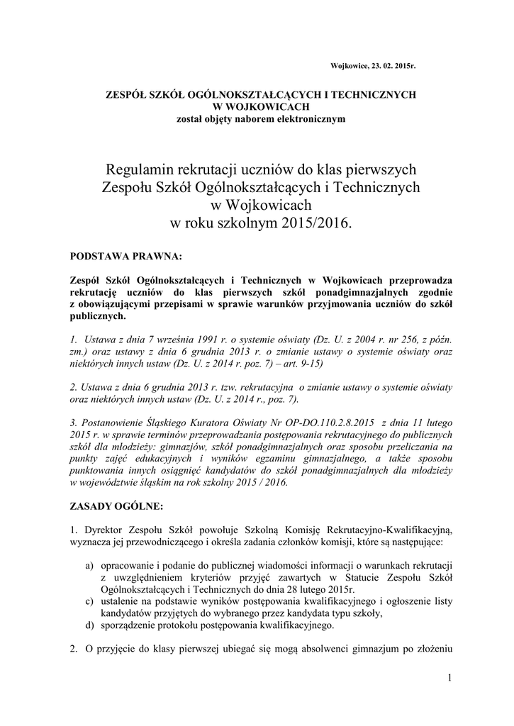 Wojkowice, 23. 02. 2015r. ZESPÓŁ SZKÓŁ OGÓLOKSZTAŁCĄCYCH I TECHICZYCH W WOJKOWICACH został objęty naborem elektronicznym Regulamin rekrutacji uczniów do klas pierwszych Zespołu Szkół Ogólnokształcących i Technicznych w Wojkowicach w roku szkolnym 2015/2016. PODSTAWA PRAWA: Zespół Szkół Ogólnokształcących i Technicznych w Wojkowicach przeprowadza rekrutację uczniów do klas pierwszych szkół ponadgimnazjalnych zgodnie z obowiązującymi przepisami w sprawie warunków przyjmowania uczniów do szkół publicznych. 1. Ustawa z dnia 7 września 1991 r. o systemie oświaty (Dz. U. z 2004 r. nr 256, z późn. zm.) oraz ustawy z dnia 6 grudnia 2013 r. o zmianie ustawy o systemie oświaty oraz niektórych innych ustaw (Dz. U. z 2014 r. poz. 7) – art. 9-15) 2. Ustawa z dnia 6 grudnia 2013 r. tzw. rekrutacyjna o zmianie ustawy o systemie oświaty oraz niektórych innych ustaw (Dz. U. z 2014 r., poz. 7). 3. Postanowienie Śląskiego Kuratora Oświaty 0r OP-DO.110.2.8.2015 z dnia 11 lutego 2015 r. w sprawie terminów przeprowadzania postępowania rekrutacyjnego do publicznych szkół dla młodzieży: gimnazjów, szkół ponadgimnazjalnych oraz sposobu przeliczania na punkty zajęć edukacyjnych i wyników egzaminu gimnazjalnego, a także sposobu punktowania innych osiągnięć kandydatów do szkół ponadgimnazjalnych dla młodzieży w województwie śląskim na rok szkolny 2015 / 2016. ZASADY OGÓLE: 1. Dyrektor Zespołu Szkół powołuje Szkolną Komisję Rekrutacyjno-Kwalifikacyjną, wyznacza jej przewodniczącego i określa zadania członków komisji, które są następujące: a) opracowanie i podanie do publicznej wiadomości informacji o warunkach rekrutacji z uwzględnieniem kryteriów przyjęć zawartych w Statucie Zespołu Szkół Ogólnokształcących i Technicznych do dnia 28 lutego 2015r. c) ustalenie na podstawie wyników postępowania kwalifikacyjnego i ogłoszenie listy kandydatów przyjętych do wybranego przez kandydata typu szkoły, d) sporządzenie protokołu postępowania kwalifikacyjnego. 2. O przyjęcie do klasy pierwszej ubiegać się mogą absolwenci gimnazjum po złożeniu 1 wszystkich wymaganych dokumentów. 3. Nabór młodzieży do klas pierwszych poprzedza akcja promocyjna i informacyjna w szkołach gimnazjalnych na terenie miasta i regionu polegająca na: a) wywieszeniu w Zespole Szkół Ogólnokształcących i Technicznych w Wojkowicach zasad rekrutacji na tablicy informacyjnej dla kandydatów oraz na stronie internetowej szkoły, b) organizacji „Dni Otwartych” szkoły w dniach 25 – 26 marca 2015r., c) przeprowadzeniu spotkania uczniów szkoły, nauczycieli, dyrekcji z uczniami i rodzicami na terenie gimnazjów, d) przekazywaniu ofert edukacyjnych Liceum Ogólnokształcącego i Technikum Architektury Krajobrazu gimnazjalistom i ich rodzicom. 4. Zgłoszenia kandydatów w systemie rekrutacji elektronicznej trwają od : 11 maja do 24 czerwca 2015 r. do godz. 12.00 • w Technikum Architektury Krajobrazu dodatkowo wymagane jest zaświadczenie lekarskie o braku przeciwwskazań zdrowotnych do kształcenia w zawodzie technika architektury krajobrazu oraz w zawodzie technika geodety. • Kandydaci niepełnosprawni powinni posiadać orzeczenie o potrzebie kształcenia specjalnego, wydane przez zespół orzekający działający w publicznej poradni psychologiczno – pedagogicznej, w tym poradni specjalistycznej. 5. Kandydaci składają świadectwo ukończenia gimnazjum o szczegółowych wynikach egzaminu gimnazjalnego w terminie i zaświadczenia od 26 czerwca do 30 czerwca 2015r. do godz.15.00 . 6. Proponowane przedmioty realizowane w rozszerzeniu do wyboru przez kandydatów po I klasie oraz przedmioty uzupełniające w cyklu trzyletnim, począwszy od roku szkolnego 2015/2016. w Liceum Ogólnokształcącym w Wojkowicach: Klasa Kierunek 1a Policyjny Przedmioty punktowane podczas rekrutacji język polski, historia, wiedza o społeczeństwie, edukacja dla bezpieczeństwa Przedmioty realizowane w zakresie rozszerzonym i przedmioty uzupełniające Przedmioty w zakresie rozszerzonym: język polski, historia, wiedza o społeczeństwie, język angielski / geografia – do wyboru Przedmioty uzupełniające: przyroda, 2 1b 1c Językowo – kulturoznawczy Pożarniczo – ratowniczy język polski, język angielski, geografia, wiedza o społeczeństwie, język polski, matematyka, chemia, informatyka. wiedza o policji, edukacja prawna, aktywny obywatel w demokratycznym państwie prawnym Przemioty w zakresie rozszerzonym: język angielski, język polski, geografia, wiedza o społeczeństwie / historia – do wyboru Przedmioty uzupełniające: historia i społeczeństwo, zajęcia artystyczne, komunikacja społeczna Przemioty w zakresie rozszerzonym: biologia, chemia, matematyka, fizyka/ geografia – do wyboru Przedmioty uzupełniające: historia i społeczeństwo, profilaktyka przeciwpożarowa ratownictwo w służbach mundurowych w Technikum Architektury Krajobrazu: Klasa Zawód 1t Technik architektury krajobrazu 1g Przedmioty punktowane podczas rekrutacji język polski, geografia, informatyka, plastyka. Technik geodeta język polski, matematyka, informatyka, technika, Przedmioty realizowane w zakresie rozszerzonym i przedmioty uzupełniające Przemioty w zakresie rozszerzonym: geografia, informatyka, Przedmioty uzupełniające: historia i społeczeństwo Przemioty w zakresie rozszerzonym: geografia, informatyka, Przedmioty uzupełniające: historia i społeczeństwo 3 7. O przyjęciu kandydata do szkoły decyduje suma punktów uzyskanych w postępowaniu kwalifikacyjnym, maksymalnie 200 punktów. 8. Przy kwalifikowaniu kandydatów do Zespołu Szkół Ogólnokształcących i Technicznych w Wojkowicach stosowany będzie system punktowy wg poniższej tabeli: Zagadnienie Punktacja szczegółowa dopuszczający – 0 punktów Punktacja maksymalna dostateczny – 9 punktów Język polski dobry – 13 punktów 19 punktów bardzo dobry –16 punktów celujący – 19 pun