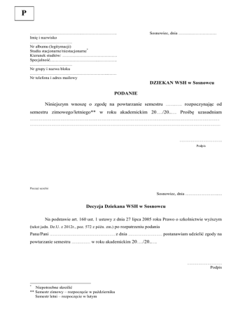 P ……………………………….……………………. Imię i nazwisko ………………………… Nr albumu (legitymacji) Studia stacjonarne/niestacjonarne* Kierunek studiów: ………………………………… Specjalność……………………………..…………. ………………………… Nr grupy i nazwa bloku ………………………………………………..…… Nr telefonu i adres mailowy Sosnowiec, dnia ……………………… DZIEKAN WSH w Sosnowcu PODANIE Niniejszym wnoszę o zgodę na powtarzanie semestru ……..……. rozpoczynając od semestru zimowego/letniego** w roku akademickim 20….../20..….. Prośbę uzasadniam …………………………………………………………………………………………………………………………………………………… ………………………………………………………………………………………………………………………………………….………… ……………………………….. Podpis Pieczęć uczelni Sosnowiec, dnia ………………………..…. Decyzja Dziekana WSH w Sosnowcu Na podstawie art. 160 ust. 1 ustawy z dnia 27 lipca 2005 roku Prawo o szkolnictwie wyższym (tekst jedn. Dz.U. z 2012r., poz. 572 z późn. zm.) po rozpatrzeniu podania Pana/Pani …………………………………………………. z dnia ………………………… postanawiam udzielić zgody na powtarzanie semestru …….………. w roku akademickim 20….../20..….. …………………………. Podpis * Niepotrzebne skreślić ** Semestr zimowy – rozpoczęcie w październiku Semestr letni – rozpoczęcie w lutym P Sosnowiec, dnia ………………………..…. Decyzja Dziekana WSH w Sosnowcu Na podstawie art. 160 ust. 1 ustawy z dnia 27 lipca 2005 roku Prawo o szkolnictwie wyższym (tekst jedn. Dz.U. z 2012r., poz. 572 z późn. zm.) po rozpatrzeniu podania Pana/Pani ……………………………………………... z dnia ………………………… postanawiam udzielić zgody na powtarzanie semestru …….………. w roku akademickim 20….../20..….. …………………………. Podpis …………………………….…………….….. Potwierdzam odbiór (data i podpis)