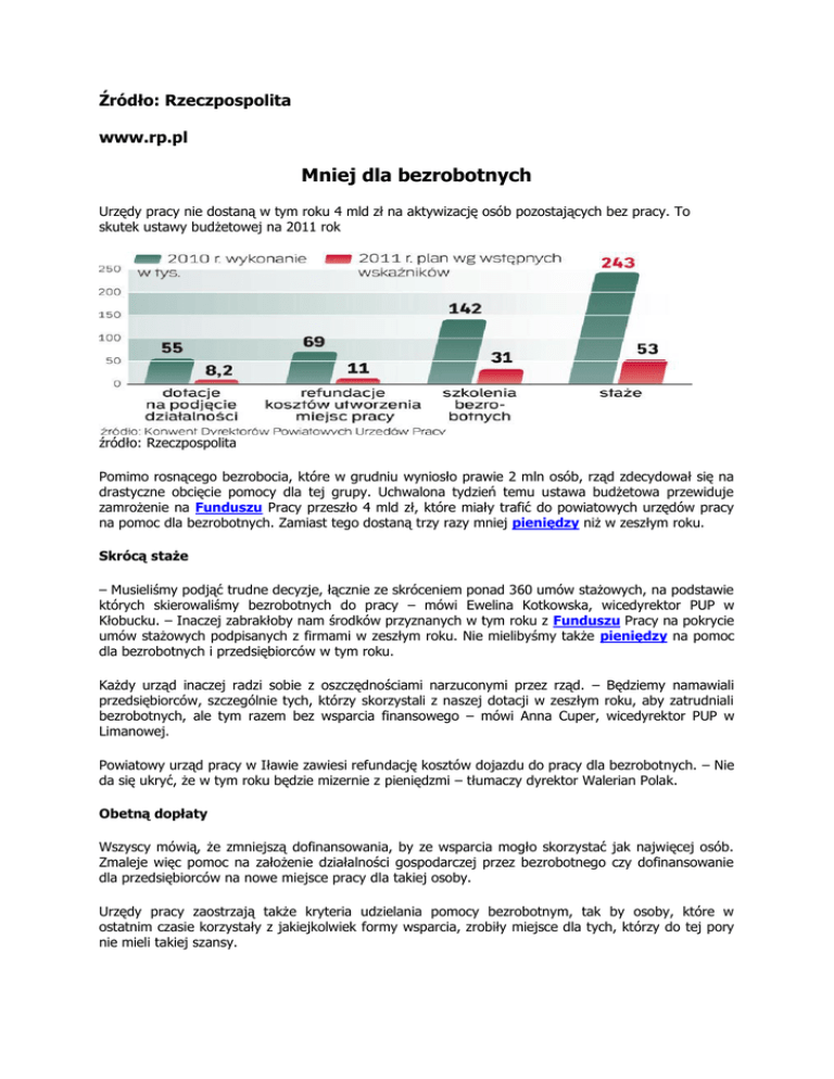 Źródło: Rzeczpospolita www.rp.pl Mniej dla bezrobotnych Urzędy pracy nie dostaną w tym roku 4 mld zł na aktywizację osób pozostających bez pracy. To skutek ustawy budżetowej na 2011 rok źródło: Rzeczpospolita Pomimo rosnącego bezrobocia, które w grudniu wyniosło prawie 2 mln osób, rząd zdecydował się na drastyczne obcięcie pomocy dla tej grupy. Uchwalona tydzień temu ustawa budżetowa przewiduje zamrożenie na Funduszu Pracy przeszło 4 mld zł, które miały trafić do powiatowych urzędów pracy na pomoc dla bezrobotnych. Zamiast tego dostaną trzy razy mniej pieniędzy niż w zeszłym roku. Skrócą staże – Musieliśmy podjąć trudne decyzje, łącznie ze skróceniem ponad 360 umów stażowych, na podstawie których skierowaliśmy bezrobotnych do pracy – mówi Ewelina Kotkowska, wicedyrektor PUP w Kłobucku. – Inaczej zabrakłoby nam środków przyznanych w tym roku z Funduszu Pracy na pokrycie umów stażowych podpisanych z firmami w zeszłym roku. Nie mielibyśmy także pieniędzy na pomoc dla bezrobotnych i przedsiębiorców w tym roku. Każdy urząd inaczej radzi sobie z oszczędnościami narzuconymi przez rząd. – Będziemy namawiali przedsiębiorców, szczególnie tych, którzy skorzystali z naszej dotacji w zeszłym roku, aby zatrudniali bezrobotnych, ale tym razem bez wsparcia finansowego – mówi Anna Cuper, wicedyrektor PUP w Limanowej. Powiatowy urząd pracy w Iławie zawiesi refundację kosztów dojazdu do pracy dla bezrobotnych. – Nie da się ukryć, że w tym roku będzie mizernie z pieniędzmi – tłumaczy dyrektor Walerian Polak. Obetną dopłaty Wszyscy mówią, że zmniejszą dofinansowania, by ze wsparcia mogło skorzystać jak najwięcej osób. Zmaleje więc pomoc na założenie działalności gospodarczej przez bezrobotnego czy dofinansowanie dla przedsiębiorców na nowe miejsce pracy dla takiej osoby. Urzędy pracy zaostrzają także kryteria udzielania pomocy bezrobotnym, tak by osoby, które w ostatnim czasie korzystały z jakiejkolwiek formy wsparcia, zrobiły miejsce dla tych, którzy do tej pory nie mieli takiej szansy. – Ministerstwo Finansów, proponując cięcia, przedstawiło wyliczenia, że dzięki pieniądzom z urzędów pracy w ostatnich latach udało się stworzyć kilkaset tysięcy miejsc pracy – mówi Jerzy Bartnicki, dyrektor PUP w Kwidzynie, przewodniczący rady forum dyrektorów powiatowych urzędów pracy. – Decyzja rządu o obcięciu środków finansowych to krótkowzroczne myślenie mogące spowodować wzrost bezrobocia, z którego będziemy wychodzili przez kilka następnych lat – dodaje. Mateusz Rzemek