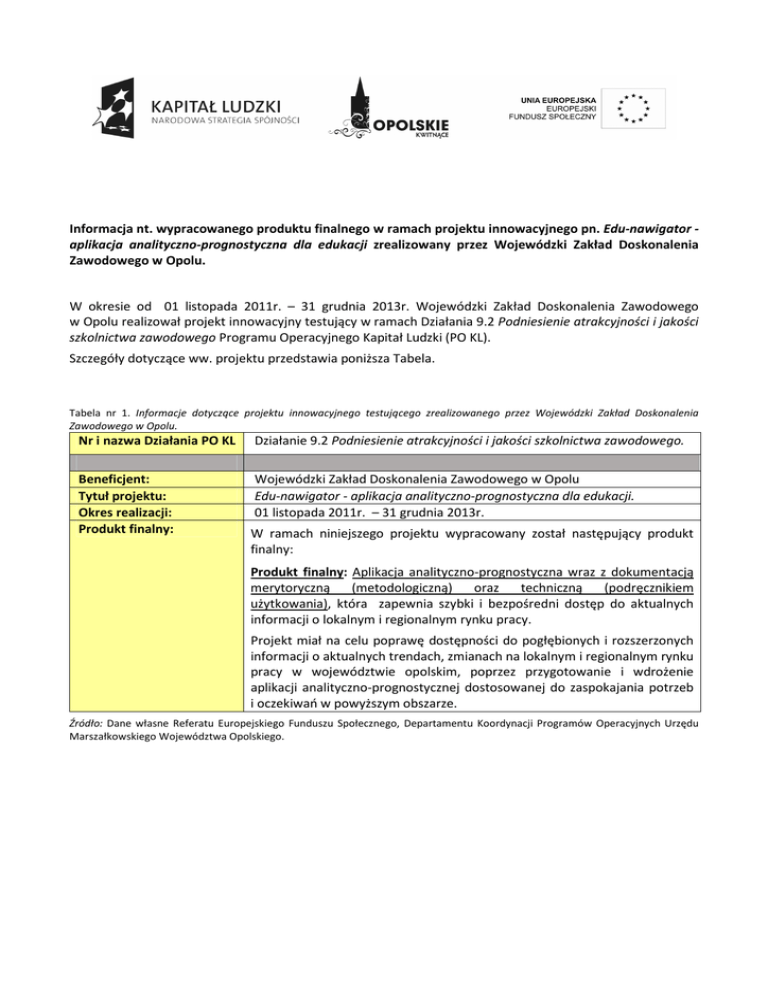 Informacja nt. wypracowanego produktu finalnego w ramach projektu innowacyjnego pn. Edu-nawigator aplikacja analityczno-prognostyczna dla edukacji zrealizowany przez Wojewódzki Zakład Doskonalenia Zawodowego w Opolu. W okresie od 01 listopada 2011r. – 31 grudnia 2013r. Wojewódzki Zakład Doskonalenia Zawodowego w Opolu realizował projekt innowacyjny testujący w ramach Działania 9.2 Podniesienie atrakcyjności i jakości szkolnictwa zawodowego Programu Operacyjnego Kapitał Ludzki (PO KL). Szczegóły dotyczące ww. projektu przedstawia poniższa Tabela. Tabela nr 1. Informacje dotyczące projektu innowacyjnego testującego zrealizowanego przez Wojewódzki Zakład Doskonalenia Zawodowego w Opolu. Nr i nazwa Działania PO KL Działanie 9.2 Podniesienie atrakcyjności i jakości szkolnictwa zawodowego. Beneficjent: Tytuł projektu: Okres realizacji: Produkt finalny: Wojewódzki Zakład Doskonalenia Zawodowego w Opolu Edu-nawigator - aplikacja analityczno-prognostyczna dla edukacji. 01 listopada 2011r. – 31 grudnia 2013r. W ramach niniejszego projektu wypracowany został następujący produkt finalny: Produkt finalny: Aplikacja analityczno-prognostyczna wraz z dokumentacją merytoryczną (metodologiczną) oraz techniczną (podręcznikiem użytkowania), która zapewnia szybki i bezpośredni dostęp do aktualnych informacji o lokalnym i regionalnym rynku pracy. Projekt miał na celu poprawę dostępności do pogłębionych i rozszerzonych informacji o aktualnych trendach, zmianach na lokalnym i regionalnym rynku pracy w województwie opolskim, poprzez przygotowanie i wdrożenie aplikacji analityczno-prognostycznej dostosowanej do zaspokajania potrzeb i oczekiwań w powyższym obszarze. Źródło: Dane własne Referatu Europejskiego Funduszu Społecznego, Departamentu Koordynacji Programów Operacyjnych Urzędu Marszałkowskiego Województwa Opolskiego.
