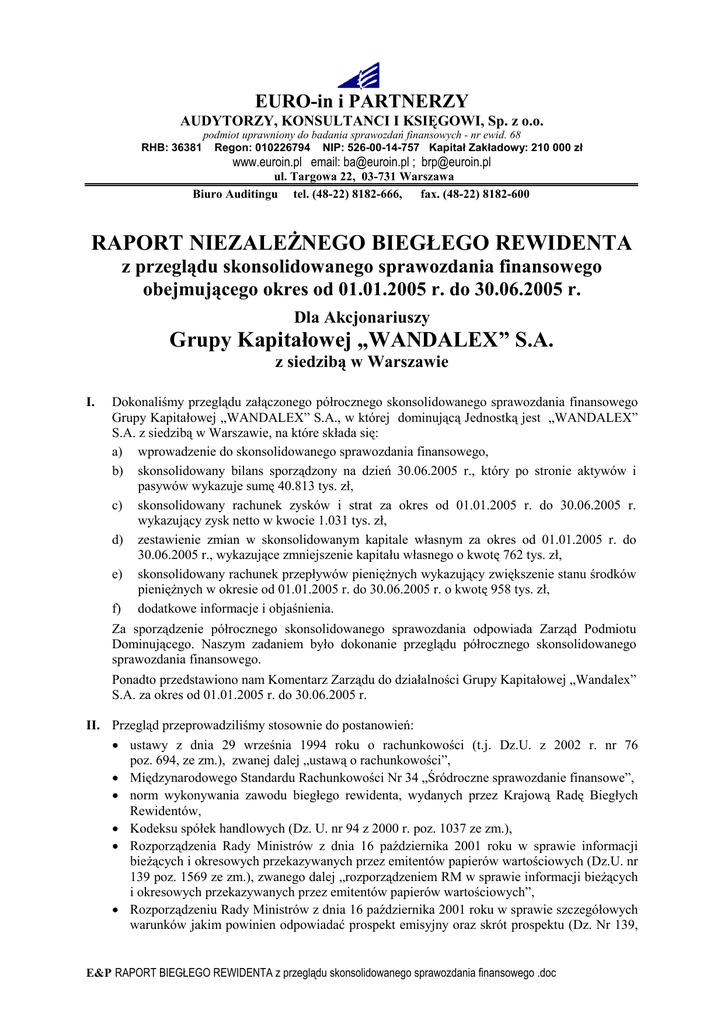 EURO-in i PARTNERZY AUDYTORZY, KONSULTANCI I KSIĘGOWI, Sp. z o.o. RHB: 36381 podmiot uprawniony do badania sprawozdań finansowych - nr ewid. 68 Regon: 010226794 NIP: 526-00-14-757 Kapitał Zakładowy: 210 000 zł www.euroin.pl email: [email protected] ; [email protected] ul. Targowa 22, 03-731 Warszawa Biuro Auditingu tel. (48-22) 8182-666, fax. (48-22) 8182-600 RAPORT NIEZALEŻNEGO BIEGŁEGO REWIDENTA z przeglądu skonsolidowanego sprawozdania finansowego obejmującego okres od 01.01.2005 r. do 30.06.2005 r. Dla Akcjonariuszy Grupy Kapitałowej „WANDALEX” S.A. z siedzibą w Warszawie I. Dokonaliśmy przeglądu załączonego półrocznego skonsolidowanego sprawozdania finansowego Grupy Kapitałowej „WANDALEX” S.A., w której dominującą Jednostką jest „WANDALEX” S.A. z siedzibą w Warszawie, na które składa się: a) wprowadzenie do skonsolidowanego sprawozdania finansowego, b) skonsolidowany bilans sporządzony na dzień 30.06.2005 r., który po stronie aktywów i pasywów wykazuje sumę 40.813 tys. zł, c) skonsolidowany rachunek zysków i strat za okres od 01.01.2005 r. do 30.06.2005 r. wykazujący zysk netto w kwocie 1.031 tys. zł, d) zestawienie zmian w skonsolidowanym kapitale własnym za okres od 01.01.2005 r. do 30.06.2005 r., wykazujące zmniejszenie kapitału własnego o kwotę 762 tys. zł, e) skonsolidowany rachunek przepływów pieniężnych wykazujący zwiększenie stanu środków pieniężnych w okresie od 01.01.2005 r. do 30.06.2005 r. o kwotę 958 tys. zł, f) dodatkowe informacje i objaśnienia. Za sporządzenie półrocznego skonsolidowanego sprawozdania odpowiada Zarząd Podmiotu Dominującego. Naszym zadaniem było dokonanie przeglądu półrocznego skonsolidowanego sprawozdania finansowego. Ponadto przedstawiono nam Komentarz Zarządu do działalności Grupy Kapitałowej „Wandalex” S.A. za okres od 01.01.2005 r. do 30.06.2005 r. II. Przegląd przeprowadziliśmy stosownie do postanowień: • ustawy z dnia 29 września 1994 roku o rachunkowości (t.j. Dz.U. z 2002 r. nr 76 poz. 694, ze zm.), zwanej dalej „ustawą o rachunkowości”, • Międzynarodowego Standardu Rachunkowości Nr 34 „Śródroczne sprawozdanie finansowe”, • norm wykonywania zawodu biegłego rewidenta, wydanych przez Krajową Radę Biegłych Rewidentów, • Kodeksu spółek handlowych (Dz. U. nr 94 z 2000 r. poz. 1037 ze zm.), • Rozporządzenia Rady Ministrów z dnia 16 października 2001 roku w sprawie informacji bieżących i okresowych przekazywanych przez emitentów papierów wartościowych (Dz.U. nr 139 poz. 1569 ze zm.), zwanego dalej „rozporządzeniem RM w sprawie informacji bieżących i okresowych przekazywanych przez emitentów papierów wartościowych”, • Rozporządzeniu Rady Ministrów z dnia 16 października 2001 roku w sprawie szczegółowych warunków jakim powinien odpowiadać prospekt emisyjny oraz skrót prospektu (Dz. Nr 139, E&P RAPORT BIEGŁEGO REWIDENTA z przeglądu skonsolidowanego sprawozdania finansowego .doc Raport z przeglądu półrocznego skonsolidowanego sprawozdania finansowego za okres 01.01.2005 r. do 30.06.2005 r. Grupy Kapitałowej „WANDALEX” S.A. poz. 1568, ze zm.), zwanego dalej „rozporządzeniem RM w sprawie szczegółowych warunków jakim powinien odpowiadać prospekt emisyjny oraz skrót prospektu”, Przeglądu dokonaliśmy głównie drogą analizy danych półrocznego skonsolidowanego sprawozdania finansowego, wglądu w księgi rachunkowe, wykorzystania informacji uzyskanych od Kierownictwa oraz osób odpowiedzialnych za finanse i księgowość Podmiotu Dominującego. Zakres i metoda przeglądu półrocznego skonsolidowanego sprawozdania finansowego istotnie różni się od badań leżących u podstaw opinii wyrażanej o rzetelności, prawidłowości i jasności rocznego sprawozdania finansowego, dlatego nie możemy wydać takiej opinii o załączonym sprawozdaniu. III. Audytorowi nie udostępniono protokołów z posiedzeń Rady Nadzorczej oraz uchwał Rady, w tym – dotyczących wyboru audytora. IV. Z wyjątkiem opisanej wyżej kwestii, dokonany przez nas przegląd półrocznego skonsolidowanego sprawozdania finansowego nie wykazał potrzeby dokonania innych istotnych zmian w załączonym półrocznym skonsolidowanym sprawozdaniu finansowym, aby przedstawiało ono prawidłowo, rzetelnie i jasno sytuację majątkową i finansową Grupy Kapitałowej „Wandalex” S.A. na dzień 30 czerwca 2005 roku oraz jej wynik finansowy za okres od 01.01.2005 r. do 30.06.2005 r., zgodnie z Międzynarodowymi Standardami Rachunkowości, a szczególnie z MSR 34 „ Śródroczne sprawozdanie finansowe ”. V. Zwracamy uwagę Odbiorców niniejszego raportu na okoliczność, iż do sprawozdania finansowego skonsolidowanego Zarząd spółki dominującej nie włączył - z uwagi na nieistotną dla Grupy Kapitałowej wielkość inwestycji - sprawozdania finansowego spółki Wandalex – Ukraina (90 % udziałów), której suma bilansowa wynosi 1.205 tys. zł, wynik finansowy (strata) 23 tys. zł. Warszawa, dnia 21 września 2005 roku. W imieniu EURO-in i PARTNERZY Sp. z o.o. (podmiotu uprawnionego do badania sprawozdań finansowych nr ewid. 68 na liście KIBR) Krystyna ZAJDEL Przeprowadzająca przegląd Biegły rewident nr ewid. 4553/7354 Józef KUSZNERUK PREZES ZARZĄDU Biegły rewident nr ewid. 2086/104 -2E&P RAPORT BIEGŁEGO REWIDENTA z przeglądu skonsolidowanego sprawozdania finansowego .doc EURO-in i PARTNERZY AUDYTORZY, KONSULTANCI I KSIĘGOWI, Sp. z o.o. podmiot uprawniony do badania sprawozdań finansowych - nr ewid. 68 KRS 0000061094 Regon: 010226794 NIP: 526-00-14-757 Kapitał zakładowy 210.000 zł www.euroin.pl email: [email protected] ; [email protected] 03-731 Warszawa, ul. Targowa 22 Biuro Auditingu , tel. (48-22) 8182-666, fax. (48-22) 8182-600 RAPORT Z PRZEGLĄDU PÓŁROCZNEGO SKONSOLIDOWANEGO SPRAWOZDANIA FINANSOWEGO za okres od 01.01.2005 r. do 30.06.2005 r. Grupy Kapitałowej „WANDALEX” S.A. z siedzibą w Warsza