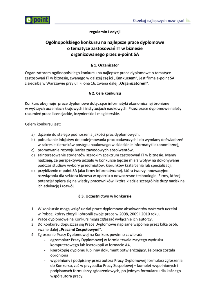 regulamin I edycji Ogólnopolskiego konkursu na najlepsze prace dyplomowe o tematyce zastosowań IT w biznesie organizowanego przez e‐point SA § 1. Organizator Organizatorem ogólnopolskiego konkursu na najlepsze prace dyplomowe o tematyce zastosowań IT w biznesie, zwanego w dalszej części „Konkursem”, jest firma e‐point SA z siedzibą w Warszawie przy ul. Filona 16, zwana dalej „Organizatorem”. § 2. Cele konkursu Konkurs obejmuje prace dyplomowe dotyczące informatyki ekonomicznej bronione w wyższych uczelniach krajowych i instytucjach naukowych. Przez prace dyplomowe należy rozumieć prace licencjackie, inżynierskie i magisterskie. Celem konkursu jest: a) dążenie do stałego podnoszenia jakości prac dyplomowych, b) pobudzanie inicjatyw do podejmowania prac badawczych i do wymiany doświadczeń w zakresie kierunków postępu naukowego w dziedzinie informatyki ekonomicznej, c) promowanie rozwoju karier zawodowych absolwentów, d) zainteresowanie studentów szerokim spektrum zastosowań IT w biznesie. Mamy nadzieję, że perspektywa udziału w konkursie będzie miała wpływ na dokonywane podczas studiów wybory przedmiotów, kierunków kształcenia lub specjalizacji, e) przybliżenie e‐point SA jako firmy informatycznej, która tworzy innowacyjne rozwiązania dla sektora biznesu w oparciu o nowoczesne technologie. Firmy, której potencjał opiera się na wiedzy pracowników i która kładzie szczególnie duży nacisk na ich edukację i rozwój. § 3. Uczestnictwo w konkursie 1. W konkursie mogą wziąć udział prace dyplomowe absolwentów wyższych uczelni w Polsce, którzy złożyli i obronili swoje prace w 2008, 2009 i 2010 roku, 2. Prace dyplomowe na Konkurs mogą zgłaszać wyłącznie ich autorzy, 3. Do Konkursu dopuszcza się Prace Dyplomowe napisane wspólnie przez kilka osób, zwane dalej „Pracami Zespołowymi”. 4. Zgłoszenie Pracy Dyplomowej na Konkurs powinno zawierać: - egzemplarz Pracy Dyplomowej w formie trwale zszytego wydruku komputerowego lub kserokopii w formacie A4, - kserokopię dyplomu lub inny dokument potwierdzający, że praca została obroniona - wypełniony i podpisany przez autora Pracy Dyplomowej formularz zgłoszenia do Konkursu, zaś w przypadku Pracy Zespołowej – komplet wypełnionych i podpisanych formularzy zgłoszeniowych, po jednym formularzu dla każdego współautora pracy. 5. Zgłoszenie Pracy Dyplomowej na Konkurs powinno nastąpić najpóźniej do 30 listopada 2010 r. włącznie (obowiązuje data nadania). 6. Zgłoszenie do Konkursu należy przesłać na adres Organizatora: e‐point SA, ul. Filona 16, 02‐658 Warszawa § 4. Nagrody i wyróżnienia 1. W Konkursie przewidziane są następujące nagrody: 7000 zł brutto – za zajęcie I miejsca, 5000 zł brutto – za zajęcie II miejsca, 3000 zł brutto – za zajęcie III miejsca. 2. Nagroda przyznana za Pracę Zespołową zostanie podzielona w równych częściach pomiędzy wszystkich współautorów. 3. Organizator zastrzega sobie prawo do nieprzyznania poszczególnych nagród w przypadku, gdy Prace Dyplomowe nadesłane do Konkursu nie będą spełniać oczekiwań merytorycznych. § 5. Ogłoszenie wyników i przekazanie nagród 1. Wyniki Konkursu zostaną ogłoszone najpóźniej do dnia 10 stycznia 2011 r. 2. Ogłoszenie wyników Konkursu nastąpi w drodze publikacji komunikatu na stronie serwisu internetowego Organizatora pod adresem www.e‐point.pl/konkurs. 3. Niezwłocznie po ogłoszeniu wyników Konkursu Organizator wyśle pocztą elektroniczną do wszystkich uczestników stosowne zawiadomienia. 4. Nagrody, o których mowa w § 4, zostaną przekazane w ciągu 21 dni od daty ogłoszenia wyników Konkursu na wskazane przez laureatów rachunki bankowe, po potrąceniu należnego podatku. § 6. Kwestie prawne 1. Prace Dyplomowe udostępnione Organizatorowi będą wykorzystywane tylko i wyłącznie w celu wyłonienia laureatów Konkursu. W sprawie ewentualnego wykorzystania rozwiązań prezentowanych w tych pracach prowadzone będą oddzielne rozmowy. 2. Organizator zobowiązany jest do nieprzekazywania i niepublikowania Prac Dyplomowych w całości ani w części, zgodnie z obowiązującą ustawą o prawie autorskim i prawach pokrewnych (Dz.U. Nr 24, poz. 83, z póź. zm.). 3. Organizator zastrzega sobie prawo do publikowania imion, nazwisk, zdjęć i informacji o laureatach Konkursu, a także informacji o tematyce nagrodzonych Prac Dyplomowych. 4. Wszelkie materiały związane z Konkursem przekazane Organizatorowi przez laureatów nie podlegają zwrotowi. 5. Każdy uczestnik Konkursu poprzez przystąpienie do niego oraz podpisanie zgody na przetwarzanie danych osobowych akceptuje warunki niniejszego Regulaminu. 6. W przypadku otrzymania przez Organizatora informacji, po lub przed przyznaniem nagrody wskazanej w niniejszym regulaminie, że nagrodzona praca magisterska stanowi plagiat, lub że w jakikolwiek inny sposób zostało naruszone prawo lub postanowienia niniejszego regulaminu, organizatorowi przysługuje prawo do: 1) odmowy przekazania nagrody danemu uczestnikowi; 2) podjęcia decyzji o nie przyznawaniu nagrody w konkursie; 3) w przypadku nagród już przyznanych ‐ odebrania przyznanej nagrody. § 7. Postanowienia końcowe 1. Wszelkie informacje o Konkursie będą publikowane na stronie internetowej Organizatora pod adresem www.e‐point.pl/konkurs. 2. Regulamin Konkursu jest udostępniony na stronie internetowej Organizatora pod adresem www.e‐point.pl/konkurs. 3. Organizator jest uprawniony do zmian postanowień niniejszego Regulaminu. Zmiany Regulaminu wchodzą w życie od dnia ich ogłoszenia na stronie internetowej Organizatora pod adresem www.e‐point.pl/konkurs. 4. We wszystkich sprawach nieuregulowanych w niniejszym Regulaminie mają zastosowanie przepisy Kodeksu Cywilnego, ustawy o ochronie danych osobowych, ustawy o prawie autorskim i prawach pokrewnych.