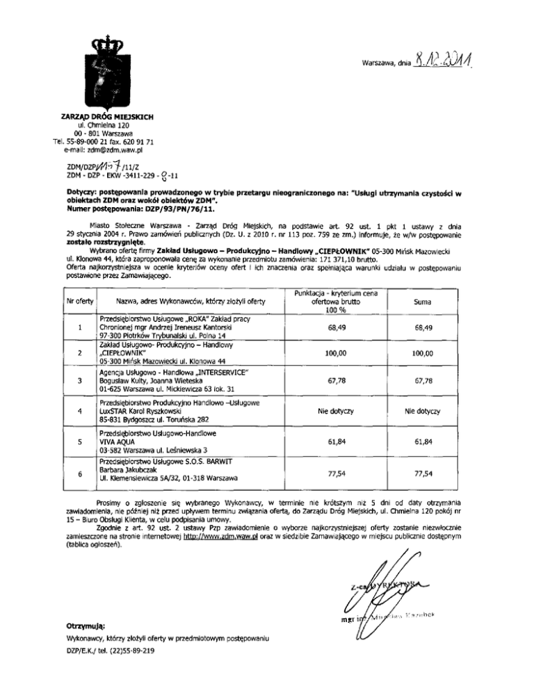 Warszawa, dnia ZARZI\D DR66 MIE3SKICH ul . Chmielna 120 00 - 801 Warszawa Tel . 55-89-000 21 fax . 620 91 71 e-mail : zdm@zdm .waw.p l ZDM/DZP/ 147 I /11/Z ZDM - DZP - EKW -3411-229 - 0-11 Dotyczy : postgpowania prowadzonego w trybie przetargu nieograniczonego na : "Usiugi utrzymania czysto4ci w obiektach ZDM oraz wok6f obiekt6w ZDM" . Numer postcpowania : DZP/93/PN/76/11 . Miasto Stoleczne Warszawa - Zarzkd Drdg Miejskich, na podstawie art . 92 ust . 1 pkt 1 ustawy z dnia 29 stycznia 2004 r . Prawo zamdwieh publicznych (Dz . U . z 2010 r. nr 113 poz . 759 ze zm .) informuje, ze w/w postapowanie zostato rozstrzygnicte . Wybrano ofertQ frmy Zaktad Ustugowo- Produkcyjno - Handlowy,,CIEP&OWNIK" 05-300 Mirisk Mazowiecki ul . Klonowa 44, kt6ra zaproponowata ceng za wykonanie przedmiotu zam6wienia : 171 371,10 brutto . Oferta najkorzystniejsza w ocenie kryteri6w oceny ofert i ich znaczenia oraz spetniaj4ca warunki udzialu w post~powaniu postawione przez Zamawiaj4cego . Nr oferty 1 2 Nazwa, adres Wykonawc6w, kt6rzy ztoiyli oferty Przedsigbiorstwo Usfugowe,,ROKA" Zaktad pracy Chronionej mgr Andrzej Ireneusz Kantorski 97-300 Piotrkdw Trybunalski ul . Polna 14 Zaktad Usjugowo- Produkcyjno - Handlowy ,CIEPtOWNIK" 05-300 Mi6sk Mazowiecki ul . Klonowa 44 3 Agencja Uslugowo - Handlowa „INTERSERVICE" Bogustaw Kulty, Joanna Wieteska 01-625 Warszawa ul . Mickiewicza 63 lok . 31 4 Przedsigbiorstwo Produkcyjno Handlowo -Usfugowe LuxSTAR Karol Ryszkowski 85-831 Bydgoszcz ul . Torunska 282 5 Przedsiabiorstwo Ustugowo-Handlowe VIVA AQUA 03-582 Warszawa ul . Lesniewska 3 6 Przedsigbiorstwo Usfugowe S .O .S. BARWIT Barbara lakubczak UI . Klemensiewicza 5A/32, 01-318 Warszawa Punktacja - kryterium cena ofertowa brutto 100 Suma 68,49 68,49 100,00 100,00 67,78 67,78 Nie dotyczy Nie dotyczy 61,84 61,84 77,54 77,54 Prosimy o zgloszenie sic wybranego Wykonawcy, w terminie nie kr6tszym nii 5 dni od daty otrzymania zawiadomienia, nie p6iniej ni2 przed uptywem terminu zwiazania oferta, do Zarzadu Dr6g Miejskich, ul . Chmielna 120 pok6j nr 15 - Biuro Obslugi Klienta, w celu podpisania umowy . Zgodnie z art . 92 ust . 2 ustawy Pzp zawiadomienie o wyborze najkorzystniejszej oferty zostanie niezwlocznie zamieszczone na stronie internetowej htto ://www .zdm .waw .itl oraz w siedzibie Zamawiajdcego w miejscu publicznie doste<pnym (tablica oglosze6) . Otrzymujd: Wykonawcy, kt6rzy zio yli oferty w przedmiotowym postgpowaniu DZP/E.K./ tel . (22)55-89-219