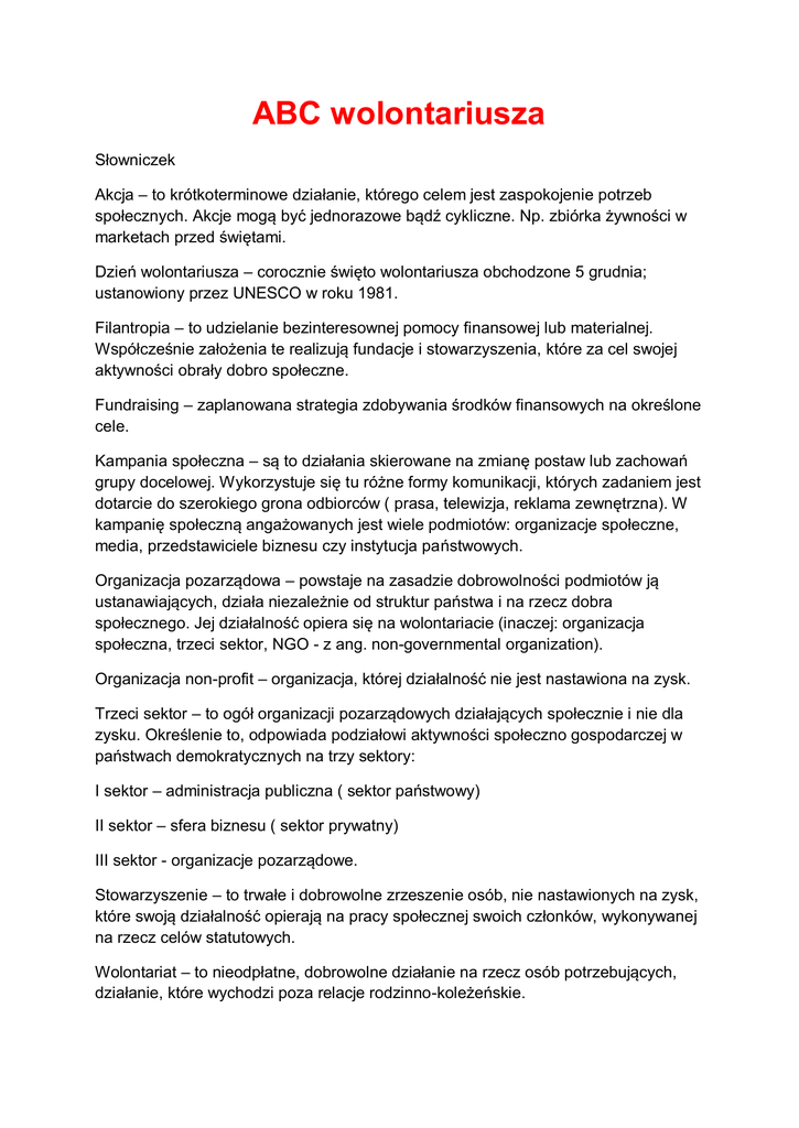 ABC wolontariusza Słowniczek Akcja – to krótkoterminowe działanie, którego celem jest zaspokojenie potrzeb społecznych. Akcje mogą być jednorazowe bądź cykliczne. Np. zbiórka żywności w marketach przed świętami. Dzień wolontariusza – corocznie święto wolontariusza obchodzone 5 grudnia; ustanowiony przez UNESCO w roku 1981. Filantropia – to udzielanie bezinteresownej pomocy finansowej lub materialnej. Współcześnie założenia te realizują fundacje i stowarzyszenia, które za cel swojej aktywności obrały dobro społeczne. Fundraising – zaplanowana strategia zdobywania środków finansowych na określone cele. Kampania społeczna – są to działania skierowane na zmianę postaw lub zachowań grupy docelowej. Wykorzystuje się tu różne formy komunikacji, których zadaniem jest dotarcie do szerokiego grona odbiorców ( prasa, telewizja, reklama zewnętrzna). W kampanię społeczną angażowanych jest wiele podmiotów: organizacje społeczne, media, przedstawiciele biznesu czy instytucja państwowych. Organizacja pozarządowa – powstaje na zasadzie dobrowolności podmiotów ją ustanawiających, działa niezależnie od struktur państwa i na rzecz dobra społecznego. Jej działalność opiera się na wolontariacie (inaczej: organizacja społeczna, trzeci sektor, NGO - z ang. non-governmental organization). Organizacja non-profit – organizacja, której działalność nie jest nastawiona na zysk. Trzeci sektor – to ogół organizacji pozarządowych działających społecznie i nie dla zysku. Określenie to, odpowiada podziałowi aktywności społeczno gospodarczej w państwach demokratycznych na trzy sektory: I sektor – administracja publiczna ( sektor państwowy) II sektor – sfera biznesu ( sektor prywatny) III sektor - organizacje pozarządowe. Stowarzyszenie – to trwałe i dobrowolne zrzeszenie osób, nie nastawionych na zysk, które swoją działalność opierają na pracy społecznej swoich członków, wykonywanej na rzecz celów statutowych. Wolontariat – to nieodpłatne, dobrowolne działanie na rzecz osób potrzebujących, działanie, które wychodzi poza relacje rodzinno-koleżeńskie. Wolontariat pracowniczy – stymulowany i organizowany jest przez pracodawcę. Jest wynikiem popularyzacji idei społecznej odpowiedzialności biznesu. Polega na angażowaniu się pracowników firm w nieodpłatną działalność w na rzecz organizacji społecznych. Wolontariusze, w tym przypadku pracownicy, świadczą różnego rodzaju prace na rzecz osób potrzebujących, wykorzystując swoje umiejętności i zdolności. Darowizna – to przekazanie bezpłatnego świadczenia na rzecz potrzebującego, kosztem swojego majątku. Darowizny mogą dokonywać osoby fizyczne jak i prawne. Przedmiotem darowizny nie może być bezpłatne świadczenie usług. Dotacja – to przekazanie bezzwrotnego wsparcia finansowego, inaczej: grant. Działalność charytatywna – to dobrowolne i dobroczynne działanie, przez które rozumiemy wsparcie zarówno materialne jak i duchowe, skierowane do najuboższych. Dobre Rady dla wolontariuszy Zanim zaangażujesz się w działalność organizacji/zakładu pracy, spróbuj odpowiedzieć sobie na kilka pytań i dobrze się zastanów, co chciałbyś robić, jakie masz ku temu kwalifikacje, ile czasu możesz poświęcić na wolontariat. Dlaczego chcę zostać wolontariuszem ? Musisz wiedzieć, że bycie wolontariuszem wynika z pewnej wrażliwości na troski innych ludzi i świadomości, że istnieją na świecie nierówności, które powodują, że ktoś taki jak TY – WOLONTRIUSZ jest potrzebny. Jednak coraz więcej osób angażuje się w wolontariat nie z potrzeby serca, lecz traktuje go jako start w życie zawodowe, jako element, który będzie dobrze wyglądał w CV. Dobrze się zastanów zanim podejmiesz działalność społeczną. Z kim chcę pracować ? Wielu z Was nie zdaje sobie sprawy, jak wielką odpowiedzialność bierze na siebie angażując się w wolontariat. Kiedy podejmujemy współpracę np. z dziećmi z domu dziecka należy pamiętać, że są to najczęściej dzieci z rodzin patologicznych, z rodzin, które nie wywiązywały się z obowiązków, wskutek czego sąd odebrał im prawa rodzicielskie. Trafiają tam, ponieważ zostały skrzywdzone przez najbliższych. Dla ich prawidłowego rozwoju istotne jest poczucie stabilizacji a co za tym idzie bezpieczeństwa. Dlatego ważne jest abyś zdawał sobie sprawę, jak wielka odpowiedzialność na Tobie spoczywa. Przychodząc do organizacji najlepiej sprecyzuj czy wolisz wykonywać pracę z ludźmi, czy zajęcia biurowoadministracyjne. Twoim potencjalnym podopiecznym nie są potrzebne kolejne rozczarowania. Jeśli chciałbyś pracować z ludźmi, określ się: czy z osobami starszymi, młodzieżą czy dziećmi. Jaki zakres prac w związku z tym chcesz wykonywać: czytanie książek, uzupełnianie braków szkolnych, czy wyprowadzanie psa na spacer. Grupą często korzystającą z pracy wolontariuszy są osoby niepełnosprawne. Zastanów się, czy może to jest grupa, z którą chciałbyś pracować. Dzięki temu szybciej trafisz do odpowiadającej Ci grupy a potencjalny pracodawca będzie miał przekonanie, że kieruje właściwą osobę we właściwe miejsce. Jeśli wolisz pracę w biurze, określ, czym chciałbyś się zajmować: tłumaczeniem tekstów z języka obcego, odbieraniem telefonów, zarządzaniem stroną internetową etc. Co mogę zaoferować ? Przed podjęciem jakiegokolwiek działania, każdy zadaje sobie pytanie: Czy nadaję się do takiej pracy i czy mam odpowiednie kwalifikacje. W wolontariacie najważniejsze są predyspozycje i chęci. Jeśli chcesz pracować z małymi dziećmi nie musisz mieć wykształcenia pedagogicznego, ale musisz je lubić, mieć cierpliwość i umiejętność nawiązania kontaktu z taką grupą. Ile czasu mogę poświęcić na działalność dobroczynną ? Wielu z wolontariuszy to studenci bądź osoby pracujące, dla których wolo
