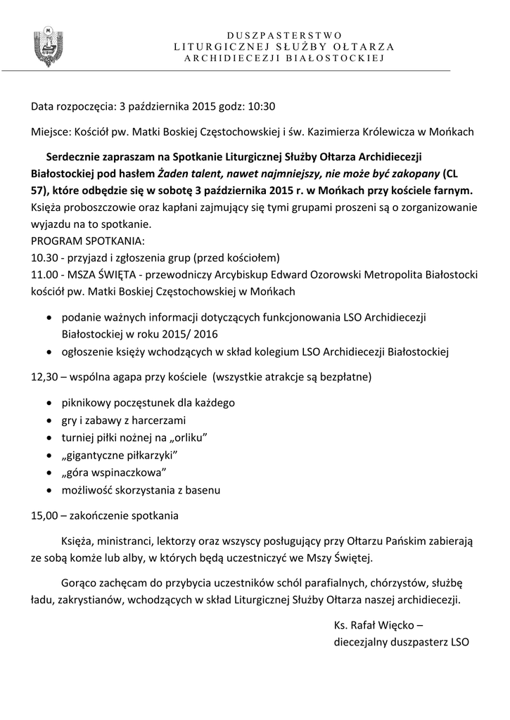 DUSZPASTERSTWO LITURGICZNEJ SŁUŻBY OŁTARZA ARCHIDIECEZJI BIAŁOSTOCKIEJ Data rozpoczęcia: 3 października 2015 godz: 10:30 Miejsce: Kościół pw. Matki Boskiej Częstochowskiej i św. Kazimierza Królewicza w Mońkach Serdecznie zapraszam na Spotkanie Liturgicznej Służby Ołtarza Archidiecezji Białostockiej pod hasłem Żaden talent, nawet najmniejszy, nie może być zakopany (CL 57), które odbędzie się w sobotę 3 października 2015 r. w Mońkach przy kościele farnym. Księża proboszczowie oraz kapłani zajmujący się tymi grupami proszeni są o zorganizowanie wyjazdu na to spotkanie. PROGRAM SPOTKANIA: 10.30 - przyjazd i zgłoszenia grup (przed kościołem) 11.00 - MSZA ŚWIĘTA - przewodniczy Arcybiskup Edward Ozorowski Metropolita Białostocki kościół pw. Matki Boskiej Częstochowskiej w Mońkach podanie ważnych informacji dotyczących funkcjonowania LSO Archidiecezji Białostockiej w roku 2015/ 2016 ogłoszenie księży wchodzących w skład kolegium LSO Archidiecezji Białostockiej 12,30 – wspólna agapa przy kościele (wszystkie atrakcje są bezpłatne) piknikowy poczęstunek dla każdego gry i zabawy z harcerzami turniej piłki nożnej na „orliku” „gigantyczne piłkarzyki” „góra wspinaczkowa” możliwość skorzystania z basenu 15,00 – zakończenie spotkania Księża, ministranci, lektorzy oraz wszyscy posługujący przy Ołtarzu Pańskim zabierają ze sobą komże lub alby, w których będą uczestniczyć we Mszy Świętej. Gorąco zachęcam do przybycia uczestników schól parafialnych, chórzystów, służbę ładu, zakrystianów, wchodzących w skład Liturgicznej Służby Ołtarza naszej archidiecezji. Ks. Rafał Więcko – diecezjalny duszpasterz LSO