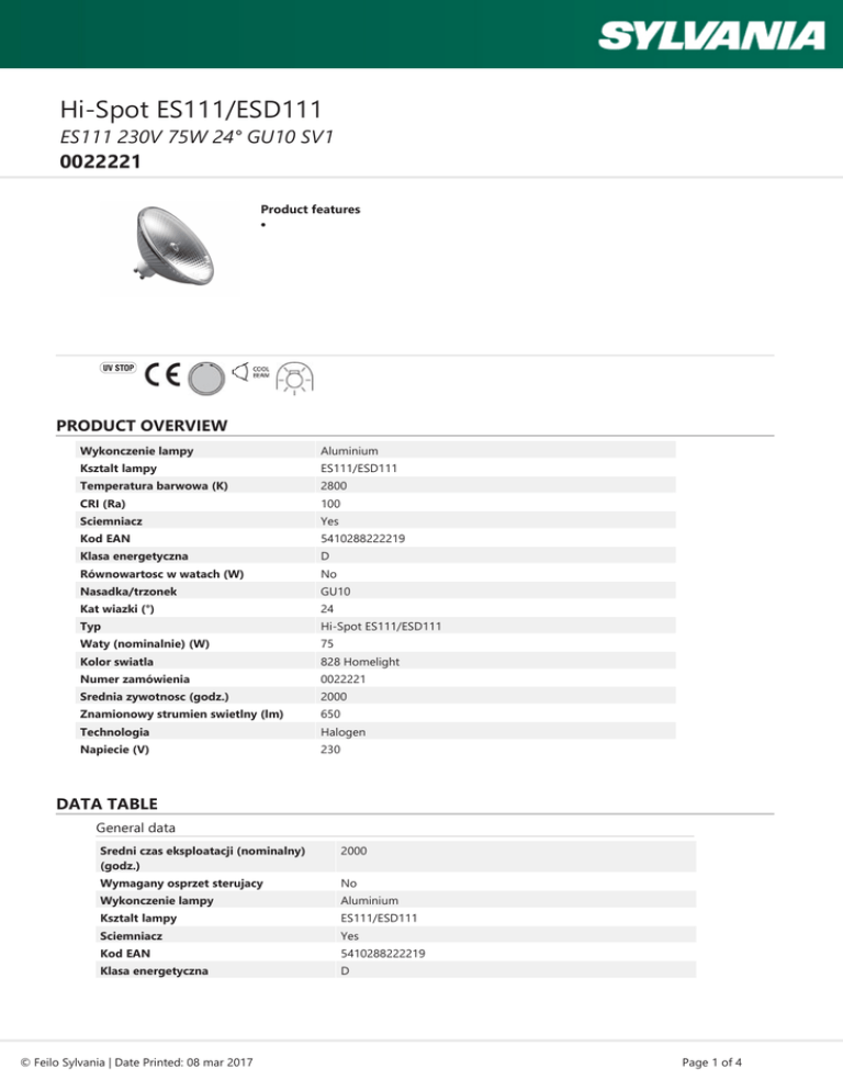 Hi-Spot ES111/ESD111 ES111 230V 75W 24° GU10 SV1 0022221 Product features • PRODUCT OVERVIEW Wykonczenie lampy Aluminium Ksztalt lampy ES111/ESD111 Temperatura barwowa (K) 2800 CRI (Ra) 100 Sciemniacz Yes Kod EAN 5410288222219 Klasa energetyczna D Równowartosc w watach (W) No Nasadka/trzonek GU10 Kat wiazki (°) 24 Typ Hi-Spot ES111/ESD111 Waty (nominalnie) (W) 75 Kolor swiatla 828 Homelight Numer zamówienia 0022221 Srednia zywotnosc (godz.) 2000 Znamionowy strumien swietlny (lm) 650 Technologia Halogen Napiecie (V) 230 DATA TABLE General data Sredni czas eksploatacji (nominalny) (godz.) 2000 Wymagany osprzet sterujacy No Wykonczenie lampy Aluminium Ksztalt lampy ES111/ESD111 Sciemniacz Yes Kod EAN 5410288222219 Klasa energetyczna D © Feilo Sylvania | Date Printed: 08 mar 2017 Page 1 of 4 Hi-Spot ES111/ESD111 ES111 230V 75W 24° GU10 SV1 0022221 Lampa energooszczedna No Ocena oprawy Open Zastosowania ogólne Retail; Hospitality; Museums; Consumer; Residential; Referencja IEC IEC 60357 Referencja 2 IEC IEC 60432-3 Referencja 3 IEC IEC 60630 Przeznaczenie General lighting Nasadka/trzonek GU10 Zawartosc rteci w lampie (mg) 0 Typ Hi-Spot ES111/ESD111 Liczba cykli przelaczania przed przedwczesna awaria (min) >8000 Numer zamówienia 0022221 Nazwa produktu ES111 230V 75W 24° GU10 SV1 Srednia zywotnosc (godz.) 2000 Lampa do zastosowan specjalnych No Czas uruchomienia (maks.) (s) 0 Technologia Halogen Transformator wymagany no Ilosc opakowan sprzedazowych 15 Czas nagrzewania do 60% pelnej jasnosci (maks.) (s) Instant Full Light What temperature Life is measured at (°C): 25 Optical data Temperatura barwowa (K) 2800 CRI (Ra) 100 Kat wiazki (°) 24 Kolor swiatla 828 Homelight Wartosc lumenów pod koniec znamionowego czasu eksploatacji (lm) 80 Znamionowy strumien swietlny (lm) 650 Maksymalna swiatlosc (cd) 3000 Znamionowy strumien swietlny (lm) 650 Do oswietlenia akcentujacego Yes Znamionowy kat wiazki (°) 24 Electrical data Równowartosc w watach (W) No kWh na 1000 godzin swiecenia 75 © Feilo Sylvania | Date Printed: 08 mar 2017 Page 2 of 4 Hi-Spot ES111/ESD111 ES111 230V 75W 24° GU10 SV1 0022221 Czynnik zasilania lampy 1 Waty (nominalnie) (W) 75 Wat (znamionowa) (W) 75 Napiecie (V) 230 Physical data Srednica lampy (mm) — D 110 Dlugosc lampy (mm) — C/L 70 Opis opakowania Box/Sleeve Waga (kg) 0.18 Wymiary zarówki odpowiadajace wymiarom zarówki prózniowej Yes Zaprojektowane do uzytku w niestandardowych warunkach No Outer package dimensions (L x W x H) (cm) 47.50 x 28.00 x 15.00 Single package dimensions (L x W x H) (cm) 8.50 x 8.50 x 11.50 PHOTOMETRY TECHNICAL DRAWINGS © Feilo Sylvania | Date Printed: 08 mar 2017 Page 3 of 4 Hi-Spot ES111/ESD111 ES111 230V 75W 24° GU10 SV1 0022221 © Feilo Sylvania | Date Printed: 08 mar 2017 Page 4 of 4