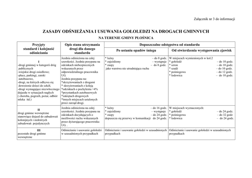 Załącznik nr 3 do informacji ZASADY ODŚNIEŻANIA I USUWANIA GOŁOLEDZI NA DROGACH GMINNYCH NA TERENIE GMINY PŁOŚNICA Przyjęty standard i kolejność odśnieżania Opis stanu utrzymania drogi dla danego standardu Dopuszczalne odstępstwa od standardu Po ustaniu opadów śniegu Od stwierdzenia występowania zjawisk I -drogi gminnej w kategorii dróg publicznych -wiejskie drogi osiedlowe; -place, parkingi, zatoki autobusowe, -drogi, na których odbywa się dowożenie dzieci do szkół, -drogi wymagające niezwłocznego dojazdu w sytuacjach nagłych ( choroba, pogrzeb, pożar, odbiór mleka itd.) Jezdnia odśnieżona na całej szerokości. Jezdnia posypana na odcinkach niebezpiecznych wskazanych przez odpowiedzialnego pracownika UG. Jezdnia posypana na: *skrzyżowaniach z drogami * skrzyżowaniach z koleją *odcinkach o pochyleniu >4% *przystankach autobusowych *zakrętach drogowych *innych miejscach ustalonych przez zarząd drogi. * luźny – do 8 godz. * zajeżdżony – występuje * zaspy – do 8 godz. jako warstwa nie utrudniająca ruchu W miejscach wymienionych w kol.2 * gołoledź * szron * szadź * pośniegowa * lodowica – do 10 godz. – do 10 godz. – do 10 godz. – do 12 godz. – do 10 godz. II drogi gminne wewnętrzne stanowiące dojazd do zabudowań kolonijnych i niektórych zabudowań pojedynczych Jezdnia odśnieżona na całej szerokości. Jezdnia posypana na odcinkach decydujących o możliwości ruchu wskazanych przez dyżurującego pracownika UG. . * luźny – do 16 godz. * zajeżdżony – występuje * zaspy – do 24 godz. dopuszcza się przerwy w komunikacji do 24 godz. W miejscach wyznaczonych: * gołoledź * pośniegowa * lodowica – do 24 godz. – do 32 godz – do 24 godz. Odśnieżanie i usuwanie gołoledzi w uzasadnionych przypadkach Odśnieżanie i usuwanie gołoledzi w uzasadnionych Odśnieżanie i usuwanie gołoledzi w uzasadnionych przypadkach przypadkach III pozostałe drogi gminne wewnętrzne
