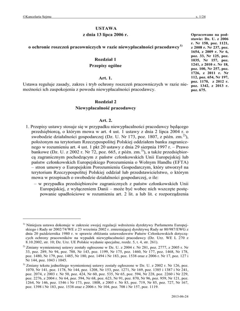 ©Kancelaria Sejmu s. 1/24 USTAWA z dnia 13 lipca 2006 r. o ochronie roszczeń pracowniczych w razie niewypłacalności pracodawcy 1) Rozdział 1 Przepisy ogólne Art. 1. Ustawa reguluje zasady, zakres i tryb ochrony roszczeń pracowniczych w razie niemożności ich zaspokojenia z powodu niewypłacalności pracodawcy. Rozdział 2 Niewypłacalność pracodawcy Art. 2. 1. Przepisy ustawy stosuje się w przypadku niewypłacalności pracodawcy będącego przedsiębiorcą, o którym mowa w art. 4 ust. 1 ustawy z dnia 2 lipca 2004 r. o swobodzie działalności gospodarczej (Dz. U. Nr 173, poz. 1807, z późn. zm.2)), położonym na terytorium Rzeczypospolitej Polskiej oddziałem banku zagranicznego w rozumieniu art. 4 ust. 1 pkt 20 ustawy z dnia 29 sierpnia 1997 r. – Prawo bankowe (Dz. U. z 2002 r. Nr 72, poz. 665, z późn. zm. 3)), a także przedsiębiorcą zagranicznym pochodzącym z państw członkowskich Unii Europejskiej lub państw członkowskich Europejskiego Porozumienia o Wolnym Handlu (EFTA) – stron umowy o Europejskim Porozumieniu Gospodarczym, który utworzył na terytorium Rzeczypospolitej Polskiej oddział lub przedstawicielstwo, o którym mowa w przepisach o swobodzie działalności gospodarczej, o ile: – w przypadku przedsiębiorców zagranicznych z państw członkowskich Unii Europejskiej, z wyłączeniem Danii – może być wobec nich wszczęte postępowanie upadłościowe w rozumieniu art. 2 lit. a lub lit. c rozporządzenia Niniejsza ustawa dokonuje w zakresie swojej regulacji wdrożenia dyrektywy Parlamentu Europejskiego i Rady nr 2002/74/WE z 23 września 2002 r. zmieniającej dyrektywę Rady nr 80/987/EWG z dnia 20 października 1980 r. w sprawie zbliżania ustawodawstw Państw Członkowskich dotyczących ochrony pracowników na wypadek niewypłacalności pracodawcy (Dz. Urz. WE L 270 z 8.10.2002, str. 10; Dz. Urz. UE Polskie wydanie specjalne, rozdz. 5, t. 4, str. 261). 2) Zmiany wymienionej ustawy zostały ogłoszone w Dz. U. z 2004 r. Nr 281, poz. 2777, z 2005 r. Nr 33, poz. 289, Nr 94, poz. 788, Nr 143, poz. 1199, Nr 175, poz. 1460, Nr 177, poz. 1468, Nr 178, poz. 1480, Nr 179, poz. 1485, Nr 180, poz. 1494 i Nr 183, poz. 1538 oraz z 2006 r. Nr 17, poz. 127 i Nr 144, poz. 1043 i 1045. 3) Zmiany tekstu jednolitego wymienionej ustawy zostały ogłoszone w Dz. U. z 2002 r. Nr 126, poz. 1070, Nr 141, poz. 1178, Nr 144, poz. 1208, Nr 153, poz. 1271, Nr 169, poz. 1385 i 1387 i Nr 241, poz. 2074, z 2003 r. Nr 50, poz. 424, Nr 60, poz. 535, Nr 65, poz. 594, Nr 228, poz. 2260 i Nr 229, poz. 2276, z 2004 r. Nr 64, poz. 594, Nr 68, poz. 623, Nr 91, poz. 870, Nr 96, poz. 959, Nr 121, poz. 1264, Nr 146, poz. 1546 i Nr 173, poz. 1808, z 2005 r. Nr 83, poz. 719, Nr 85, poz. 727, Nr 167, poz. 1398 i Nr 183, poz. 1538 oraz z 2006 r. Nr 104, poz. 708 i Nr 157, poz. 1119. 1) 2013-06-24 Opracowano na podstawie: Dz. U. z 2006 r. Nr 158, poz. 1121, z 2008 r. Nr 237, poz. 1654, z 2009 r. Nr 6, poz. 33, Nr 125, poz. 1035, Nr 157, poz. 1241, z 2010 r. Nr 18, poz. 100, Nr 257, poz. 1726, z 2011 r. Nr 112, poz. 654, Nr 197, poz. 1170, z 2012 r. poz. 1342, z 2013 r. poz. 675. ©Kancelaria Sejmu s. 2/24 Rady (WE) nr 1346/2000 z dnia 29 maja 2000 r. w sprawie postępowania upadłościowego 4), – w przypadku przedsiębiorców zagranicznych z Danii i państw członkowskich Europejskiego Porozumienia o Wolnym Handlu (EFTA) – stron umowy o Europejskim Porozumieniu Gospodarczym – może być wobec nich uznane główne zagraniczne postępowanie upadłościowe, o którym mowa w przepisach ustawy z dnia 28 lutego 2003 r. – Prawo upadłościowe i naprawcze (Dz. U. Nr 60, poz. 535, z późn. zm. 5)) dotyczących międzynarodowego postępowania upadłościowego, – w przypadku przedsiębiorców prowadzących działalność gospodarczą na terytorium Rzeczypospolitej Polskiej, a także oddziałów banków zagranicznych – odrębne przepisy nie wyłączają możliwości ogłoszenia na terytorium Rzeczypospolitej Polskiej upadłości takiego pracodawcy, – w przypadku przedsiębiorców zagranicznych z państw członkowskich Unii Europejskiej i państw członkowskich Europejskiego Porozumienia o Wolnym Handlu (EFTA) – stron umowy o Europejskim Porozumieniu Gospodarczym działających na terenie Rzeczypospolitej Polskiej jako oddział instytucji kredytowej lub zakładu ubezpieczeń – może zostać wszczęte wobec instytucji kredytowej lub zakładu ubezpieczeń postępowanie upadłościowe, postępowanie układowe lub inne podobne postępowanie, i jednocześnie zatrudnia, zgodnie z przepisami polskiego prawa, co najmniej jedną osobę fizyczną w związku z prowadzoną na terytorium Rzeczypospolitej Polskiej działalnością gospodarczą lub działalnością przedstawicielstwa. 2. Niewypłacalność pracodawcy, o której mowa w ust. 1, nie zachodzi w odniesieniu do osób prawnych podlegających obowiązkowi wpisu do rejestru stowarzyszeń, innych organizacji społecznych i zawodowych, fundacji oraz samodzielnych publicznych zakładów opieki zdrowotnej, o którym mowa w rozdziale 3 ustawy z dnia 20 sierpnia 1997 r. o Krajowym Rejestrze Sądowym (Dz. U. z 2007 r. Nr 168, poz. 1186, z późn. zm. 6)), wpisanych do rejestru przedsiębiorców z tytułu wykonywania działalności gospodarczej, jednostek zaliczanych, na podstawie odrębnych przepisów, do sektora finansów publicznych, a także osób fizycznych prowadzących gospodarstwo domowe zatrudniających osoby wykonujące pracę zarobkową w tym gospodarstwie. Art. 3. 1. Niewypłacalność pracodawcy, o którym mowa w art. 2 ust. 1, zachodzi, gdy sąd upadłościowy, na podstawie przepisów Prawa upadłościowego i naprawczego, wyda postanowienie o: 1) ogłoszeniu upadłości pracodawcy obejmującej likwidację majątku dłużnika; 2) ogłoszeniu upadłości pracodawcy z możliwością zawarcia układu; Wymienione rozporządzenie zostało opublikowane w Dz. Urz. WE L 160 z 30.06.2000, str. 1, z późn. zm.; Dz. Urz. UE Polskie wydanie specja