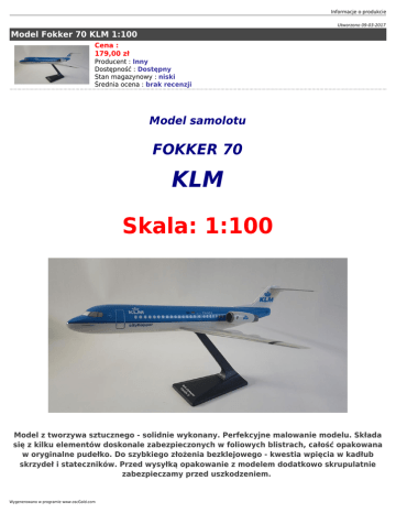 Informacje o produkcie Utworzono 09-03-2017 Model Fokker 70 KLM 1:100 Cena : 179,00 zł Producent : Inny Dostępność : Dostępny Stan magazynowy : niski Średnia ocena : brak recenzji Model samolotu FOKKER 70 KLM Skala: 1:100 Model z tworzywa sztucznego - solidnie wykonany. Perfekcyjne malowanie modelu. Składa się z kilku elementów doskonale zabezpieczonych w foliowych blistrach, całość opakowana w oryginalne pudełko. Do szybkiego złożenia bezklejowego - kwestia wpięcia w kadłub skrzydeł i stateczników. Przed wysyłką opakowanie z modelem dodatkowo skrupulatnie zabezpieczamy przed uszkodzeniem. Wygenerowano w programie www.oscGold.com Długość: 31 cm Rozpiętość skrzydeł: 28 cm PRODUCENT - LONG PROSPER! Informacje o produkcie SUPER JAKOŚĆ! Wygenerowano w programie www.oscGold.com Informacje o produkcie Wygenerowano w programie www.oscGold.com
