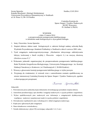 Iwona Sprawka Katedra Biochemii i Biologii Molekularnej Uniwersytet Przyrodniczo-Humanistyczny w Siedlcach ul. B. Prusa 12, 08-110 Siedlce Siedlce,12.03.2014 Centralna Komisja do Spraw Stopni i Tytułów Naukowych 00-901 Warszawa Pl. Defilad 1( PKiN) WNIOSEK z dnia 12 marca 2014 o przeprowadzenie postępowania habilitacyjnego w dziedzinie nauk biologicznych w dyscyplinie biologia 1. Imię i Nazwisko: Iwona Sprawka 2. Stopień doktora: doktor nauk biologicznych w zakresie biologii nadany uchwałą Rady Wydziału Przyrodniczego Akademii Podlaskiej w Siedlcach a dnia 6 czerwca 2001 roku. 3. Tytuł osiągnięcia naukowego/artystycznego ,,Mechanizm toksycznego oddziaływania lektyny izolowanej z fasoli zwykłej ( Phaseolus vulgaris L.) na mszycę zboŜową (Sitobion avenae F.)’’ 4. Wskazanie jednostki organizacyjnej do przeprowadzenia postępowania habilitacyjnego: Rada Wydziału Geograficzno-Biologicznego, Uniwersytetu Pedagogicznego im. Komisji Edukacji Narodowej w Krakowie ( ul. PodchorąŜych 2, 30-084 Kraków) 5. Wnoszę o głosowanie komisji postępowania habilitacyjnego w trybie jawnym. 6. Przyjmuję do wiadomości, iŜ wniosek wraz z autoreferatem zostanie opublikowany na stronie internetowej Centralnej Komisji do Spraw Stopni i Tytułów Naukowych, zgodnie z obowiązującymi przepisami. Załączniki: 1. Poświadczona przez jednostkę kopia dokumentu stwierdzającego posiadanie stopnia doktora. 2. Autoreferat przedstawiający opis dorobku i osiągnięć naukowych ( w języku polskim i angielskim). 3. Wykaz opublikowanych prac naukowych oraz informacja o osiągnięciach dydaktycznych, współpracy naukowej i popularyzacji nauki (w języku polskim i angielskim). 4. Oświadczenia współautorów prac wchodzących w skład osiągnięcia naukowego. 5. Kopie prac zgłoszonych jako osiągnięcie. 6. Dane teleadresowe wnioskodawcy 7. Nośnik elektroniczny ( płyta CD) zawierający załączniki 1-6 ( 2 szt.)