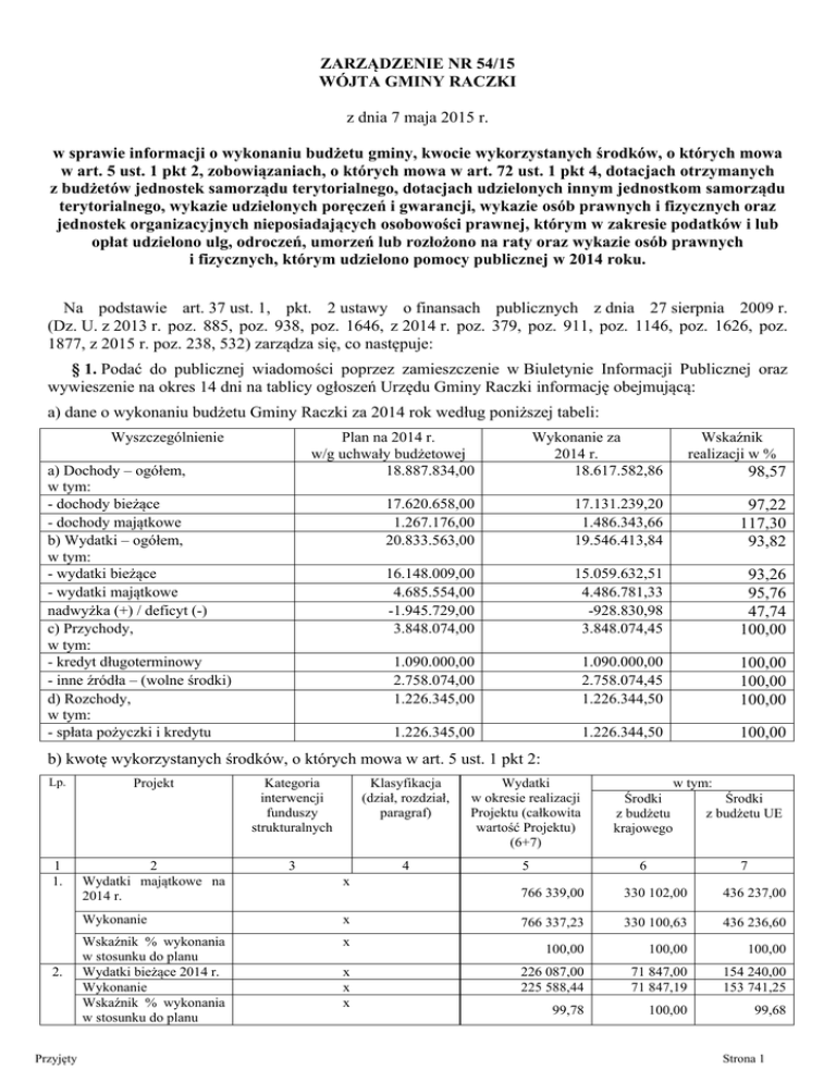 ZARZĄDZENIE NR 54/15 WÓJTA GMINY RACZKI z dnia 7 maja 2015 r. w sprawie informacji o wykonaniu budżetu gminy, kwocie wykorzystanych środków, o których mowa w art. 5 ust. 1 pkt 2, zobowiązaniach, o których mowa w art. 72 ust. 1 pkt 4, dotacjach otrzymanych z budżetów jednostek samorządu terytorialnego, dotacjach udzielonych innym jednostkom samorządu terytorialnego, wykazie udzielonych poręczeń i gwarancji, wykazie osób prawnych i fizycznych oraz jednostek organizacyjnych nieposiadających osobowości prawnej, którym w zakresie podatków i lub opłat udzielono ulg, odroczeń, umorzeń lub rozłożono na raty oraz wykazie osób prawnych i fizycznych, którym udzielono pomocy publicznej w 2014 roku. Na podstawie art. 37 ust. 1, pkt. 2 ustawy o finansach publicznych z dnia 27 sierpnia 2009 r. (Dz. U. z 2013 r. poz. 885, poz. 938, poz. 1646, z 2014 r. poz. 379, poz. 911, poz. 1146, poz. 1626, poz. 1877, z 2015 r. poz. 238, 532) zarządza się, co następuje: § 1. Podać do publicznej wiadomości poprzez zamieszczenie w Biuletynie Informacji Publicznej oraz wywieszenie na okres 14 dni na tablicy ogłoszeń Urzędu Gminy Raczki informację obejmującą: a) dane o wykonaniu budżetu Gminy Raczki za 2014 rok według poniższej tabeli: Wyszczególnienie a) Dochody – ogółem, w tym: - dochody bieżące - dochody majątkowe b) Wydatki – ogółem, w tym: - wydatki bieżące - wydatki majątkowe nadwyżka (+) / deficyt (-) c) Przychody, w tym: - kredyt długoterminowy - inne źródła – (wolne środki) d) Rozchody, w tym: - spłata pożyczki i kredytu Plan na 2014 r. w/g uchwały budżetowej 18.887.834,00 Wykonanie za 2014 r. 18.617.582,86 Wskaźnik realizacji w % 17.620.658,00 1.267.176,00 20.833.563,00 17.131.239,20 1.486.343,66 19.546.413,84 97,22 117,30 93,82 16.148.009,00 4.685.554,00 -1.945.729,00 3.848.074,00 15.059.632,51 4.486.781,33 -928.830,98 3.848.074,45 93,26 95,76 47,74 100,00 1.090.000,00 2.758.074,00 1.226.345,00 1.090.000,00 2.758.074,45 1.226.344,50 100,00 100,00 100,00 1.226.345,00 1.226.344,50 100,00 98,57 b) kwotę wykorzystanych środków, o których mowa w art. 5 ust. 1 pkt 2: Lp. 1 1. 2. Przyjęty Projekt 2 Wydatki majątkowe na 2014 r. Kategoria interwencji funduszy strukturalnych 3 x Wykonanie x Wskaźnik % wykonania w stosunku do planu Wydatki bieżące 2014 r. Wykonanie Wskaźnik % wykonania w stosunku do planu x x x x Klasyfikacja (dział, rozdział, paragraf) Wydatki w okresie realizacji Projektu (całkowita wartość Projektu) (6+7) Środki z budżetu krajowego w tym: Środki z budżetu UE 4 5 6 7 766 339,00 330 102,00 436 237,00 766 337,23 330 100,63 436 236,60 100,00 100,00 100,00 226 087,00 225 588,44 71 847,00 71 847,19 154 240,00 153 741,25 99,78 100,00 99,68 Strona 1 1.1 Program: Priorytet: Działanie: Nazwa projektu: Razem wydatki: 1.2 z tego: 2014 r. Wykonanie Wskaźnik % wykonania w stosunku do planu Program: Priorytet: Działanie: Nazwa projektu: Razem wydatki: 1.3 z tego: 2014 r. Wykonanie Wskaźnik % wykonania w stosunku do planu Program: Priorytet: Działanie: Nazwa projektu: Razem wydatki: 2.1 2.2 z tego: 2014 r. Wykonanie Wskaźnik % wykonania w stosunku do planu Program: Priorytet: Działanie: Nazwa projektu: Razem wydatki: z tego: 2014 r. Wykonanie Wskaźnik % wykonania w stosunku do planu Program: Priorytet: Działanie: Nazwa projektu: Razem wydatki: 2.3 z tego: 2014 r. Wykonanie Wskaźnik % wykonania w stosunku do planu Program: Priorytet: Działanie: Przyjęty Program Operacyjny „Zrównoważony rozwój sektora rybołówstwa i nadbrzeżnych obszarów rybackich 2007-2013” IV. Zrównoważony rozwój obszarów zależnych od rybactwa 4.1 Rozwój obszarów zależnych od rybactwa z wyłączeniem realizacji operacji polegających na funkcjonowaniu lokalnej grupy rybackiej (LGR) oraz nabywaniu umiejętności i aktywizacji lokalnych społeczności Budowa przystani kajakowej wraz z małą infrastrukturą turystyczną, punktem widokowym i drogą dojazdową w miejscowości Sidory 630 63003 628 962,00 307 864,00 321 098,00 §6057, §6059 majątkowe 497 962,00 239 872,00 258 090,00 x 497 961,30 239 871,70 258 089,60 x 100,00 100,00 100,00 Program Rozwoju Obszarów Wiejskich na lata 2007-2013” 4 LEADER 413 „Wdrażanie lokalnych strategii rozwoju” dla operacji, które odpowiadają warunkom przyznania pomocy w ramach działania „Odnowa i rozwój wsi” Modernizacja boiska wielofunkcyjnego wraz z wykonaniem „siłowni pod chmurką” w Raczkach 926 92695 205 113,00 80 516,00 124 597,00 §6057, §6059 majątkowe 197 752,00 73 155,00 124 597,00 x 197 751,48 73 154,48 124 597,00 x 100,00 100,00 100,00 Program Operacyjny Kapitał Ludzki IX Rozwój wykształcenia i kompetencji w regionach 9.1 Wyrównanie szans edukacyjnych i zapewnienie wysokiej jakości usług świadczonych w systemie oświaty „Czas na innowacyjne przedszkola” 801 80106 187 917,00 38 400,00 149 517,00 §6057, §6059 majątkowe 70 625,00 17 075,00 53 550,00 x 70 624,45 17 074,45 53 550,00 x 100,00 100,00 100,00 Program Operacyjny Innowacyjna Gospodarka 8. Społeczeństwo informacyjne – zwiększenie innowacyjności gospodarki 8.3 Przeciwdziałanie wykluczeniu cyfrowemu – e-Inclusion „Suwalski internet równych szans” 852 85295 463 403,00 128 593,00 §4307, §4309 §4357, §4359 bieżące 4 285,00 1 189,00 x 4 285,20 1 189,14 x 100,00 100,01 334 810,00 3 096,00 3 096,06 100,00 Program Operacyjny Kapitał Ludzki IX Rozwój wykształcenia i kompetencji w regionach 9.1 Wyrównanie szans edukacyjnych i zapewnienie wysokiej jakości usług świadczonych w systemie oświaty „Czas na innowacyjne przedszkola” 801 80106 §4217, §4219 187 917,00 38 400,00 149 517,00 §4247, §4249 bieżące 117 292,00 21 325,00 95 967,00 x 116 795,74 21 324,74 95 471,00 x 99,58 100,00 99,48 Program Operacyjny „Zrównoważony rozwój sektora rybołówstwa i nadbrzeżnych obszarów rybackich 2007-2013” IV. Zrównoważony rozwój obszarów zależnych od rybactwa 4.1 Rozwój obszar