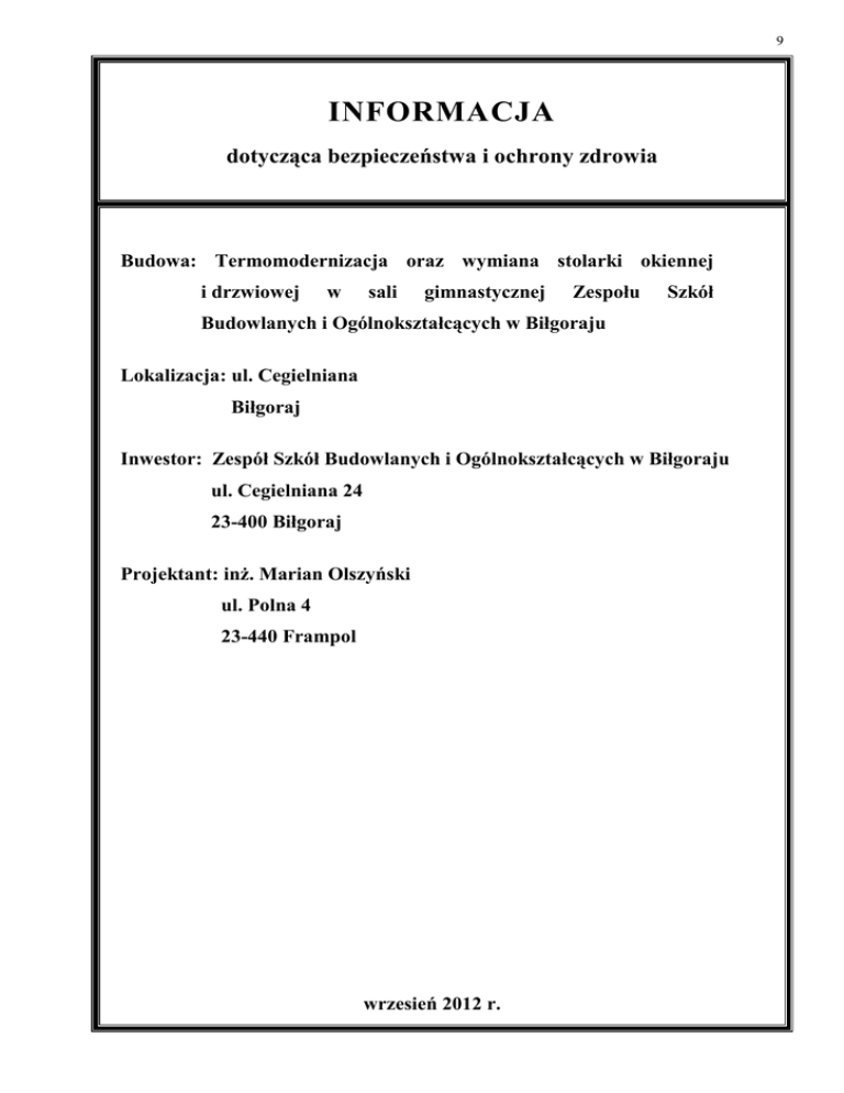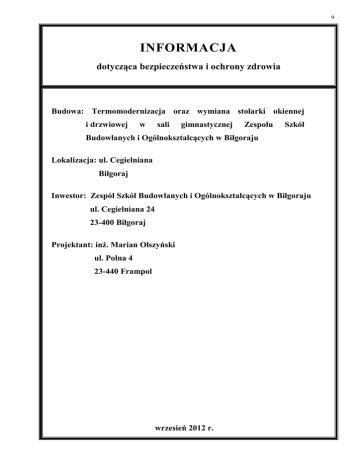 9 INFORMACJA dotycząca bezpieczeństwa i ochrony zdrowia Budowa: Termomodernizacja oraz wymiana stolarki okiennej i drzwiowej w sali gimnastycznej Zespołu Szkół Budowlanych i Ogólnokształcących w Biłgoraju Lokalizacja: ul. Cegielniana Biłgoraj Inwestor: Zespół Szkół Budowlanych i Ogólnokształcących w Biłgoraju ul. Cegielniana 24 23-400 Biłgoraj Projektant: inŜ. Marian Olszyński ul. Polna 4 23-440 Frampol wrzesień 2012 r. 10 ZAKRES ROBÓT Zakres opracowania obejmuje wykonanie termomodernizacji oraz wymiany stolarki okiennej i drzwiowej zewnętrznej w sali gimnastycznej Zespołu Szkół Budowlanych i Ogólnokształcących w Biłgoraju. ISTNIEJĄCE OBIEKTY BUDOWLANE Roboty wykonywane będą w istniejącym budynku sali gimnastycznej Zespołu Szkół Budowlanych i Ogólnokształcących w Biłgoraju. 1. KOLEJNOŚĆ WYKONYWANYCH ROBÓT 1.1. Zagospodarowanie placu budowy. 1.2. Roboty budowlano-montaŜowe. 1.3. Roboty wykończeniowe. 1.4. Maszyny i urządzenia techniczne uŜytkowane na placu budowy. 2. INSTRUKTAś PRACOWNIKÓW PRZED PRZYSTĄPIENIEM DO REALIZACJI ROBÓT SZCZEGÓLNIE NIEBEZPIECZNYCH - szkolenie pracowników w zakresie bhp, - zasady postępowania w przypadku wystąpienia zagroŜenia, - zasady bezpośredniego nadzoru nad pracami szczególnie niebezpiecznymi przez wyznaczone w tym celu osoby, - zasady stosowania przez pracowników środków ochrony indywidualnej oraz odzieŜy i obuwia roboczego. 3. ŚRODKI TECHNICZNE NIEBEZPIECZEŃSTWOM I ORGANIZACYJNE WYNIKAJĄCYM Z ZAPOBIEGAJĄCE WYKONYWANIA ROBÓT BUDOWLANYCH. 1.1. Zagospodarowanie placu budowy Zagospodarowanie terenu budowy wykonuje się przed rozpoczęciem robót budowlanych, co najmniej w zakresie: a) ogrodzenia terenu i wyznaczenia stref niebezpiecznych, b) wykonania dróg, wyjść i przejść dla pieszych, c) doprowadzenia energii elektrycznej oraz wody, d) urządzenia pomieszczeń higieniczno-sanitarnych i socjalnych, e) urządzenia składowisk materiałów i wyrobów. 11 Teren budowy lub robót powinien być w miarę potrzeby ogrodzony lub skutecznie zabezpieczony przed osobami postronnymi. Wysokość ogrodzenia powinna wynosić, co najmniej 1,5 m. Dla pojazdów uŜywanych w trakcie wykonywania robót budowlanych naleŜy wyznaczyć i oznakować miejsca postojowe na terenie budowy. Szerokość dróg komunikacyjnych na placu budowy lub robót powinna być dostosowana do uŜywanych środków transportowych. Drogi i ciągi piesze na placu budowy powinny być utrzymane we właściwym stanie technicznym. Nie wolno na nich składować materiałów, sprzętu lub innych przedmiotów. Drogi komunikacyjne dla wózków i taczek oraz pochylnie, po których dokonuje się ręcznego przenoszenia cięŜarów nie powinny mieć spadków większych niŜ 10%. Przejścia i strefy niebezpieczne powinny być oświetlone i oznakowane znakami ostrzegawczymi lub znakami zakazu. Przejścia o pochyleniu większym niŜ 15% naleŜy zaopatrzyć w listwy umocowane poprzecznie, w odstępach nie mniejszych niŜ 0,40 m lub schody o szerokości nie mniejszej niŜ 0,75 m, zabezpieczone, co najmniej z jednej strony balustradą. Balustrada składa się z deski krawęŜnikowej o wysokości 0,15 m i poręczy ochronnej umieszczonej na wysokości 1,10 m. Wolną przestrzeń pomiędzy deską krawęŜnikową a poręczą naleŜy wypełnić w sposób zabezpieczający pracowników przed upadkiem. Strefa niebezpieczna, w której istnieje zagroŜenie spadania z wysokości przedmiotów, powinna być ogrodzona balustradami i oznakowana w sposób uniemoŜliwiający dostęp osobom postronnym. Strefa ta nie moŜe wynosić mniej niŜ 1/10 wysokości, z której mogą spadać przedmioty, lecz nie mniej niŜ 6,0 m. Przejścia, przejazdy i stanowiska pracy w strefie niebezpiecznej powinny być zabezpieczone daszkami ochronnymi. Daszki ochronne powinny znajdować się na wysokości nie mniejszej niŜ 2,4 m nad terenem w najniŜszym miejscu i być nachylone pod kątem 45o w kierunku źródła zagroŜenia. Pokrycie daszków powinno być szczelne i odporne na przebicie przez spadające przedmioty. UŜywanie daszków ochronnych jako rusztowań lub miejsc składowania narzędzi, sprzętu, materiałów jest zabronione. Przewody elektryczne zasilające urządzenia mechaniczne powinny być zabezpieczone przed uszkodzeniami mechanicznymi, a ich połączenia z urządzeniami mechanicznymi wykonane w sposób zapewniający bezpieczeństwo pracy osób obsługujących takie urządzenia. NaleŜy zapewnić dostateczną ilość wody zdatnej do picia pracownikom zatrudnionym na budowie oraz do celów higieniczno-sanitarnych, gospodarczych i przeciwpoŜarowych. Na terenie budowy powinny być urządzone i wydzielone pomieszczenia higieniczno-sanitarne i socjalne: szatnie (na odzieŜ roboczą i ochronną), umywalnie, jadalnie, suszarnie oraz ustępy. 12 Dopuszczalne jest korzystanie z istniejących na terenie budowy pomieszczeń i urządzeń higieniczno-sanitarnych. Na terenie budowy powinny być wyznaczone oznakowane, utwardzone i odwodnione miejsca do składania materiałów i wyrobów. Składowiska materiałów, wyrobów i urządzeń technicznych naleŜy wykonać w sposób wykluczający moŜliwość wywrócenia, zsunięcia, rozsunięcia się lub spadnięcia składowanych wyrobów i urządzeń. Materiały drobnicowe powinny być ułoŜone w stosy o wysokości nie większej niŜ 2,0 m, a stosy materiałów workowanych ułoŜone w warstwach krzyŜowo do wysokości nieprzekraczającej 10 warstw. 1.2. Roboty budowlano-montaŜowe ZagroŜenia występujące przy wykonywaniu robót budowlano-montaŜowych: - upadek pracownika z wysokości, Osoby przebywające na stanowiskach pracy, znajdujące się na wysokości co najmniej 1,0 m od poziomu podłogi lub ziemi, powinny być zabezpieczone balustradą przed upadkiem z wysokości. Przemieszczane w poziomie stanowisko pracy powinno mieć zapewnione mocowanie końcówki linki bezpieczeństwa do pomocniczej liny ochronnej lub prowadnicy poziomej, zamo