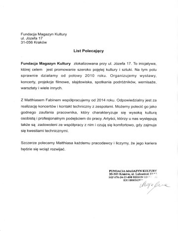 Fundacja Magazyn Kultury ul. Jazefa 17 31-056 Kraków List Polecający Fundacja Magazyn KuItury zlokalizowana przy ul. Józefa 17. Ta inicjatywa, której celem jest promowanie szeroko pojętej kultury i sztuki. Na tym polu sprawnie działamy od połowy 2a10 roku. Organizujemy wystawy, koncerty, prqekcje filmowe, slajdowiska, spotkania podroznikow, wernisaże, warsztaty i wiele innych. Z [/latthiasem Fabinem wspołpracujemy od 2014 roku" Odpowiedzialny jest za realizację koncertów i kontakt techniczny zzespałami, [Vlozemy polecić go jako godnego zaufania pracownika, który charakteryzuje się wysoką kulturą osobistą i profesjonalnym podejściemdo pracy" Artyści,ktorzy u na§ występują takze są zadowoleni ze współpracy z nim i czują się komfońowo, gdy zajmuje się kwestiami technicznymi. §zczerze polecamy tVlatthiasa kazdemu pracodawcy i liczymy, że jego kariera będzie się wciąz rozwijać. FUNDACJA MA6AZrr.ł KUUII]RY 30-383 Krakóq ul. Lubo§toń 33/'3 NE 616-2+25-698REGON 12l "r'r :.]',,i: KR§ 00003628c" lur '8