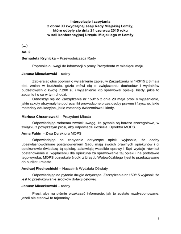 Interpelacje i zapytania z obrad XI zwyczajnej sesji Rady Miejskiej Łomży, które odbyły się dnia 24 czerwca 2015 roku w sali konferencyjnej Urzędu Miejskiego w Łomży (…) Ad. 2 Bernadeta Krynicka – Przewodnicząca Rady Poprosiła o uwagi do informacji o pracy Prezydenta w miesiącu maju. Janusz Mieczkowski – radny Zabierając głos poprosił o wyjaśnienie zapisu w Zarządzeniu nr 143/15 z 8 maja dot. zmian w budżecie, gdzie mówi się o zwiększeniu dochodów i wydatków budżetowych o kwotę 7.200 zł, i wyjaśnienie kto sprawował opiekę, kiedy, jakie to zadanie i o co w tym chodzi. Odnosząc się do Zarządzenia nr 159/15 z dnia 29 maja prosi o wyjaśnienie, jakie szkoły otrzymały te podręczniki prowadzone przez osoby prawne i fizyczne, jakie materiały edukacyjne, jakie materiały ćwiczeniowe i kiedy. Mariusz Chrzanowski – Prezydent Miasta Odpowiadając radnemu zwrócił uwagę, że pytania są bardzo szczegółowe, w związku z powyższym prosi, aby odpowiedzi udzieliła Dyrektor MOPS. Anna Fabin - Z-ca Dyrektora MOPS Odpowiadając na zapytanie dotyczące opieki wyjaśniła, że osoby ubezwłasnowolnione postanowieniem Sądu mają swoich prawnych opiekunów i ci opiekunowie świadczą tą opiekę, załatwiają wszelkie sprawy i Sąd wydaje również postanowienie o wypłaceniu dla opiekuna za sprawowanie tej opieki i na podstawie tego wyroku, MOPS pozyskuje środki z Urzędu Wojewódzkiego i jest to przekazywane do budżetu miasta. Andrzej Piechociński – Naczelnik Wydziału Oświaty Odpowiadając na pytanie drugie dotyczące Zarządzenia nr 159/15 wyjaśnił, że jest to przekazywanie środków dotacji celowej. Janusz Mieczkowski – radny Prosi, aby na piśmie przekazać informację, jak to zostało rozdysponowane, jeżeli nie stanowi to tajemnicy. 1 Andrzej Piechociński – Naczelnik Wydziału Oświaty Uzupełniając wcześniejszą wypowiedź dodał, że jest wyraźnie określone ustawowo, które klasy, którego typu szkoły mają do tego uprawnienia. Dodał, że wnioski składa się w ten sposób, iż szkoły miejskie w całości otrzymały te podręczniki i na wniosek tych szkół prowadzonych przez inne organy też zgodnie z kompetencją ustawowa te podręczniki otrzymują. Dodał, że mogą pokazać to szczegółowo na piśmie, tylko trochę później. Janusz Mieczkowski – radny Prosi o odpowiedź, czy on te materiały otrzyma. Mariusz Chrzanowski – Prezydent Miasta Odpowiadając zapewnił radnego Mieczkowskiego, że takie materiały otrzyma. Więcej uwag nie zgłoszono. Ad. 3 Bernadeta Krynicka – Przewodnicząca Rady Poprosiła o zgłaszanie interpelacji i zapytań. Ireneusz Cieślik – radny Stwierdził, że mieszkańcy osiedla cieszą się, iż mają ul. Browarną, ale wraz z realizacja tej ulicy pojawiły się kłopoty. W związku z powyższym proszą o umieszczenie znaku strefy ograniczonej prędkości do 30 km, tj. znaku P43. Wiesław Grzymała – radny Na piśmie złożył interpelacje dotyczące: 1. Odnosząc się do odpowiedzi na interpelację dotyczącą obsługi prawnej MPGKiM prosi o informacje dotyczące; - zakresu i okresu obowiązywania umowy zawartej pomiędzy MPGKiM, a Kancelarią Prawną z Zambrowa, - czy w latach 2010 -2013 MPGKiM było obsługiwane przez zewnętrzną kancelarię prawną, czy był zatrudniony na umowę o prace Radca Prawny, - czy została już podjęta decyzja o złożeniu skargi kasacyjnej od wyroku WSA w sprawie tzw. „afery śmieciowej”. Czy Prezydent może wskazać, który pełnomocnik sporządzi opinię prawną lub skargę i czy będą to etatowi urzędnicy, radcowie Urzędu, czy tez prawnicy z kancelarii prawnej z Białegostoku, Kancelarii prawnej w Warszawie, czy kancelarii z siedziba w Zambrowie, prosi o udostepnienie kopii opinii prawnej, bądź skargi kasacyjnej. 2. Odnosząc się do programu TTV z cyklu Blisko ludzi i odniesieniu do odcinka pt. „Obcięto dotacje konkursowe” prosi o odpowiedź; - czy Prezydent w przyszłości będzie konsultował podział środków na ochronę i 2 promocję zdrowia z tzw. Rada Seniorów, - ile osób zgłosiło się do udziału w pracach społecznej rady ds. osób starszych i czy władze miasta zaproponują honorowe członkostwo Pani Teresie Steckiewicz. 3. W nawiązaniu do kontekstu wypowiedzi Skarbnik Miasta w zakresie możliwości zwiększenia przychodów oraz ograniczenia wydatków miasta oraz w kontekście treści artykułu blogera lomzatuiteraz.pl prosi o odpowiedź na następujące pytania; - czy Prezydent zamierza zwiększyć wysokość stawek lokalnych opłat i podatków np. od nieruchomości, czy środków transportu, zmniejszyć wydatki na oświatę, - czy Prezydent posiada dane dotyczące analizy wysokości stawek lokalnych opłat i podatków w województwie podlaskim 10 największych miast w regionie, a jeżeli nie to, czy zamierza przed ewentualnym wnioskiem o zwiększenie stawek podatków zamierza Radzie taka analizę przedstawić. 4. W nawiązaniu do informacji, iż miasto Kolno sprzedało największą działkę na terenach inwestycyjnych przedsiębiorcy z Łomży, który zamierza zatrudnić ok. 60 osób prosi o odpowiedź: - jakie działania promocyjne miasto Łomża podjęło lub zamierza podjąć aby nakłonić rodzimych przedsiębiorców do inwestowania w Łomży? - na jakim etapie zaawansowania są prace nad kompleksowym programem gospodarczym miasta Łomża. 5. W nawiązaniu do treści Wyroku WSA z dnia 09.04.2015 r. prosi o udzielenie informacji: - ile zostało wydanych decyzji administracyjnych w latach 2012 – 2015 w przedmiocie zobowiązania małżonka, zstępnych lub wstępnych osoby uprawnionej do odpłatności za pobyt w DPS w Łomży? - ile zostało wydanych decyzji administracyjnych w latach 2012 -2015 zwalniających osoby zobowiązane do odpłatności8 za pobyt w DPS. 6. W nawiązaniu do konfliktu w SP nr 4 prosi o udzielenie informacji czy zostało wszczęte postepowanie mediacyjne i jeżeli tak, to jakie są efekty mediacji 