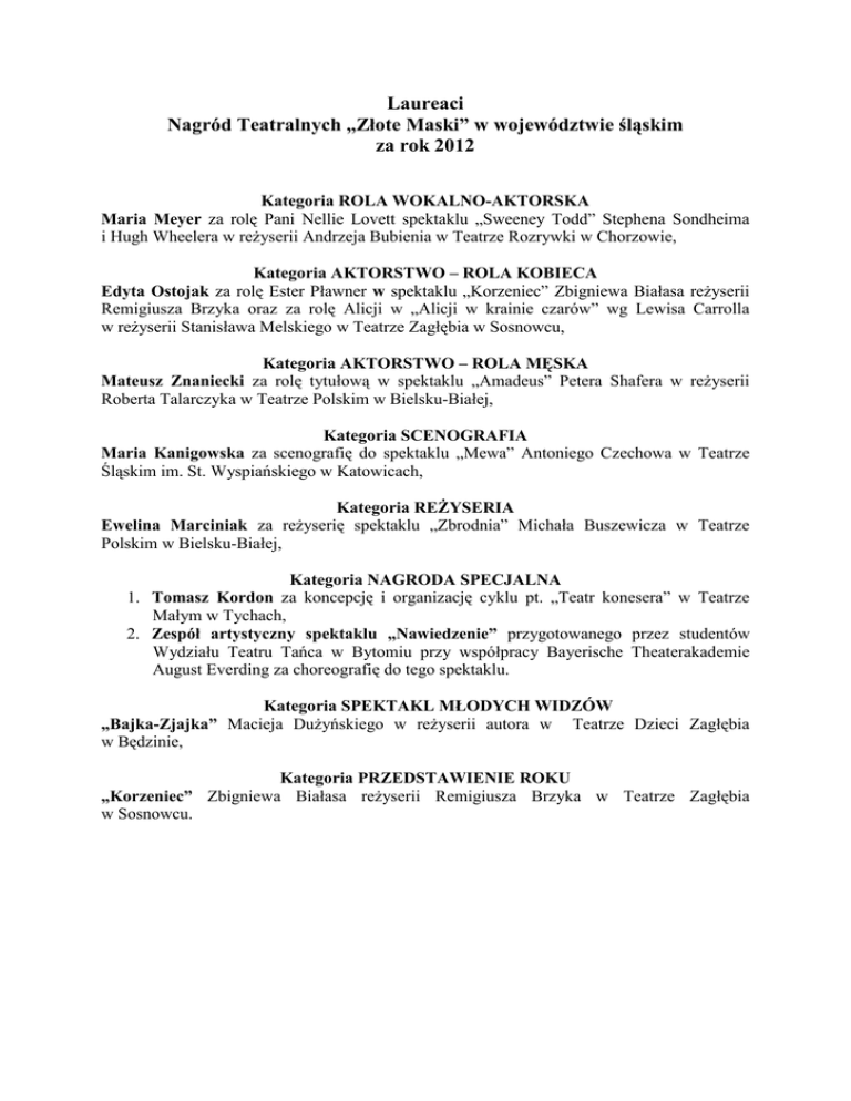 Laureaci Nagród Teatralnych „Złote Maski” w województwie śląskim za rok 2012 Kategoria ROLA WOKALNO-AKTORSKA Maria Meyer za rolę Pani Nellie Lovett spektaklu „Sweeney Todd” Stephena Sondheima i Hugh Wheelera w reŜyserii Andrzeja Bubienia w Teatrze Rozrywki w Chorzowie, Kategoria AKTORSTWO – ROLA KOBIECA Edyta Ostojak za rolę Ester Pławner w spektaklu „Korzeniec” Zbigniewa Białasa reŜyserii Remigiusza Brzyka oraz za rolę Alicji w „Alicji w krainie czarów” wg Lewisa Carrolla w reŜyserii Stanisława Melskiego w Teatrze Zagłębia w Sosnowcu, Kategoria AKTORSTWO – ROLA MĘSKA Mateusz Znaniecki za rolę tytułową w spektaklu „Amadeus” Petera Shafera w reŜyserii Roberta Talarczyka w Teatrze Polskim w Bielsku-Białej, Kategoria SCENOGRAFIA Maria Kanigowska za scenografię do spektaklu „Mewa” Antoniego Czechowa w Teatrze Śląskim im. St. Wyspiańskiego w Katowicach, Kategoria REśYSERIA Ewelina Marciniak za reŜyserię spektaklu „Zbrodnia” Michała Buszewicza w Teatrze Polskim w Bielsku-Białej, Kategoria NAGRODA SPECJALNA 1. Tomasz Kordon za koncepcję i organizację cyklu pt. „Teatr konesera” w Teatrze Małym w Tychach, 2. Zespół artystyczny spektaklu „Nawiedzenie” przygotowanego przez studentów Wydziału Teatru Tańca w Bytomiu przy współpracy Bayerische Theaterakademie August Everding za choreografię do tego spektaklu. Kategoria SPEKTAKL MŁODYCH WIDZÓW „Bajka-Zjajka” Macieja DuŜyńskiego w reŜyserii autora w Teatrze Dzieci Zagłębia w Będzinie, Kategoria PRZEDSTAWIENIE ROKU „Korzeniec” Zbigniewa Białasa reŜyserii Remigiusza Brzyka w Teatrze Zagłębia w Sosnowcu.