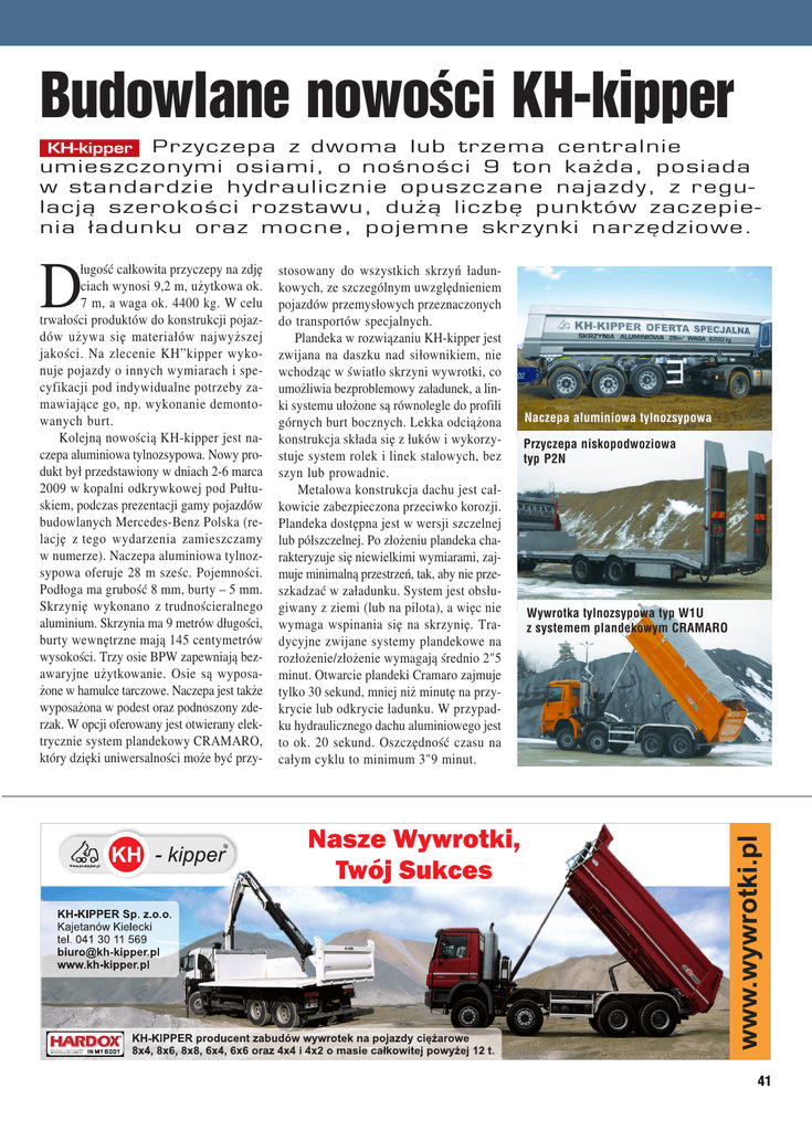 Budowlane nowości KH−kipper KH−kipper Przyczepa z dwoma lub trzema centralnie umieszczonymi osiami, o nośności 9 ton każda, posiada w standardzie hydraulicznie opuszczane najazdy, z regu− lacją szerokości rozstawu, dużą liczbę punktów zaczepie− nia ładunku oraz mocne, pojemne skrzynki narzędziowe. D ługość całkowita przyczepy na zdję ciach wynosi 9,2 m, użytkowa ok. 7 m, a waga ok. 4400 kg. W celu trwałości produktów do konstrukcji pojaz− dów używa się materiałów najwyższej jakości. Na zlecenie KH”kipper wyko− nuje pojazdy o innych wymiarach i spe− cyfikacji pod indywidualne potrzeby za− mawiające go, np. wykonanie demonto− wanych burt. Kolejną nowością KH−kipper jest na− czepa aluminiowa tylnozsypowa. Nowy pro− dukt był przedstawiony w dniach 2−6 marca 2009 w kopalni odkrywkowej pod Pułtu− skiem, podczas prezentacji gamy pojazdów budowlanych Mercedes−Benz Polska (re− lację z tego wydarzenia zamieszczamy w numerze). Naczepa aluminiowa tylnoz− sypowa oferuje 28 m sześc. Pojemności. Podłoga ma grubość 8 mm, burty – 5 mm. Skrzynię wykonano z trudnościeralnego aluminium. Skrzynia ma 9 metrów długości, burty wewnętrzne mają 145 centymetrów wysokości. Trzy osie BPW zapewniają bez− awaryjne użytkowanie. Osie są wyposa− żone w hamulce tarczowe. Naczepa jest także wyposażona w podest oraz podnoszony zde− rzak. W opcji oferowany jest otwierany elek− trycznie system plandekowy CRAMARO, który dzięki uniwersalności może być przy− stosowany do wszystkich skrzyń ładun− kowych, ze szczególnym uwzględnieniem pojazdów przemysłowych przeznaczonych do transportów specjalnych. Plandeka w rozwiązaniu KH−kipper jest zwijana na daszku nad siłownikiem, nie wchodząc w światło skrzyni wywrotki, co umożliwia bezproblemowy załadunek, a lin− ki systemu ułożone są równolegle do profili górnych burt bocznych. Lekka odciążona konstrukcja składa się z łuków i wykorzy− stuje system rolek i linek stalowych, bez szyn lub prowadnic. Metalowa konstrukcja dachu jest cał− kowicie zabezpieczona przeciwko korozji. Plandeka dostępna jest w wersji szczelnej lub półszczelnej. Po złożeniu plandeka cha− rakteryzuje się niewielkimi wymiarami, zaj− muje minimalną przestrzeń, tak, aby nie prze− szkadzać w załadunku. System jest obsłu− giwany z ziemi (lub na pilota), a więc nie wymaga wspinania się na skrzynię. Tra− dycyjne zwijane systemy plandekowe na rozłożenie/złożenie wymagają średnio 2"5 minut. Otwarcie plandeki Cramaro zajmuje tylko 30 sekund, mniej niż minutę na przy− krycie lub odkrycie ładunku. W przypad− ku hydraulicznego dachu aluminiowego jest to ok. 20 sekund. Oszczędność czasu na całym cyklu to minimum 3"9 minut. Naczepa aluminiowa tylnozsypowa Przyczepa niskopodwoziowa typ P2N Wywrotka tylnozsypowa typ W1U z systemem plandekowym CRAMARO 41