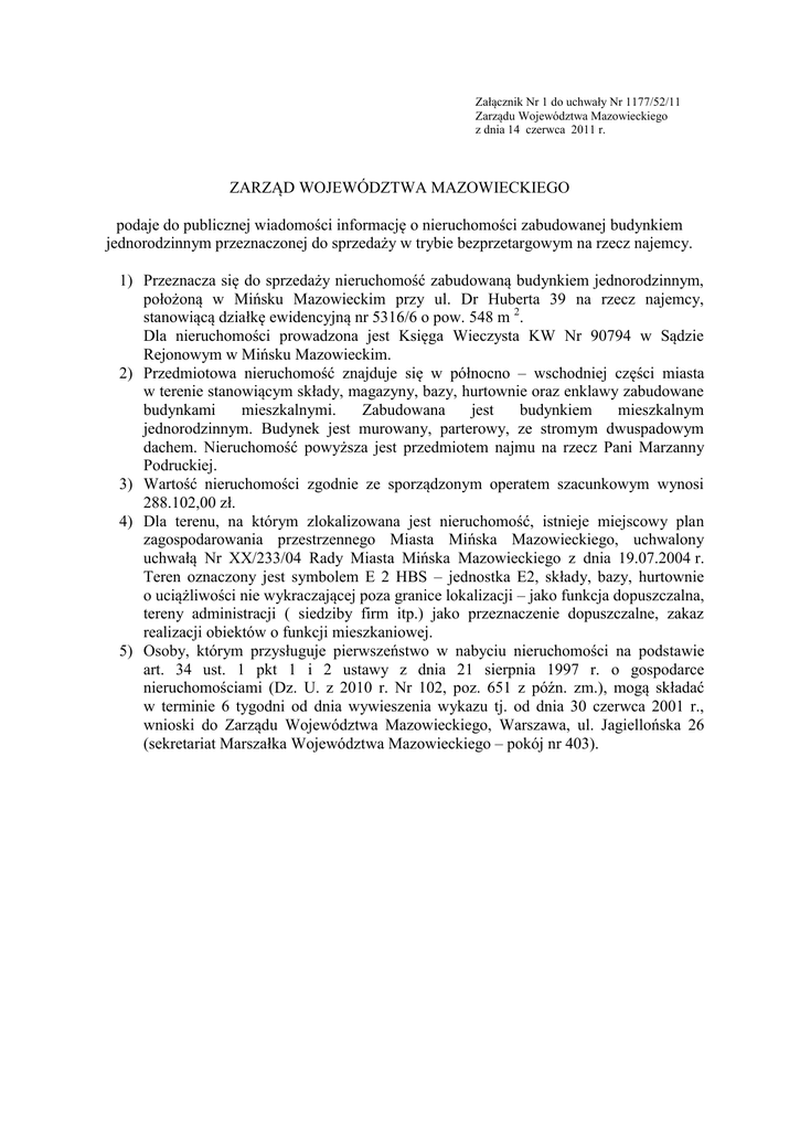 Załącznik Nr 1 do uchwały Nr 1177/52/11 Zarządu Województwa Mazowieckiego z dnia 14 czerwca 2011 r. ZARZĄD WOJEWÓDZTWA MAZOWIECKIEGO podaje do publicznej wiadomości informację o nieruchomości zabudowanej budynkiem jednorodzinnym przeznaczonej do sprzedaży w trybie bezprzetargowym na rzecz najemcy. 1) Przeznacza się do sprzedaży nieruchomość zabudowaną budynkiem jednorodzinnym, położoną w Mińsku Mazowieckim przy ul. Dr Huberta 39 na rzecz najemcy, stanowiącą działkę ewidencyjną nr 5316/6 o pow. 548 m 2. Dla nieruchomości prowadzona jest Księga Wieczysta KW Nr 90794 w Sądzie Rejonowym w Mińsku Mazowieckim. 2) Przedmiotowa nieruchomość znajduje się w północno – wschodniej części miasta w terenie stanowiącym składy, magazyny, bazy, hurtownie oraz enklawy zabudowane budynkami mieszkalnymi. Zabudowana jest budynkiem mieszkalnym jednorodzinnym. Budynek jest murowany, parterowy, ze stromym dwuspadowym dachem. Nieruchomość powyższa jest przedmiotem najmu na rzecz Pani Marzanny Podruckiej. 3) Wartość nieruchomości zgodnie ze sporządzonym operatem szacunkowym wynosi 288.102,00 zł. 4) Dla terenu, na którym zlokalizowana jest nieruchomość, istnieje miejscowy plan zagospodarowania przestrzennego Miasta Mińska Mazowieckiego, uchwalony uchwałą Nr XX/233/04 Rady Miasta Mińska Mazowieckiego z dnia 19.07.2004 r. Teren oznaczony jest symbolem E 2 HBS – jednostka E2, składy, bazy, hurtownie o uciążliwości nie wykraczającej poza granice lokalizacji – jako funkcja dopuszczalna, tereny administracji ( siedziby firm itp.) jako przeznaczenie dopuszczalne, zakaz realizacji obiektów o funkcji mieszkaniowej. 5) Osoby, którym przysługuje pierwszeństwo w nabyciu nieruchomości na podstawie art. 34 ust. 1 pkt 1 i 2 ustawy z dnia 21 sierpnia 1997 r. o gospodarce nieruchomościami (Dz. U. z 2010 r. Nr 102, poz. 651 z późn. zm.), mogą składać w terminie 6 tygodni od dnia wywieszenia wykazu tj. od dnia 30 czerwca 2001 r., wnioski do Zarządu Województwa Mazowieckiego, Warszawa, ul. Jagiellońska 26 (sekretariat Marszałka Województwa Mazowieckiego – pokój nr 403).