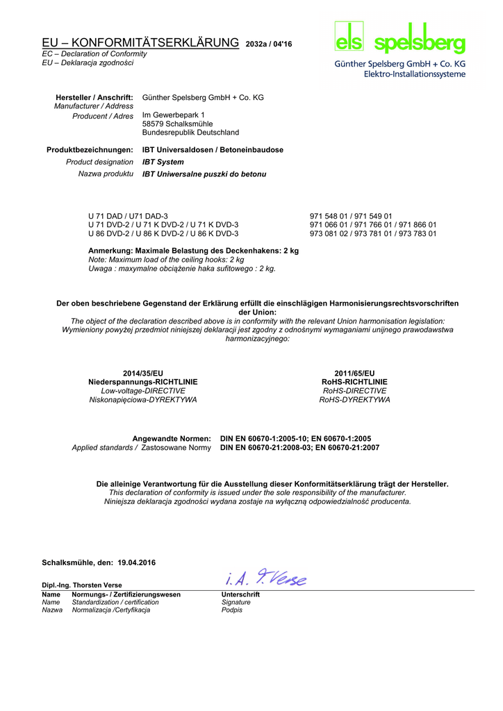 EU – KONFORMITÄTSERKLÄRUNG 2032a / 04'16 EC – Declaration of Conformity EU – Deklaracja zgodności Hersteller / Anschrift: Manufacturer / Address Producent / Adres Produktbezeichnungen: Product designation Nazwa produktu Günther Spelsberg GmbH + Co. KG Im Gewerbepark 1 58579 Schalksmühle Bundesrepublik Deutschland IBT Universaldosen / Betoneinbaudose IBT System IBT Uniwersalne puszki do betonu U 71 DAD / U71 DAD-3 U 71 DVD-2 / U 71 K DVD-2 / U 71 K DVD-3 U 86 DVD-2 / U 86 K DVD-2 / U 86 K DVD-3 971 548 01 / 971 549 01 971 066 01 / 971 766 01 / 971 866 01 973 081 02 / 973 781 01 / 973 783 01 Anmerkung: Maximale Belastung des Deckenhakens: 2 kg Note: Maximum load of the ceiling hooks: 2 kg Uwaga : maxymalne obciążenie haka sufitowego : 2 kg. Der oben beschriebene Gegenstand der Erklärung erfüllt die einschlägigen Harmonisierungsrechtsvorschriften der Union: The object of the declaration described above is in conformity with the relevant Union harmonisation legislation: Wymieniony powyżej przedmiot niniejszej deklaracji jest zgodny z odnośnymi wymaganiami unijnego prawodawstwa harmonizacyjnego: 2014/35/EU Niederspannungs-RICHTLINIE Low-voltage-DIRECTIVE Niskonapięciowa-DYREKTYWA Angewandte Normen: Applied standards / Zastosowane Normy 2011/65/EU RoHS-RICHTLINIE RoHS-DIRECTIVE RoHS-DYREKTYWA DIN EN 60670-1:2005-10; EN 60670-1:2005 DIN EN 60670-21:2008-03; EN 60670-21:2007 Die alleinige Verantwortung für die Ausstellung dieser Konformitätserklärung trägt der Hersteller. This declaration of conformity is issued under the sole responsibility of the manufacturer. Niniejsza deklaracja zgodności wydana zostaje na wyłączną odpowiedzialność producenta. Schalksmühle, den: 19.04.2016 Dipl.-Ing. Thorsten Verse Name Normungs- / Zertifizierungswesen Name Standardization / certification Nazwa Normalizacja /Certyfikacja Unterschrift Signature Podpis