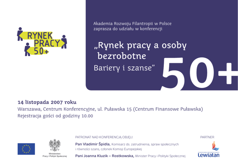 Akademia Rozwoju Filantropii w Polsce zaprasza do udziału w konferencji 14 listopada 2007 roku Warszawa, Centrum Konferencyjne, ul. Puławska 15 (Centrum Finansowe Puławska) Rejestracja gości od godziny 10.00 PATRONAT NAD KONFERENCJĄ OBJĘLI: Pan Vladimir Špidla, Komisarz ds. zatrudnienia, spraw społecznych i równości szans, członek Komisji Europejskiej Ministerstwo Pracy i Polityki Społecznej Pani Joanna Kluzik – Rostkowska, Minister Pracy i Polityki Społecznej PARTNER Podczas konferencji zaprezentowane zostaną wyniki ogólnopolskiego, kompleksowego badania sytuacji osób bezrobotnych 50+ na rynku pracy, przeprowadzonego na początku 2007 roku. Każdy z uczestników konferencji otrzyma dodatkowo publikację zawierającą podsumowanie badania wraz z opiniami ekspertów i przedstawicieli świata polityki i biznesu. Projekt współfinansowany jest ze środków Europejskiego Funduszu Społecznego w ramach Sektorowego Programu Operacyjnego Rozwój Zasobów Ludzkich, Działanie 1.5. Konferencja będzie także okazją poznania najciekawszych europejskich doświadczeń w aktywizowaniu osób 50+, w tym fińskiego programu zarządzania wiekiem. Chcemy także, aby konferencja zapoczątkowała publiczną debatę na temat problemu niskiej aktywności zawodowej osób powyżej 50. roku życia w Polsce. Okazją do tego będzie dyskusja panelowa w drugiej części konferencji z udziałem jej uczestników oraz zaproszonych gości z kraju i zagranicy: urzędników publicznych, pracodawców, ekspertów. REALIZATOR BADANIA: W celu potwierdzenia uczestnictwa prosimy o przesłanie formularza (załączonego do zaproszenia bądź zamieszczonego na stronie internetowej www.filantropia.org.pl/50_plus.html) mailowo, faksem lub kontakt telefoniczny. Zgłoszenia prosimy nadsyłać do 9 listopada br. Udział w konferencji jest bezpłatny. Liczba miejsc ograniczona, decyduje kolejność zgłoszeń. PATRONI MEDIALNI PROJEKTU: Kontakt: Akademia Rozwoju Filantropii w Polsce Joanna Tokarz – koordynator projektu tel.: 022 622 01 22 wew. 29 faks: 022 622 02 11 e-mail: [email protected] Konferencja „Rynek pracy a osoby bezrobotne 50+. Bariery i szanse” Warszawa, 14 listopada 2007 roku PROGRAM KONFERENCJI Patronat honorowy: •• Komisarz ds. zatrudnienia, spraw społecznych i równości szans – Pan Vladimir Špidla, członek Komisji Europejskiej •• Minister Pracy i Polityki Społecznej – Pani Joanna Kluzik – Rostkowska Partner: •• Polska Konfederacja Pracodawców Prywatnych Lewiatan Ministerstwo Pracy i Polityki Społecznej Od 10.00 Rejestracja gości 10.30 – 10.45 •• Rozpoczęcie konferencji i powitanie gości. 10.45 – 11.15 •• Prezentacja wyników i wniosków z badania „Rynek pracy a osoby bezrobotne 50+ – bariery i szanse” – Akademia Rozwoju Filantropii w Polsce Komentarz – prof. Barbara Szatur – Jaworska oraz prof. Barbara Rysz – Kowalczyk, Instytut Polityki Społecznej, Uniwersytet Warszawski 11.15 – 11.45 •• Działania na rzecz aktywności zawodowej osób 50+ na poziomie europejskim. Realizacja dotychczasowych strategii i rekomendacje. Pani Irma Krysiak, Dyrekcja Generalna ds. zatrudnienia, spraw społecznych i równości szans. 11.45 – 12.00 •• Przerwa kawowa 12.00 – 14.00 •• Panel ekspercki. Moderacja: Tomasz Schimanek, ARFP. Polscy 50-latkowie. Jak zwiększać aktywność zawodową tej grupy – przywracając i zatrzymując na rynku pracy oraz dążyć do realizacji celów Strategii Lizbońskiej? - Przedstawiciel administracji rządowej – Ministerstwo Pracy i Polityki Społecznej - Pani Irma Krysiak, Dyrekcja Generalna ds. zatrudnienia, spraw społecznych i równości szans. - Pan Perrti Linkola, Ministerstwo Pracy, Finlandia - Pan Jacek Męcina, Polska Konfederacja Pracodawców Prywatnych Lewiatan - Pan Krzysztof Rogowski, Dyrektor Powiatowego Urzędu Pracy w Leżajsku 14.00 – 14.45 •• Klucz do sukcesu – prezentacja fińskiego programu reform na rzecz zwiększenia aktywności osób po 50. roku życia. Pan Perrti Linkola, Ministerstwo Pracy, Finlandia 14.45 – 15.00 •• Podsumowanie i zamknięcie konferencji 15.00 – 16.00 •• Lunch