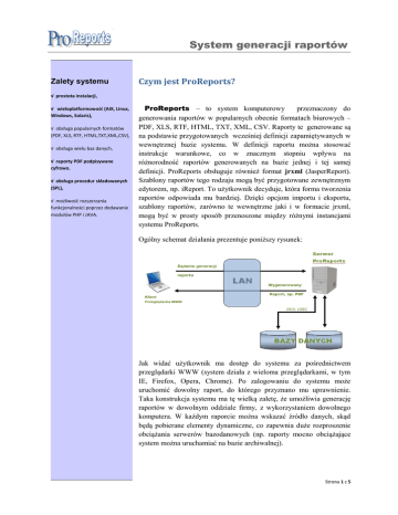 System generacji raportów Zalety systemu Czym jest ProReports? √ prostota instalacji, √ wieloplatformowość (AIX, Linux, Windows, Solaris), √ obsługa popularnych formatów (PDF, XLS, RTF, HTML,TXT,XML,CSV), √ obsługa wielu baz danych, √ raporty PDF podpisywane cyfrowo, √ obsługa procedur składowanych (SPL), √ możliwość rozszerzania funkcjonalności poprzez dodawanie modułów PHP i JAVA. ProReports – to system komputerowy przeznaczony do generowania raportów w popularnych obecnie formatach biurowych – PDF, XLS, RTF, HTML, TXT, XML, CSV. Raporty te generowane są na podstawie przygotowanych wcześniej definicji zapamiętywanych w wewnętrznej bazie systemu. W definicji raportu można stosować instrukcje warunkowe, co w znacznym stopniu wpływa na różnorodność raportów generowanych na bazie jednej i tej samej definicji. ProReports obsługuje również format jrxml (JasperReport). Szablony raportów tego rodzaju mogą być przygotowane zewnętrznym edytorem, np. iReport. To użytkownik decyduje, która forma tworzenia raportów odpowiada mu bardziej. Dzięki opcjom importu i eksportu, szablony raportów, zarówno te wewnętrzne jaki i w formacie jrxml, mogą być w prosty sposób przenoszone między różnymi instancjami systemu ProReports. Ogólny schemat działania prezentuje poniższy rysunek: Jak widać użytkownik ma dostęp do systemu za pośrednictwem przeglądarki WWW (system działa z wieloma przeglądarkami, w tym IE, Firefox, Opera, Chrome). Po zalogowaniu do systemu może uruchomić dowolny raport, do którego przyznano mu uprawnienie. Taka konstrukcja systemu ma tę wielką zaletę, że umożliwia generację raportów w dowolnym oddziale firmy, z wykorzystaniem dowolnego komputera. W każdym raporcie można wskazać źródło danych, skąd będą pobierane elementy dynamiczne, co zapewnia duże rozproszenie obciążania serwerów bazodanowych (np. raporty mocno obciążające system można uruchamiać na bazie archiwalnej). Strona 1 z 5 System generacji raportów Inne cechy systemu Skalowalność systemu. √ dostęp do wygenerowanych raportów poprzez przeglądarkę WWW, √ wewnętrzny harmonogram generacji raportów, √ moduł automatycznego wysyłania raportów (e-mail) do użytkowników, ProReports cechuje duża skalowalność. Dla bardziej wymagających użytkowników możliwe jest uruchomienie większej liczby serwerów, co zwiększa zarówno wydajność systemu jak i jego niezawodność. √ obsługa puli połączeń z automatycznym odłączaniem od bazy po zadanym czasie bezczynności, √ możliwość generacji raportów z linii komend, √ możliwość masowej generacji i przetwarzania raportów. Powyższy schemat ukazuje dwie instancje serwera ProReports. Żądania użytkowników są równomiernie rozkładane pomiędzy dwa serwery dzięki tzw. balancer’owi. Awaria jednego z serwerów pozostaje niezauważona przez klientów, gdyż wszystkie zadania kierowane są wówczas do sprawnego serwera. W roli balance’ra można użyć np. darmowego perlbal’a, który jest niezwykle prosty w instalacji i znakomicie sprawdza się w tej roli. Strona 2 z 5 System generacji raportów Inne cechy systemu Korzyści z zastosowania ProReports. √ definiowalne formatki parametrów wejściowych raportów, √ mechanizm uprawnień dostępu do raportów, √ mechanizm zapisywania własnych filtrów danych do generacji raportów, • Uzupełnienie funkcjonalności systemów informatycznych (zwłaszcza starszej generacji) o funkcję tworzenia raportów w popularnych formatach (PDF, XLS, RTF, HTML), • Łatwe tworzenie definicji raportów, • Skrócenie czasu tworzenia skomplikowanych raportów, • Duża przenośność raportów (import-export), • Łatwe zarządzanie definicjami raportów, • Wydruk masowych spersonalizowanych dokumentów, • Rozproszenie obciążenia podczas generacji raportów na wiele źródeł danych. Wymagania systemu. • Cześć serwerowa: o • Serwer z systemem operacyjnym AIX, Linux (np. CentOS), lub Windows XP. Cześć kliencka: o Przeglądarka internetowa. Strona 3 z 5 System generacji raportów Integracja z systemem PROMAK √ możliwość instalacji na tym samym serwerze, √ logowanie na bazie użytkowników systemu PROMAK, √ generowanie raportów z poziomu systemu PROMAK (prorepo.4ge), √ generowanie wydruków umów i aneksów na bazie danych z systemu PROMAK – moduł Umowy. Integracja z systemem maklerskim PROMAK (firmy Asseco Poland S.A.) ProReports powstał jako moduł uzupełniający do systemu maklerskiego PROMAK. System Maklerski PROMAK jest systemem komputerowym starszej generacji pracującym w środowisku terminalowym, stąd też pozbawiony jest nowoczesnych narzędzi raportowych. Niejednokrotnie zwykłe raporty tekstowe nawet drukowane na drukarkach laserowych są niewystarczające i nie spełniają oczekiwań klientów domów maklerskich. Dlatego pojawił się pomysł stworzenia oddzielnego oprogramowania raportowego, które jednak będzie zintegrowane z systemem PROMAK. ProReports może być zainstalowany na tym samym serwerze co system maklerski PROMAK: Wysoki poziom integracji z systemem PROMAK zapewnia: • Logowanie użytkowników do systemu ProReports z tym samym hasłem co do systemu PROMAK, • Generowanie wydruków umów i wszelkiego typu aneksów na bazie informacji zawartej w systemie PROMAK – moduł UMOWY, • Generowanie raportów z poziomu systemu maklerskiego PROMAK (prorepo.4ge): Strona 4 z 5 System generacji raportów Potencjalni użytkownicy ProReports • Raporty tekstowe są wyświetlane tak jak inne raporty w systemie PROMAK, • Raporty binarne (np. PDF, XLS) są przesyłane do użytkownika e-mail’em. √ Domy maklerskie, √ Wydziały powiernicze banków, √ Inni użytkownicy systemu maklerskiego PROMAK, √ Firmy ubezpieczeniowe, • Definiowanie raportów jako opcji w systemie PROMAK. √ Fundusze inwestycyjne, √ Firmy leasingowe, √ Firmy merchandising’owe. Należy