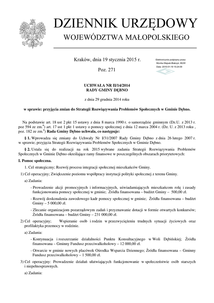 DZIENNIK URZĘDOWY WOJEWÓDZTWA MAŁOPOLSKIEGO Kraków, dnia 19 stycznia 2015 r. Elektronicznie podpisany przez: Monika Majsak-Białczyk; MUW Poz. 271 Data: 2015-01-19 15:24:09 UCHWAŁA NR II/14/2014 RADY GMINY DĘBNO z dnia 29 grudnia 2014 roku w sprawie: przyjęcia zmian do Strategii Rozwiązywania Problemów Społecznych w Gminie Dębno. Na podstawie art. 18 ust 2 pkt 15 ustawy z dnia 8 marca 1990 r. o samorządzie gminnym (Dz.U. z 2013 r. poz 594 ze zm.#) art. 17 ust 1 pkt 1 ustawy o pomocy społecznej z dnia 12 marca 2004 r. (Dz. U. z 2013 roku , poz. 182 ze zm.#) Rada Gminy Dębno uchwala, co następuje: § 1. Wprowadza się zmiany do Uchwały Nr I/31/2007 Rady Gminy Dębno z dnia 26 lutego 2007 r. w sprawie; przyjęcia Strategii Rozwiązywania Problemów Społecznych w Gminie Dębno. § 2. Ustala się do realizacji na rok 2015 wybrane zadania Strategii Rozwiązywania Problemów Społecznych w Gminie Dębno określające ramy finansowe w poszczególnych obszarach priorytetowych: I. Pomoc społeczna. 1. Cel strategiczny; Rozwój procesu integracji społecznej mieszkańców Gminy. 1) Cel operacyjny; Zwiększenie poziomu współpracy instytucji polityki społecznej z terenu Gminy. a) Zadania: - Prowadzenie akcji promocyjnych i informacyjnych, uświadamiających mieszkańcom rolę i zasady funkcjonowania pomocy społecznej w gminie; Źródła finansowana – budżet Gminy – 500,00 zł. - Rozwój doskonalenia zawodowego kadr pomocy społecznej w gminie; Źródła finansowana – budżet Gminy – 5 000,00 zł. - Zlecanie organizacjom pozarządowym zadań i przyznawanie dotacji w formie otwartych konkursów; Źródła finansowana – budżet Gminy – 231 000,00 zł. 2) Cel operacyjny; Wspieranie osób i rodzin w przezwyciężeniu trudnych sytuacji życiowych oraz profilaktyka przemocy w rodzinie. a) Zadania: - Kontynuacja i rozszerzanie działalności Punktu Konsultacyjnego w Woli Dębińskiej; Źródła finansowana – Gminny Fundusz przeciwalkoholowy – 12 000,00 zł. - Otwarcie w gminie nowych placówek Ośrodka Wsparcia Dziennego; Źródła finansowana – Gminny Fundusz przeciwalkoholowy – 1 500,00 zł. 3) Cel operacyjny: Prowadzenie działań ułatwiających funkcjonowanie w społeczeństwie osób starszych i niepełnosprawnych. a) Zadania: Dziennik Urzędowy Województwa Małopolskiego –2– Poz. 271 - Wspieranie procesu rehabilitacji zdrowotnej i społecznej osób niepełnosprawnych; Źródła finansowania – budżet Gminy – 2 000,00 zł. II. Zdrowie i bezpieczeństwo publiczne. 1. Cel strategiczny: Wzrost poziomu bezpieczeństwa zdrowotnego i publicznego mieszkańców Gminy. 1) Cel operacyjny: Doskonalenie procesu profilaktyki uzależnień oraz terapii osób uzależnionych i współuzależnionych. a) Zadania: - Zacieśnianie współpracy z pedagogami szkolnymi i lekarzami w profilaktyce i identyfikacji uzależnień u dzieci i młodzieży; Źródła finansowania –Gminny Fundusz przeciwalkoholowy – 2 000,00 zł. - Prowadzenie programów profilaktyki uzależnień w szkołach gminnych; Źródła finansowania – Gminny Fundusz przeciwalkoholowy – 2 000,00 zł. - Rozwijanie systemu wsparcia rodzin z problemami uzależnień oraz wsparcia osób współuzależnionych; Źródła finansowania – Gminny Fundusz przeciwalkoholowy – 4 500,00 zł. - Współpraca z oddziałami odwykowymi w szpitalach w procesie leczenia uzależnień wśród mieszkańców gminy; Źródła finansowania – Gminny Fundusz przeciwalkoholowy – 500,00 zł. 2) Cel operacyjny: Rozwój profilaktyki zdrowotnej i podniesienie jakości usług medycznych w gminie. a) Zadania: - Inicjowanie i promocja działań z zakresu profilaktyki zdrowia, np. bezpłatne badania okresowe dla różnych grup mieszkańców; Źródła finansowania – budżet Gminy – 5 000,00 zł. III. Oświata, kultura i sport. 1. Cel strategiczny ; Rozwój systemu oświatowego oraz dziedzictwa kulturowego na terenie Gminy Dębno. 1) Cel operacyjny: Doskonalenie procesu profilaktyki uzależnień oraz terapii osób uzależnionych i współuzależnionych. a) Zadania: - Wykorzystanie międzynarodowej współpracy uczniów i nauczycieli do pogłębiania znajomości języków obcych i realizacji wspólnych projektów. Źródła finansowana – Fundusze zewnętrzne – 60 000,00 zł. - Rozwój systemu nagród i stypendiów dla uczniów wyróżniających się w nauce; Źródła finansowania – budżet Gminy – 47 000,00 zł. - Rozwój systemu nagród dla nauczycieli, przyznawanych za osiągnięcia w nauczaniu i wychowaniu młodzieży; Źródła finansowana – budżet Gminy – 120 000,00 zł. - Realizacja programu dokształcania i doskonalenia nauczycieli, w tym szkoleń z zakresu pozyskiwania środków zewnętrznych; Źródła finansowana – budżet Gminy – 5 000,00 zł. 2) Cel operacyjny: Podejmowanie działań pielęgnujących oraz promujących kulturę mieszkańców Gminy Dębno. a) Zadania: - Promocja działalności zespołów folklorystycznych z terenu gminy; Źródła finansowana – budżet Gminy – 15 000,00 zł. - Upowszechnianie tradycyjnych potraw wśród mieszkańców i gości gminy; Źródła finansowania – budżet Gminy – 10 000,00 zł. - Wspieranie organizacji imprez masowych oraz prezentujących rękodzieło ludowe i dorobek lokalnych artystów; Źródła finansowania – budżet Gminy – 30 000,00 zł. Dziennik Urzędowy Województwa Małopolskiego –3– Poz. 271 - Kontynuacja corocznego kalendarza imprez kulturalnych przy współpracy z samorządami gminnymi i innymi instytucjami z terenu powiatu brzeskiego; Źródła finansowania – budżet Gminy – 10 000,00 zł. IV. Lokalny rynek pracy. 1. Cel strategiczny; Tworzenie warunków dla powstawania nowych miejsc pracy poprzez zagospodarowanie potencjalnych terenów inwestycyjnych oraz propagowanie procesu samo zatrudnienia. 1) Tworzenie warunków dla powstawania nowych terenów inwestycyjnych. a) Zadania: Finansowanie prac społecznie użytecznych Źródła f