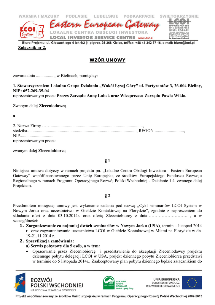 Załącznik nr 2. WZÓR UMOWY zawarta dnia ................., w Bielinach, pomiędzy: 1. Stowarzyszeniem Lokalna Grupa Działania „Wokół Łysej Góry” ul. Partyzantów 3, 26-004 Bieliny, NIP: 657-269-35-04 reprezentowanym przez: Prezes Zarządu Annę Łubek oraz Wiceprezesa Zarządu Pawła Wikło. Zwanym dalej Zleceniodawcą a 2. Nazwa Firmy ……....................................................................................., siedziba....................................................................................................., REGON ..........................., NIP............................... reprezentowanym przez: zwanym dalej Zleceniobiorcą §1 Niniejsza umowa dotyczy w ramach projektu pn. „Lokalne Centra Obsługi Inwestora - Eastern European Gateway” współfinansowanego przez Unię Europejską ze środków Europejskiego Funduszu Rozwoju Regionalnego w ramach Programu Operacyjnego Rozwój Polski Wschodniej - Działanie 1.4. zwanego dalej Projektem. §2 Przedmiotem niniejszej umowy jest wykonanie zadania pod nazwą „Cykl seminariów LCOI System w Nowym Jorku oraz uczestnictwo w Giełdzie Kontaktowej na Florydzie”, zgodnie z zaproszeniem do składania ofert z dnia 03.10.2014r. oraz ofertą Zleceniobiorcy z dnia………………………. , a w szczególności: 1. Zorganizowanie co najmniej dwóch seminariów w Nowym Jorku (USA), termin – listopad 2014 r. oraz zagwarantowanie uczestnictwa LCOI w Giełdzie Kontaktowej w Miami na Florydzie w dn. 19-21.11.2014 r. 2. Specyfikacja zamówienia: a) Serwis pobytowy dla 5 osób, a w tym: Opracowanie przez Zleceniobiorcę i przedstawienie do akceptacji Zleceniodawcy projektu dziennego pobytu delegacji LCOI w USA, projekt dziennego pobytu Zleceniobiorca przedstawi w terminie do 5 listopada 2014r., Zaakceptowany plan pobytu dziennego będzie załącznikiem do protokołu zdawczo-odbiorczego, niezrealizowanie przez Zleceniobiorcę założeń tego planu będzie skutkowało obniżeniem wynagrodzenia. zapewnienie 4 noclegów w Nowym Jorku i 4 noclegów w Miami dla 5 osób w pokojach jednoosobowych, o przeciętnym standardzie ***/**** przelot z Warszawy do Nowego Jorku, następnie z Nowego Jorku do Miami oraz z Miami do Warszawy w uzgodnionych z Zamawiającym terminach dla 5 osób wraz z dużym bagażem/os. oraz jednym dodatkowym bagażem na materiały promocyjne i roll-up, transport delegacji LCOI na obszarze USA, pełne wyżywienie – śniadania, obiady, kolacje dla 5 osób, podczas pobytu delegacji na terenie USA, serwis organizacyjny: zapewnienie bezpieczeństwa (w tym ubezpieczenie NW), b) Organizacja seminariów promujących Projekt „LCOI – Eastern European Gateway” na terenie Nowego Jorku. W ramach zamówienia Zleceniobiorca zapewni w każdym z dwóch seminariów: salę konferencyjną na około 50 osób oraz zaplecze socjalne (sala w której serwowany będzie catering, bezpłatną szatnię dla uczestników seminarium oraz bezpłatne toalety). Sala konferencyjna musi być oznaczona logotypami zgodnymi z księgą wizualizacji znaku PORPW 2007-2013 dostępną na stronie www.polskawschodnia.gov i informacją o instytucji zarządzającej i źródle finansowania – zamawiający posiada odpowiednie roll-up. przygotowanie punktu rejestracyjnego przybyłych gości, dodatkowo Zleceniobiorca zobowiązany jest do przygotowania listy uczestników (spis w formie elektronicznej imion i nazwisk zaproszonych gości z nazwą firmy/stanowiska służbowego) odrębnie dla każdego seminarium, wg wzoru przekazanego przez Zamawiającego. serwis techniczny: wynajęcie sal, z nagłośnieniem, catering w trakcie spotkań, zabezpieczenie sprzętu multimedialnego, instalacja banerów w scenografii miejsc spotkań (z logiem projektu i oznaczeń UE, PO RPW), zestaw multimedialny – rzutnik – 1 szt., ekran (duży), laptop – 1 szt. oraz zabezpieczenie łącza internetowego dla tego komputera, przeprowadzenie seminariów zgodnie ze szczegółowym planem spotkania przygotowanym przez Zamawiającego. serwis kawowy dla uczestników seminariów: kawa, herbata, woda, soki, kruche ciastka, kanapki; serwis organizacyjny: zapewnienie tłumacza w trakcie seminarium oraz jednego dodatkowego tłumacza podczas ewentualnych pytań i rozmów w kuluarach, wyznaczenie osoby odpowiedzialnej za sprawy organizacyjne i techniczne, która będzie w dyspozycji zamawiającego w czasie trwania seminarium i minimum godzinę przed jego rozpoczęciem. W ramach naboru Zleceniobiorca przygotuje i wyśle zaproszenia do potencjalnych uczestników obu seminariów na podstawie przygotowanych dwóch list (dla każdego seminarium) uzgodnionych z Zleceniodawcą. Zleceniobiorca przedstawi Zleceniodawcy propozycję zapraszanych gości w terminie minimum 10 dni przed planowanymi seminariami. Zaakceptowane listy będą załącznikami do sprawozdania merytorycznego z realizacji działań. Zaproszenia muszą zawierać logotypy zgodne z księgą wizualizacji znaku PORPW 2007-2013 dostępną na stronie: http://www.polskawschodnia.gov.pl/szukaj/Strony/Results.aspx?k=podr%C4%99cznik+oznakow ania wraz z informacją o instytucji zarządzającej i źródle finansowania. Zleceniobiorca ma zapewnić uczestnictwo około 30 osób/ na każdym seminarium – z potwierdzeniami przybycia, wysłane zaproszenia i potwierdzenia przybycia są wymaganymi załącznikami do sprawozdania merytorycznego z realizacji działań, sporządzenia merytorycznego sprawozdania z realizacji działania/ działań w wersji papierowej i elektronicznej. Sprawozdanie przekazane w wersji papierowej i elektronicznej powinno zawierać w szczególności informację o jego przebiegu, uczestnikach i ocenę skuteczności realizacji zakładanych celów oraz wymagane załączniki tj: - zaakceptowany przez Zleceniodawcę plan pobytu dziennego, - zaakceptowane przez Zleceniodawcę listy zapraszanych na seminaria gości, - wysłane zaproszenia i potwierdzenia przybycia gości zapraszanych na seminaria, - podpisane przez ucz