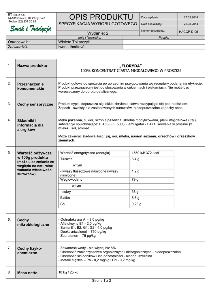 ET Sp. z o.o. 44-100 Gliwice, Ul. OkręŜna 8 Tel/fax (32) 231 20 88 OPIS PRODUKTU SPECYFIKACJA WYROBU GOTOWEGO Data wydania 27.03.2014 Data aktualizacji 28.08.2014 Numer dokumentu: Wydanie: 2 Imię i Nazwisko: Opracowała: Zatwierdziła: HACCP-D-05 Podpis: Wioleta Tokarczyk Iwona Ihnátová 1. Nazwa produktu 2. Przeznaczenie konsumenckie Produkt gotowy do spoŜycia po uprzednim przygotowaniu wg receptury podanej na etykiecie. Produkt przeznaczony jest do stosowania w cukierniach i piekarniach. Nie moŜe być wprowadzony do obrotu detalicznego. 3. Cechy sensoryczne Produkt sypki, dopuszcza się lekkie zbrylenia, łatwo rozsypujące się pod naciskiem. Zapach - swoisty dla zastosowanych surowców, niedopuszczalne zapachy obce. 4. Składniki i informacja dla alergików Mąka pszenna, cukier, skrobia pszenna, skrobia modyfikowana, płatki migdałowe (3%), substancje spulchniające: E 450(i), E 500(ii); emulgator - E471, serwatka w proszku (z mleka), sól, aromat. „FLORYDA” 100% KONCENTRAT CIASTA MIGDAŁOWEGO W PROSZKU MoŜe zawierać śladowe ilości: jaj, soi, mleka, nasion sezamu, orzechów i orzeszków ziemnych. 5. Wartość odŜywcza w 100g produktu (moŜe ulec zmianie ze względu na naturalne wahania właściwości surowców) Wartość energetyczna (energia) 1559 kJ/ 372 kcal Tłuszcz 3,4 g w tym - kwasy tłuszczowe nasycone (kwasy nasycone) Węglowodany 1,2 g 79 g w tym - cukry 36 g Białko 5,6 g Sól 0,23 g 6. Cechy mikrobiologiczne - Ochratoksyna A - 3,0 µg/kg - Aflatoksyny B1 - 2,0 µg/kg - Suma B1, B2, G1, G2 - 4,0 µg/kg - Deoksyniwalenol – 750 µg/kg - Zearalenon – 75 µg/kg 7. Cechy fizykochemiczne - Zawartość wody - nie więcej niŜ 8% - Obecność zanieczyszczeń organicznych i nieorganicznych - niedopuszczalna - Obecność szkodników i ich pozostałości - niedopuszczalna - Metale cięŜkie – Pb - 0,2 mg/kg i Cd - 0,2 mg/kg 8. Masa netto 10 kg / 25 kg Strona 1 z 2 ET Sp. z o.o. 44-100 Gliwice, Ul. OkręŜna 8 Tel/fax (32) 231 20 88 OPIS PRODUKTU SPECYFIKACJA WYROBU GOTOWEGO Data wydania 27.03.2014 Data aktualizacji 28.08.2014 Numer dokumentu: Wydanie: 2 Imię i Nazwisko: HACCP-D-05 Podpis: Opracowała: Zatwierdziła: Wioleta Tokarczyk Iwona Ihnátová 9. Trwałość 12 miesięcy od daty produkcji oryginalnie zapakowane. 10. Warunki przechowywania Przechowywać w suchym i chłodnym miejscu; w temperaturze nie większej niŜ 24˚C i wilgotności względnej powietrza nie większej niŜ 75%. 11. Materiał opakowaniowy Opakowanie przeznaczone do kontaktu z Ŝywnością – zgodnie z wymaganiami Rozporządzenia WE 1935/2004, 10/2011. Opakowania jednostkowe- worki trójwarstwowe, wewnątrz nie bielone, pokryte polietylenem. Opakowanie transportowe – paleta euro (120 x 80 cm) ilość 750 kg Ilość warstw na palecie: worki a'10 - 10 warstw, worki a'25 - 8 warstw + folia stretch. 12. Akty prawne/normy zgodne z wymaganiami Rozporządzenia Komisji (WE) NR 1881/2006 z dnia 19.12.2006 r. ustalające najwyŜsze dopuszczalne poziomy niektórych zanieczyszczeń w środkach spoŜywczych (z późn. zm.), Rozporządzenia Parlamentu Europejskiego i Rady (UE) NR 1169/2011 z dnia 25.10.2011 r. w sprawie przekazywania konsumentom informacji na temat Ŝywności (z późn. zm.), Rozporządzenia Ministra Rolnictwa i Rozwoju Wsi z dnia 10 lipca 2007 r. w sprawie znakowania środków spoŜywczych Dz.U. z 2007 nr 137 poz. 966, Ustawą z dnia 7 maja 2009 r. o towarach paczkowanych. 13. Receptura Receptura podstawowa: blacha 60 na 20 cm Floryda 1000 g Jaja świeŜe 400 g Olej 300 g Woda 200 g Sposób uŜycia: Wszystkie składniki wymieszać w maszynie cukierniczej (wolne obroty – 3 min.). o Ciasto wylać na blachę. Wypiekać w temperaturze około 180 C przez około 40 min. Strona 2 z 2