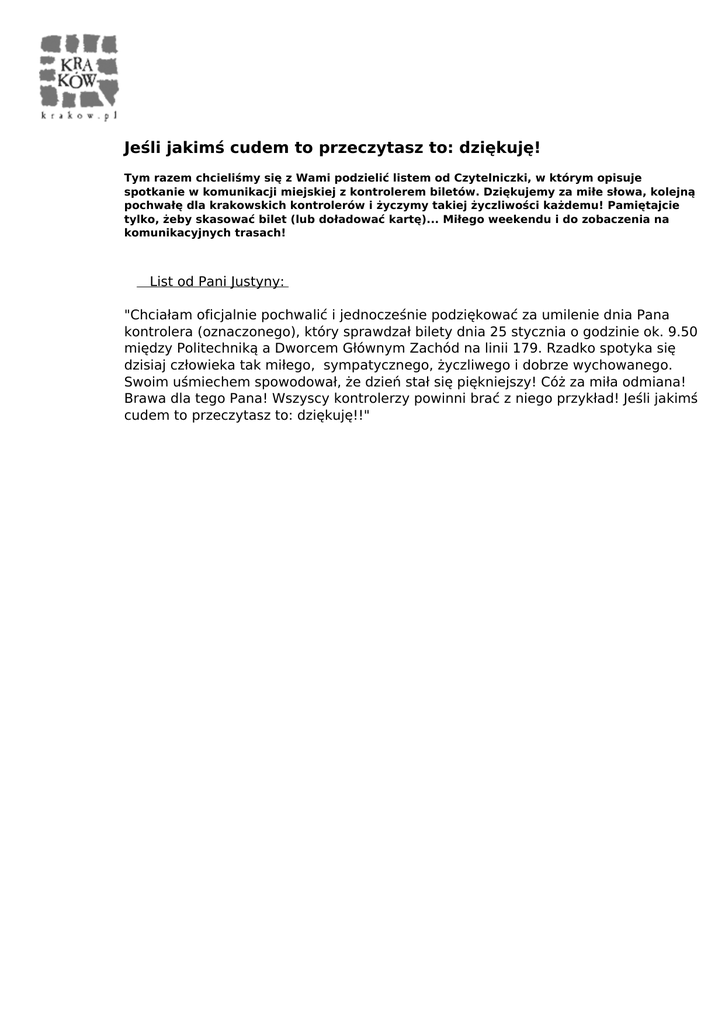 Jeśli jakimś cudem to przeczytasz to: dziękuję! Tym razem chcieliśmy się z Wami podzielić listem od Czytelniczki, w którym opisuje spotkanie w komunikacji miejskiej z kontrolerem biletów. Dziękujemy za miłe słowa, kolejną pochwałę dla krakowskich kontrolerów i życzymy takiej życzliwości każdemu! Pamiętajcie tylko, żeby skasować bilet (lub doładować kartę)... Miłego weekendu i do zobaczenia na komunikacyjnych trasach! List od Pani Justyny: "Chciałam oficjalnie pochwalić i jednocześnie podziękować za umilenie dnia Pana kontrolera (oznaczonego), który sprawdzał bilety dnia 25 stycznia o godzinie ok. 9.50 między Politechniką a Dworcem Głównym Zachód na linii 179. Rzadko spotyka się dzisiaj człowieka tak miłego, sympatycznego, życzliwego i dobrze wychowanego. Swoim uśmiechem spowodował, że dzień stał się piękniejszy! Cóż za miła odmiana! Brawa dla tego Pana! Wszyscy kontrolerzy powinni brać z niego przykład! Jeśli jakimś cudem to przeczytasz to: dziękuję!!" Powered by TCPDF (www.tcpdf.org)
