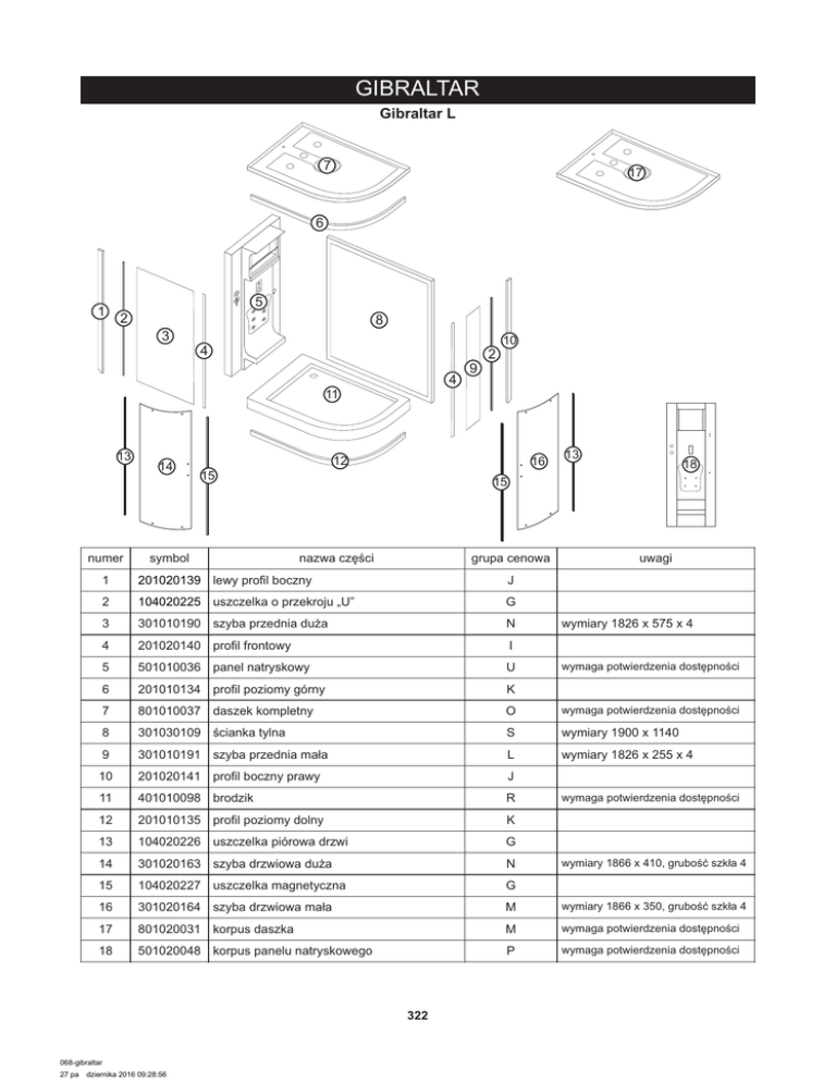 GIBRALTAR Gibraltar L 7 17 6 1 5 2 8 3 10 4 2 4 9 11 13 numer 14 12 16 15 symbol 18 15 nazwa części grupa cenowa uwagi 1 201020139 lewy profil boczny J 2 104020225 uszczelka o przekroju „U” G 3 301010190 szyba przednia duża N 4 201020140 profil frontowy I 5 501010036 panel natryskowy U 6 201010134 profil poziomy górny K 7 801010037 daszek kompletny O wymaga potwierdzenia dostępności 8 301030109 ścianka tylna S wymiary 1900 x 1140 9 301010191 szyba przednia mała L wymiary 1826 x 255 x 4 10 201020141 profil boczny prawy J 11 401010098 brodzik R 12 201010135 profil poziomy dolny K 13 104020226 uszczelka piórowa drzwi G 14 301020163 szyba drzwiowa duża N 15 104020227 uszczelka magnetyczna G 16 301020164 szyba drzwiowa mała M wymiary 1866 x 350, grubość szkła 4 17 801020031 korpus daszka M wymaga potwierdzenia dostępności 18 501020048 korpus panelu natryskowego P wymaga potwierdzenia dostępności 322 068-gibraltar 27 pa 13 dziernika 2016 09:28:56 wymiary 1826 x 575 x 4 wymaga potwierdzenia dostępności wymaga potwierdzenia dostępności wymiary 1866 x 410, grubość szkła 4 Gibraltar R 9 17 10 11 5 8 4 14 7 5 6 15 7 12 1 2 13 3 3 numer symbol nazwa części 1 18 grupa cenowa uwagi 1 104020226 uszczelka piórowa drzwi G 2 301020164 szyba drzwiowa mała M 3 104020227 uszczelka magnetyczna G 4 201020142 profil boczny lewy J 5 104020225 uszczelka o przekroju „U” G 6 301010191 szyba przednia mała L 7 201020140 profil frontowy I 8 301030109 ścianka tylna S wymiary 1900 x 1140 9 801010038 daszek kompletny O wymaga potwierdzenia dostępności 10 201010135 profil poziomy górny K 11 501010036 panel natryskowy U wymaga potwierdzenia dostępności 12 401010099 brodzik R wymaga potwierdzenia dostępności 13 201010134 profil poziomy dolny K 14 301010190 szyba przednia duża N 15 201020143 profil boczny prawy J 16 301020163 szyba drzwiowa duża N wymiary 1866 x 410, grubość szkła 4 17 801020032 korpus daszka M wymaga potwierdzenia dostępności 18 501020048 korpus panelu natryskowego P wymaga potwierdzenia dostępności 323 068-gibraltar 27 pa 16 dziernika 2016 09:28:56 wymiary 1866 x 350, grubość szkła 4 wymiary 1826 x 255 x 4 wymiary 1826 x 575 x 4 Gibraltar 1 2 3 4 5 6 7 8 9 10 11 12 13 14 15 16 17 18 19 20 Vol + TUN - TUN + Vol - numer symbol nazwa części grupa cenowa 1 601010018 panel sterujący O 2 502010004 uchwyt panelu sterującego C 3 106010010 bateria kompletna N 4 103010001 głowica mieszacza - 40 mm G 5 103020012 głowica przełącznika funkcji G 6 101030033 uchwyt mieszacza E 7 101030034 uchwyt przełącznika funkcji E 8 102020016 rozeta mieszacza C 9 102020026 rozeta przełącznika funkcji C 10 102040018 osłona głowicy mieszacza C 11 105010006 dysza masażowa przelotowa D 12 105010007 dysza masażowa końcowa D 13 503010009 oparcie panelu I 14 703010039 reling półki G 15 102030049 wąż połączeniowy dysz natryskowych F długość całkowita 125 cm 16 102030054 wąż połączeniowy zestawu natryskowego F długość 75 cm 17 102030098 wąż połączeniowy deszczownicy G długość 150 cm 18 104020086 uszczelka 1/2" A 19 102060001 opaska zaciskowa B 20 102050007 kolanko węża połączeniowego - mosiądz C 324 068-gibraltar 27 pa uwagi dziernika 2016 09:28:56 szary front rozstaw 100 średnica 33 (34,5), wysokość 74 (77) Gibraltar 1 2 3 4 5 6 7 8 9 10 11 12 13 14 15 16 17 18 19 20 numer symbol nazwa części grupa cenowa 1 702010069 rolka górna E średnica kółka 21 2 702010070 rolka dolna E średnica kółka 21 3 702020004 uchwyt drzwi G 4 702010003 odbojnik B 5 105010010 słuchawka natryskowa H 6 105020004 wąż natryskowy E 1/2" x 1/2" L1500 7 105030017 uchwyt słuchawki natryskowej D rozstaw otworów 50 8 102050005 przyłącze węża natryskowego C 9 701020002 nakrętka 1/2" z kołnierzem - tworzywo A 10 105010011 I 11 603010002 zasilacz I 12 604020002 wentylator G długość przewodu 110 cm 13 604030002 głośnik H długość przewodu 110 cm 14 802010002 osłona głośnika/wentylatora E 15 604010002 halogen H długość przewodu 10 cm 16 604040001 przedłużacz halogenu B długość przewodu 120 cm 17 105050005 drenaż H 18 701010060 zestaw wkrętów do montażu kabiny F 19 105050036 korek E 20 105050038 rura odpływowa F deszczownica 325 068-gibraltar 27 pa uwagi dziernika 2016 09:28:57 Gibraltar 1 2 3 4 5 6 7 8 9 10 numer 1 symbol nazwa części grupa cenowa 902010062 zestaw montażowy R uwagi rysunek poglądowy 2 3 4 5 6 7 8 9 10 Gibraltar - paczki - wymaga potwierdzenia dostępności symbol nazwa części grupa cenowa uwagi 8006059075481058200104 paczka 1/4 Gibraltar L U brodzik, dach, profile poziome, akcesoria, zestaw montażowy 8006059075481058200204 paczka 2/4 Gibraltar L S ścianka tylna 8006059075481058200304 paczka 3/4 Gibraltar L U panel natryskowy 8006059075481058200404 paczka 4/4 Gibraltar L U szyby boczne, szyby drzwi, profile przednie cienkie, profile boczne, uszczelki 8006059075481058370104 paczka 1/4 Gibraltar P U brodzik, dach, profile poziome, akcesoria, zestaw montażowy 8006059075481058370204 paczka 2/4 Gibraltar P S ścianka tylna 8006059075481058370304 paczka 3/4 Gibraltar P U panel natryskowy 8006059075481058370404 paczka 4/4 Gibraltar P U szyby boczne, szyby drzwi, profile przednie cienkie, profile boczne, uszczelki 326 068-gibraltar 27 pa dziernika 2016 09:28:57