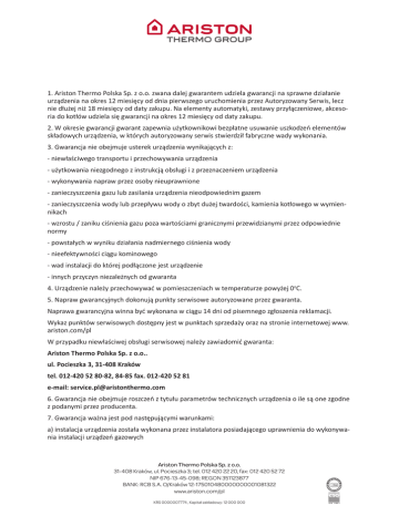 1. Ariston Thermo Polska Sp. z o.o. zwana dalej gwarantem udziela gwarancji na sprawne działanie urządzenia na okres 12 miesięcy od dnia pierwszego uruchomienia przez Autoryzowany Serwis, lecz nie dłużej niż 18 miesięcy od daty zakupu. Na elementy automatyki, zestawy przyłączeniowe, akcesoria do kotłów udziela się gwarancji na okres 12 miesięcy od daty zakupu. 2. W okresie gwarancji gwarant zapewnia użytkownikowi bezpłatne usuwanie uszkodzeń elementów składowych urządzenia, w których autoryzowany serwis stwierdził fabryczne wady wykonania. 3. Gwarancja nie obejmuje usterek urządzenia wynikających z: - niewłaściwego transportu i przechowywania urządzenia - użytkowania niezgodnego z instrukcją obsługi i z przeznaczeniem urządzenia - wykonywania napraw przez osoby nieuprawnione - zanieczyszczenia gazu lub zasilania urządzenia nieodpowiednim gazem - zanieczyszczenia wody lub przepływu wody o zbyt dużej twardości, kamienia kotłowego w wymiennikach - wzrostu / zaniku ciśnienia gazu poza wartościami granicznymi przewidzianymi przez odpowiednie normy - powstałych w wyniku działania nadmiernego ciśnienia wody - nieefektywności ciągu kominowego - wad instalacji do której podłączone jest urządzenie - innych przyczyn niezależnych od gwaranta 4. Urządzenie należy przechowywać w pomieszczeniach w temperaturze powyżej 0oC. 5. Napraw gwarancyjnych dokonują punkty serwisowe autoryzowane przez gwaranta. Naprawa gwarancyjna winna być wykonana w ciągu 14 dni od pisemnego zgłoszenia reklamacji. Wykaz punktów serwisowych dostępny jest w punktach sprzedaży oraz na stronie internetowej www. ariston.com/pl W przypadku niewłaściwej obsługi serwisowej należy zawiadomić gwaranta: Ariston Thermo Polska Sp. z o.o.. ul. Pocieszka 3, 31-408 Kraków tel. 012-420 52 80-82, 84-85 fax. 012-420 52 81 e-mail: [email protected] 6. Gwarancja nie obejmuje roszczeń z tytułu parametrów technicznych urządzenia o ile są one zgodne z podanymi przez producenta. 7. Gwarancja ważna jest pod następującymi warunkami: a) instalacja urządzenia została wykonana przez instalatora posiadającego uprawnienia do wykonywania instalacji urządzeń gazowych Ariston Thermo Polska Sp. z o.o. 31-408 Kraków, ul. Pocieszka 3; tel. 012 420 22 20, fax: 012 420 52 72 NIP 676-13-45-098; REGON 351123877 BANK: RCB S.A. O/Kraków 12-175010480000000001081322 www.ariston.com/pl KRS 0000007774 , Kapitał zakładowy: 12 000 000 b) pierwsze uruchomienie i regulacja urządzenia musi być dokonana przez Autoryzowany Punkt Serwisowy . Dla większości urządzeń pierwsze uruchomienie i regulacja są bezpłatne, użytkownik pokrywa jedynie koszty dojazdu serwisu do uruchomienia i koszt ewentualnych dodatkowych prac montażowych, aby sprawdzić szczegółowe koszty uruchomienia dla Państwa kotła, sprawdź na www.ariston. com/pl lub zadzwoń 12 420 22 20 c) urządzenie zainstalowano na terenie Polski zgodnie z obowiązującymi normami, przepisami i zaleceniami zawartymi w instrukcji obsługi. d) karta gwarancyjna musi być poprawnie wypełniona, z pieczęcią punktu sprzedaży, datą sprzedaży. Gwarancja jest ważna tylko z dowodem zakupu urządzenia e) instalacja wyposażona jest w elementy zabezpieczające urządzenie przed wpływem zanieczyszczeń ( filtry siatkowe na wlocie gazu i wody, przy c.o. na powrocie wody z układu). 8. Gwarancja traci ważność w przypadku: a) dokonywania wszelkiego rodzaju napraw, regulacji urządzenia przez osoby lub serwisy nieupoważnione przez gwaranta b) montażu niezgodnego z obowiązującymi przepisami i zaleceniami zawartymi w instrukcji obsługi c) użycia do montażu elementów hydraulicznych niezgodnych z normami. d) uszkodzeń mechanicznych oraz innych powstałych w wyniku niewłaściwej obsługi i złej konserwacji. e) niemożności okazania przez użytkownika karty gwarancyjnej 9. Gwarant nie ponosi odpowiedzialności za wszelkie szkody, które mogą wystąpić w następstwie nie stosowania się do wszystkich zaleceń zawartych w instrukcji obsługi a w szczególności zaleceń dotyczących użytkowania i obsługi urządzenia. 10. Szczegółowe uprawnienia użytkownika określa Ustawa o Prawach Konsumenta z dnia 30 maja 2014 r. o (Dz.U. Nr 827 z 2014r). 11. Gwarancja na sprzedany towar konsumpcyjny nie wyłącza, nie ogranicza ani nie zawiesza uprawnień kupującego wynikających z rękojmi, stosownie do przepisów powyższej ustawy. Ariston Thermo Polska Sp. z o.o. 31-408 Kraków, ul. Pocieszka 3; tel. 012 420 22 20, fax: 012 420 52 72 NIP 676-13-45-098; REGON 351123877 BANK: RCB S.A. O/Kraków 12-175010480000000001081322 www.ariston.com/pl KRS 0000007774 , Kapitał zakładowy: 12 000 000