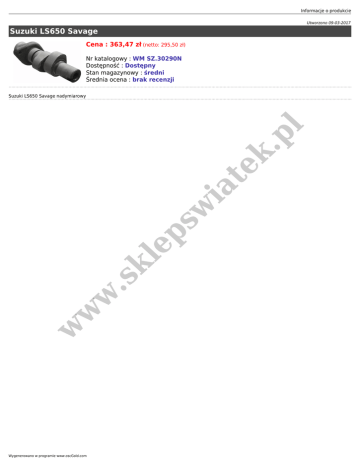 Informacje o produkcie Utworzono 09-03-2017 Suzuki LS650 Savage Cena : 363,47 zł (netto: 295,50 zł) Nr katalogowy : WM SZ.30290N Dostępność : Dostępny Stan magazynowy : średni Średnia ocena : brak recenzji w w w .s kl ep sw ia te k. pl Suzuki LS650 Savage nadymiarowy Wygenerowano w programie www.oscGold.com