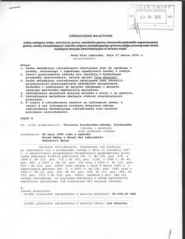 ii Z A. GMINY w NOWEJ WSI LĘBORSKIEJ i Wpry 0 3 -Oł- 2015 j n?ło OŚWIADCZENIE MAJĄTKOWE wójta, zastępcy wójta, sekretarza gminy, skarbnika gminy, kierownika jednostki organizacyjnej gminy, osoby zarządzającej i członka-organu zarządzającego gminną osobą prawną oraz osoby wydającej deeyzje administracyjne w imieniu wójta4 Nowa Wieś Lęborska, dnia 27 marca 2015 r. (miej scowość) Uwaga: 1. Osoba składająca oświadczenie obowiązana jest do zgodnego z prawdą, starannego i zupełnego wypełnienia każdej z rubryk. 2. Jeżeli poszczególne rubryki nie znajdują w konkretnym przypadku zastosowania, należy wpisać "nie dotyczy". 3. Osoba składająca oświadczenie obowiązana jest określić przynależność poszczególnych składników majątkowych, dochodów i zobowiązań do majątku odrębnego i majątku objętego małżeńską wspólnością majątkową. 4. Oświadczenie majątkowe dotyczy majątku w kraju i za granicą. 5. Oświadczenie majątkowe obejmuje również wierzytelności pieniężne. 6. W części A oświadczenia zawarte są informacje jawne, w części B zaś informacje niejawne dotyczące adresu zamieszkania składającego oświadczenie oraz miejsca położenia nieruchomości. CZĘŚĆ A Ja, niżej podpisany(a), Wioletta Piechowska-Labuda, Piechowska (imiona i nazwisko oraz nazwisko rodowe) urodzony(a) 28 maja 1980 roku w Lęborku Urząd Gminy w Nowej Wsi Lęborskiej Sekretarz Gminy (miejsce zatrudnienia, stanowisko lub funkcja) po zapoznaniu się z przepisami ustawy z dnia 21 sierpnia 1997 r. o ograniczeniu prowadzenia działalności gospodarczej przez osoby pełniące funkcje publiczne (Dz. U. Nr 106, poz. 679, z 1998 r. Nr 113, poz. 715 i Nr 162, poz. 1126, z 1999 r. Nr 49, poz. 483, z 2000 r. Nr 26, poz. 306 oraz z 2002 r. Nr 113, poz 984 i Nr 214, poz. 1806) oraz ustawy z dnia 8 marca 1990 r. o samorządzie gminnym (Dz. U. z2001 r. Nr 142, poz. 1591 oraz z 2002 r. Nr 23, poz. 220, Nr 62, poz. 558, Nr 113, poz. 984, Nr 153, poz. 1271 i Nr 214, poz. 1806), zgodnie z art. 24h tej ustawy oświadczam, że posiadam wchodzące w skład małżeńskiej wspólności majątkowej lub stanowiące mój majątek odrębny: I. Zasoby pieniężne: - środki pieniężne zgromadzone w walucie polskiej: 20.000,00 PLN - środki pieniężne zgromadzone w walucie obcej: nie dotyczy - papiery wartościowe: nie dotyczy ................. na kwotę: nie dotyczy.................... II. 1. Dom o powierzchni: nie dotyczy., m2, o wartości: nie dotyczy tytuł prawny: nie dotyczy................................. 2. Mieszkanie o powierzchni: 52,87 m2, o wartości: 130.000 zł tytuł prawny: małżeńska wspólność majątkowa (bez udziałów w gruncie) 3. Gospodarstwo rolne: rodzaj gospodarstwa: nie dotyczy.., powierzchnia: nie dotyczy o wartości: nie dotyczy..................................... rodzaj zabudowy: nie dotyczy................................ tytuł prawny: nie dotyczy................................... Z tego tytułu osiągnąłem(ęłam) w roku ubiegłym przychód i dochód w wysokości: nie dotyczy............................. 4. Inne nieruchomości: powierzchnia: nie dotyczy................................. o wartości: nie dotyczy tytuł prawny: nie dotyczy III. Posiadam udziały w spółkach handlowych - należy podać liczbę i emitenta udziałów: nie dotyczy.................................................. udziały te stanowią pakiet większy niż 10% udziałów w spółce: nie dotyczy................................................. Z tego tytułu osiągnąłem(ęłam) w roku ubiegłym dochód w wysokości: .................................................. nie dotyczy................................................. IV. Posiadam akcje w spółkach handlowych - należy podać liczbę i emitenta akcji: nie dotyczy................................................ akcje te stanowią pakiet większy niż 10% akcji w spółce: nie dotyczy................................................... Z tego tytułu osiągnąłem(ęłam) w roku ubiegłym dochód w wysokości: nie dotyczy........................................ V. Nabyłem(am) (nabył mój małżonek, z wyłączeniem mienia przynależnego do jego majątku odrębnego) od Skarbu Państwa, innej państwowej osoby prawnej, jednostek samorządu terytorialnego, ich związków lub od komunalnej osoby prawnej następujące mienie, które podlegało zbyciu w drodze przetargu należy podać opis mienia i datę nabycia, od kogo: ............ nie dotyczy.................................................... 1. Prowadzę działalność gospodarczą2 (należy podać formę prawną i przedmiot działalności): nie dotyczy....... - osobiście nie dotyczy - wspólnie z innymi osobami nie dotyczy Z tego tytułu osiągnąłem(ęłam) w roku ubiegłym przychód i dochód w wysokości: nie dotyczy......................... 2. Zarządzam działalnością gospodarczą lub jestem przedstawicielem pełnomocnikiem takiej działalności (należy podać formę prawną i przedmiot działalności): nie dotyczy.. - osobiście nie dotyczy - wspólnie z innymi osobami nie dotyczy Z tego tytułu osiągnąłem(ęłam) w roku ubiegłym dochód w wysokości: nie dotyczy............................ VII. 1. W spółkach handlowych (nazwa, siedziba spółki): nie dotyczy - jestem członkiem zarządu (od kiedy): nie dotyczy - jestem członkiem rady nadzorczej (od kiedy): nie dotyczy. - jestem członkiem komisji rewizyjnej (od kiedy): nie dotyczy Z tego tytułu osiągnąłem(ęłam) w roku ubiegłym dochód w wysokości: nie dotyczy............................ 2. W spółdzielniach: nie dotyczy........................................ - jestem członkiem zarządu (od kiedy): nie dotyczy........ - jestem członkiem rady nadzorczej3 (od kiedy): nie dotyczy - jestem członkiem komisji rewizyjnej (od kiedy): nie dotyczy Z tego tytułu osiągnąłem(ęłam) w roku ubiegłym dochód w wysokości: nie dotyczy................................ 3. W fundacjach p