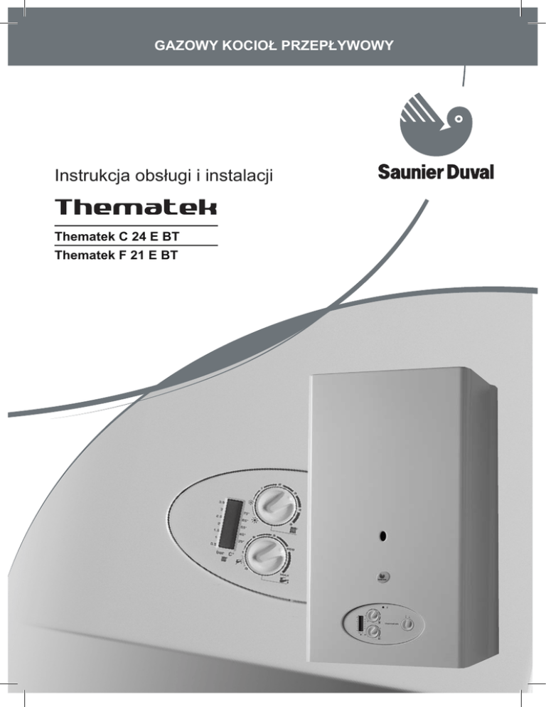 GAZOWY KOCIOŁ PRZEPŁYWOWY Instrukcja obsługi i instalacji Thematek C 24 E BT Thematek F 21 E BT Instrukcja obsługi 1 Uwagi ogólne ..........................................................................2 2 Przechowywanie dokumentów ................................................3 3 Zagadnienia dotyczące bezpieczeństwa.................................3 3.1 3.2 Co należy zrobić w przypadku wyczucia zapachu gazu ...................3 Instrukcje dotyczące bezpieczeństwa i zalecenia ..............................3 4 Gwarancja producenta / Odpowiedzialność ............................4 5 Przewidywany sposób korzystania z urządzenia ....................4 6 Konserwacja bieżąca .............................................................5 7 Recykling ................................................................................5 8 Sposób korzystania z urządzenia ...........................................6 8.1 8.2 8.3 Panel sterowania ...............................................................................6 Uruchomienie .....................................................................................6 Regulacja temperatury .......................................................................6 9 Wyłączenie ..............................................................................7 10 Diagnostyka awarii ..................................................................7 11 Zabezpieczenie przeciwzamrożeniowe...................................8 12 Konserwacja / Serwis ............................................................8 1 Instrukcja obsługi Spis treści 1 Uwagi ogólne przeznaczone dla zakupionego przez Państwa urządzenia, ulatwiające montaż zależny od indywidualnej charakterystyki instalacji, do której zostanie grzejnik podłączony kocioł. Kocioł Thematek to urządzenie dwufunkcyjne (centralne ogrzewanie + ciepła woda użytkowa) o zmiennej mocy, z elektronicznym systemem zapalania. Aby zapoznać się ze szczegółową listą tych akcesoriów prosimy skontaktować się z Państwa sprzedawcą lub zajrzeć na stronę internetową www.saunierduval.pl. Model C powinien być podłączany do przewodu odprowadzenia spalin o naturalnym ciągu (komina). Wyposażony jest w zabezpieczenie przed wypływem spalin z komina, które odcina dopływ gazu do palnika w przypadku zatkania przewodu odprowadzającego spaliny. Model F, z zamkniętą komorą spalania wyposażony jest w urządzenie służące do pobierania powietrza i odprowadzania produktów spalania, zwane «przewodem odprowadzania spalin». Urządzenie to umożliwia zainstalowanie kotła w dowolnie wybranym pomieszczeniu. W przypadku wadliwego działania lub zatkania przewodu odprowadzania spalin presostat powoduje wyłączenie urządzenia. Instalacji powinien dokonywać wyłącznie wykwalifikowany specjalista. Ponosi on odpowiedzialność za zgodność instalacji z obowiązującymi przepisami. Uruchomienie kotła jako niezbędny warunek gwarancji przejmuje firma z uprawnieniami firmy Saunier Duval. Należy również korzystać z usług wykwalifikowanego Serwisu Saunier Duval jeśli chodzi o konserwację i naprawy urządzenia, jak również wszelkiego rodzaju regulacje związane z gazem. Zależnie od jakości wody zalecamy również okresowe usuwanie kamienia kotłowego z wymiennika ciepla, przeprowadzane wylącznie pzrez Autoryzowany Serwis firmy Saunier Duval. Firma Saunier Duval posiada także w ofercie różnego rodzaju akcesoria 2 2 Przechowywanie dokumentów • Prosimy o przechowywanie niniejszej instrukcji, jak również wszystkich dołączonych do niej dokumentów w zasięgu ręki tak, by móc z nich skorzystać w razie konieczności. Nie ponosimy żadnej odpowiedzialności w przypadku szkód spowodowanych nieprzestrzeganiem zaleceń zawartych w niniejszej instrukcji. • W żadnym przypadku nie wyłączać zabezpieczeń i nie podejmować żadnych prób manipulowania tymi zabezpieczeniami ze względu na groźbę zakłócenia ich działania. • Nie wprowadzać modyfikacji na poziomie: - urządzenia, 3 Zagadnienia dotyczące bezpieczeństwa 3.1 - bezpośredniego otoczenia urządzenia, - instalacji wody, powietrza lub gazu, - przewodów odprowadzenia spalin. Co należy zrobić w przypadku wyczucia zapachu gazu • Nie należy nigdy przeprowadzać na własną rękę czynności związanych z konserwacją lub naprawą urządzenia. • Nie zapalać i nie gasić światła. • W przypadku wycieku wody należy natychmiast odciąć dopływ zimnej wody do urządzenia i zlecić naprawę wycieku wykwalifikowanemu specjaliście. • Nie korzystać z przełączników elektrycznych. • Nie korzystać z telefonu w strefie zagrożenia. • Nie należy niszczyć ani zdejmować plomb założonych na podzespołach. Jedynie specjaliści Serwisu firmy Saunier Duval upoważnieni są do wprowadzania modyfikacji w zaplombowanych podzespołach. • Nie zapalać otwartego ognia (na przykład zapalniczki lub zapałki). • Nie palić. • Zamknąć zawór gazu przed urządzeniem bądź przy liczniku gazu Uwaga! Prosimy o szczególną uwagę przy regulacji temperatury ciepłej wody: woda wypływająca z zaworów czerpania może być bardzo gorąca. • Otworzyć okna i drzwi. • Uprzedzić inne osoby znajdujące się w lokalu. • Proszę nie używać aerozoli, rozpuszczalników, detergentów na bazie chloru,fluoru, lakierów, klejów w pobliżu urządzenia. W niesprzyjających okolicznościach substancje te mogą stać się przyczyną korozji instalacji odprowadzania spalin jak i samego wymiennika ciepla skracając zasadniczo jego żywotność. • Poinformować pogotowie gazowe lub wykwalifikowanego specjalistę. 3.2 Instrukcje dotyczące bezpieczeństwa i zalecenia Należy bezwzględnie przestrzegać następujących instrukcji i zaleceń dotyczących bezpieczeństwa: • Nie korzystać i nie składować materiałów wybuchowych lub • Proszę nie zmieniać warunków 3 Instrukcja obsługi łatwopalnych (na 