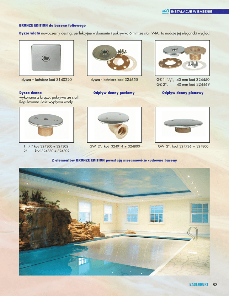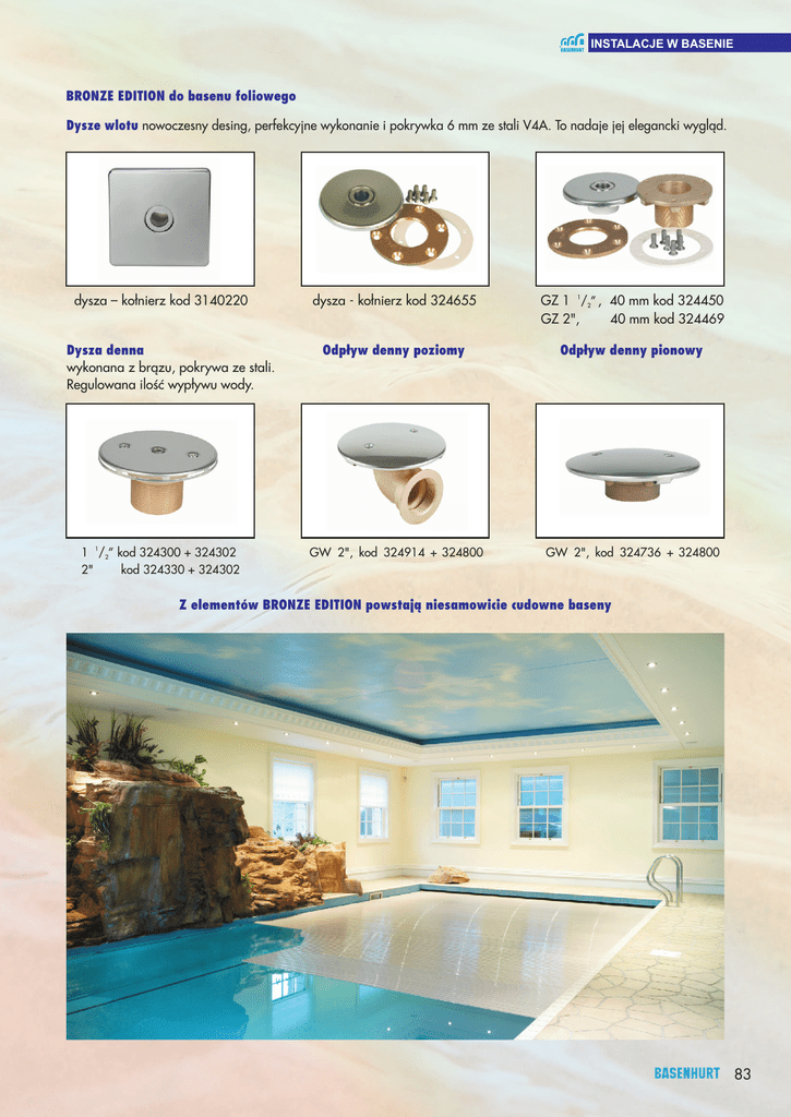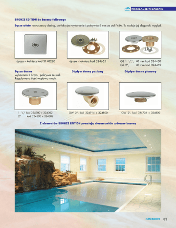 INSTALACJE W BASENIE BRONZE EDITION do basenu foliowego Dysze wlotu nowoczesny desing, perfekcyjne wykonanie i pokrywka 6 mm ze stali V4A. To nadaje jej elegancki wygląd. dysza – kołnierz kod 3140220 Dysza denna wykonana z brązu, pokrywa ze stali. Regulowana ilość wypływu wody. 1 1/2” kod 324300 + 324302 2" kod 324330 + 324302 dysza - kołnierz kod 324655 GZ 1 1/2” , 40 mm kod 324450 GZ 2", 40 mm kod 324469 Odpływ denny poziomy Odpływ denny pionowy GW 2", kod 324914 + 324800 GW 2", kod 324736 + 324800 Z elementów BRONZE EDITION powstają niesamowicie cudowne baseny 83