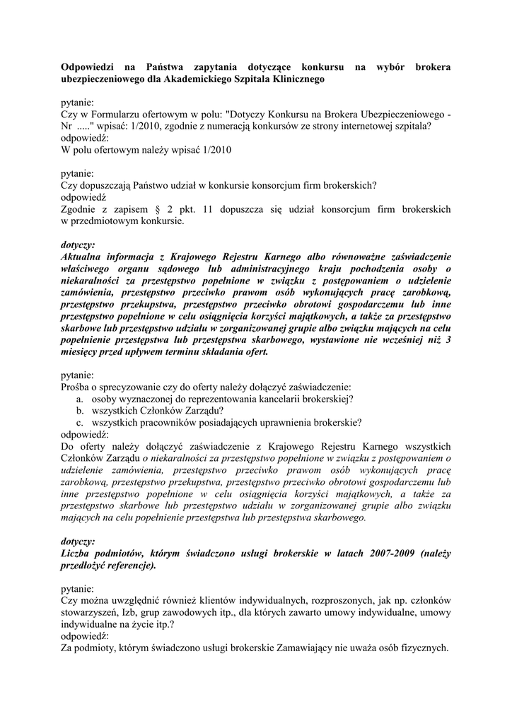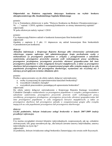 Odpowiedzi na Państwa zapytania dotyczące konkursu ubezpieczeniowego dla Akademickiego Szpitala Klinicznego na wybór brokera pytanie: Czy w Formularzu ofertowym w polu: "Dotyczy Konkursu na Brokera Ubezpieczeniowego Nr ....." wpisać: 1/2010, zgodnie z numeracją konkursów ze strony internetowej szpitala? odpowiedź: W polu ofertowym należy wpisać 1/2010 pytanie: Czy dopuszczają Państwo udział w konkursie konsorcjum firm brokerskich? odpowiedź Zgodnie z zapisem § 2 pkt. 11 dopuszcza się udział konsorcjum firm brokerskich w przedmiotowym konkursie. dotyczy: Aktualna informacja z Krajowego Rejestru Karnego albo równoważne zaświadczenie właściwego organu sądowego lub administracyjnego kraju pochodzenia osoby o niekaralności za przestępstwo popełnione w związku z postępowaniem o udzielenie zamówienia, przestępstwo przeciwko prawom osób wykonujących pracę zarobkową, przestępstwo przekupstwa, przestępstwo przeciwko obrotowi gospodarczemu lub inne przestępstwo popełnione w celu osiągnięcia korzyści majątkowych, a także za przestępstwo skarbowe lub przestępstwo udziału w zorganizowanej grupie albo związku mających na celu popełnienie przestępstwa lub przestępstwa skarbowego, wystawione nie wcześniej niż 3 miesięcy przed upływem terminu składania ofert. pytanie: Prośba o sprecyzowanie czy do oferty należy dołączyć zaświadczenie: a. osoby wyznaczonej do reprezentowania kancelarii brokerskiej? b. wszystkich Członków Zarządu? c. wszystkich pracowników posiadających uprawnienia brokerskie? odpowiedź: Do oferty należy dołączyć zaświadczenie z Krajowego Rejestru Karnego wszystkich Członków Zarządu o niekaralności za przestępstwo popełnione w związku z postępowaniem o udzielenie zamówienia, przestępstwo przeciwko prawom osób wykonujących pracę zarobkową, przestępstwo przekupstwa, przestępstwo przeciwko obrotowi gospodarczemu lub inne przestępstwo popełnione w celu osiągnięcia korzyści majątkowych, a także za przestępstwo skarbowe lub przestępstwo udziału w zorganizowanej grupie albo związku mających na celu popełnienie przestępstwa lub przestępstwa skarbowego. dotyczy: Liczba podmiotów, którym świadczono usługi brokerskie w latach 2007-2009 (należy przedłożyć referencje). pytanie: Czy można uwzględnić również klientów indywidualnych, rozproszonych, jak np. członków stowarzyszeń, Izb, grup zawodowych itp., dla których zawarto umowy indywidualne, umowy indywidualne na życie itp.? odpowiedź: Za podmioty, którym świadczono usługi brokerskie Zamawiający nie uważa osób fizycznych. pytanie: Za jaki okres należy podać wykaz podmiotów, którym świadczono usługi brokerskie w latach 2007-2009 (należy dołączyć referencje)? odpowiedź: W formularzu ofertowym należy przedstawić wykaz za lata 2007-2009, tj. 3 lata. pytanie: czy wykaz ten dotyczy tylko podmiotów, od których otrzymano list referencyjny. odpowiedź: Wykonawca będzie brał pod uwagę wyłącznie ilości podmiotów, którym świadczono usługi brokerskie, do których dołączone zostaną referencje. dotyczy: Liczba podmiotów z branży ochrony zdrowia, którym świadczono usługi brokerskie w latach 2007-2009 (należy przedłożyć referencje). pytanie: dotyczy: Liczba podmiotów z branży ochrony zdrowia, którym świadczono usługi brokerskie w latach 2007-2009 (należy przedłożyć referencje). Czy można uwzględnić również klientów indywidualnych, rozproszonych, jak np. członków stowarzyszeń, Izb, grup zawodowych itp., dla których zawarto umowy indywidualne, umowy indywidualne na życie itp.? odpowiedź: Za podmioty, którym świadczono usługi brokerskie Zamawiający nie uważa osób fizycznych. pytanie: Za jaki okres należy podać wykaz podmiotów, którym świadczono usługi brokerskie w latach 2007-2009 (należy dołączyć referencje)? odpowiedź: W formularzu ofertowym należy przedstawić wykaz za lata 2007-2009, tj. 3 lata. pytanie: Czy wykaz ten dotyczy tylko podmiotów, od których otrzymano list referencyjny? odpowiedź: Wykonawca będzie brał pod uwagę wyłącznie ilości podmiotów z branży ochrony zdrowia, którym świadczono usługi brokerskie, do których dołączone zostaną referencje. pytanie: czy intencją Zamawiającego jest otrzymanie liczby wszystkich rodzajów zakładów opieki zdrowotnej, dla których oferent świadczył usługi brokerskie tj. także indywidualnych praktyk lekarskich, praktyk pielęgniarskich, praktyk lekarza rodzinnego i przychodni publicznych i niepublicznych, czy też intencją Zamawiającego jest otrzymanie liczby zakładów opieki zdrowotnej lecznictwa zamkniętego dla których oferent świadczył usługi brokerskie? odpowiedź: Należy podać liczbę wszystkich rodzajów podmiotów z branży ochrony zdrowia, dla których świadczyli Państwo usługi brokerskie. dotyczy: Ilość przygotowywanych postępowań na ubezpieczenie OC i majątkowe w tym dla firm z branży ochrony zdrowia, zgodnie z ustawą Prawo zamówień publicznych pytanie: Jakiego okresu dotyczy zapytanie? odpowiedź: Ilość przygotowanych postępowań na ubezpieczenie OC i majątkowe w tym dla firm z branży ochrony zdrowia, zgodnie z Ustawą Prawo zamówień publicznych dotyczy lat 2007-2009 tj. okresu ostatnich 3 lat. pytanie: Czy intencją Zamawiającego jest otrzymanie wykazu wszystkich zakładów opieki zdrowotnej, dla których świadczono usługi brokerskie, czy tez intencją Zamawiającego jest otrzymanie wykazu placówek lecznictwa zamkniętego, zobowiązanych do stosowania ustawy Prawo zamówień publicznych, którym świadczono w okresie ostatnich 4 lat kompleksową obsługę brokerską? odpowiedź: Wykaz wszystkich podmiotów z dziedziny ochrony zdrowia, dla których świadczono kompleksową obsługę brokerską w okresie ostatnich 3 lat. pytanie: czy intencją Zamawiającego jest ocena ilości postępowań przetargowych dla wszystkich rodzajów podmiotów, czy też intencją Za