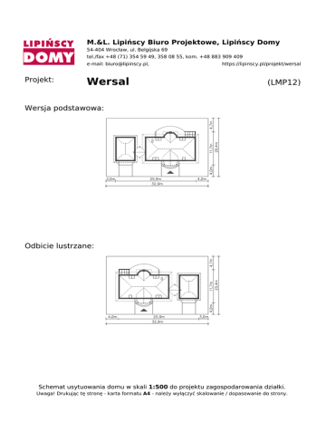 M.&L. Lipińscy Biuro Projektowe, Lipińscy Domy 54-404 Wrocław, ul. Belgijska 69 tel./fax +48 (71) 354 59 49, 358 08 55, kom. +48 883 909 409 e-mail: [email protected], Projekt: Wersal https://lipinscy.pl/projekt/wersal (LMP12) Wersja podstawowa: Odbicie lustrzane: Schemat usytuowania domu w skali 1:500 do projektu zagospodarowania działki. Uwaga! Drukując tę stronę - karta formatu A4 - należy wyłączyć skalowanie / dopasowanie do strony. Powered by TCPDF (www.tcpdf.org)