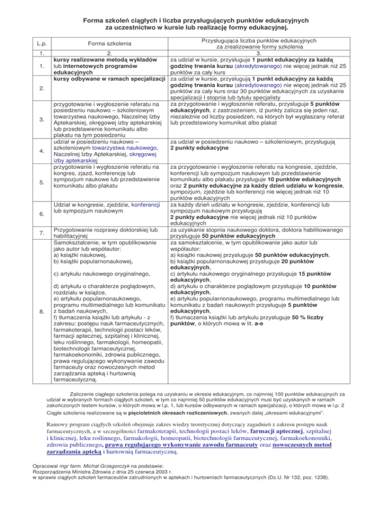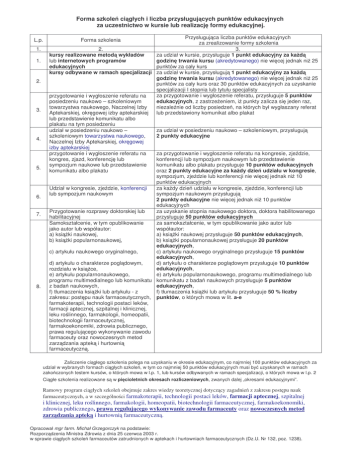 Forma szkole ci głych i liczba przysługuj cych punktów edukacyjnych za uczestnictwo w kursie lub realizacj formy edukacyjnej. L.p. 1. 1. 2. 3. 4. 5. 6. 7. 8. Przysługuj ca liczba punktów edukacyjnych za zrealizowanie formy szkolenia 2. 3. kursy realizowane metod wykładów za udział w kursie, przysługuje 1 punkt edukacyjny za ka d lub internetowych programów godzin trwania kursu (akredytowanego) nie wi cej jednak ni 25 edukacyjnych punktów za cały kurs kursy odbywane w ramach specjalizacji za udział w kursie, przysługuj 1 punkt edukacyjny za ka d godzin trwania kursu (akredytowanego) nie wi cej jednak ni 25 punktów za cały kurs oraz 30 punktów edukacyjnych za uzyskanie specjalizacji I stopnia lub tytułu specjalisty za przygotowanie i wygłoszenie referatu, przysługuje 5 punktów przygotowanie i wygłoszenie referatu na edukacyjnych, z zastrze eniem, i punkty zalicza si jeden raz, posiedzeniu naukowo – szkoleniowym towarzystwa naukowego, Naczelnej Izby niezale nie od liczby posiedze , na których był wygłaszany referat Aptekarskiej, okr gowej izby aptekarskiej lub przedstawiony komunikat albo plakat lub przedstawienie komunikatu albo plakatu na tym posiedzeniu udział w posiedzeniu naukowo – za udział w posiedzeniu naukowo – szkoleniowym, przysługuj 2 punkty edukacyjne szkoleniowym towarzystwa naukowego, Naczelnej Izby Aptekarskiej, okr gowej izby aptekarskiej przygotowanie i wygłoszenie referatu na za przygotowanie i wygłoszenie referatu na kongresie, zje dzie, kongres, zjazd, konferencj lub konferencji lub sympozjum naukowym lub przedstawienie komunikatu albo plakatu przysługuje 10 punktów edukacyjnych sympozjum naukowe lub przedstawienie oraz 2 punkty edukacyjne za ka dy dzie udziału w kongresie, komunikatu albo plakatu sympozjum, zje dzie lub konferencji nie wi cej jednak ni 10 punktów edukacyjnych Udział w kongresie, zje dzie, konferencji za ka dy dzie udziału w kongresie, zje dzie, konferencji lub lub sympozjum naukowym sympozjum naukowym przysługuj 2 punkty edukacyjne nie wi cej jednak ni 10 punktów edukacyjnych Przygotowanie rozprawy doktorskiej lub za uzyskanie stopnia naukowego doktora, doktora habilitowanego przysługuje 50 punktów edukacyjnych habilitacyjnej Samokształcenie, w tym opublikowanie za samokształcenie, w tym opublikowanie jako autor lub jako autor lub współautor: współautor: a) ksi ki naukowej przysługuje 50 punktów edukacyjnych, a) ksi ki naukowej, b) ksi ki popularnonaukowej przysługuje 20 punktów b) ksi ki popularnonaukowej, edukacyjnych, c) artykułu naukowego oryginalnego przysługuje 15 punktów c) artykułu naukowego oryginalnego, edukacyjnych, d) artykułu o charakterze pogl dowym przysługuje 10 punktów d) artykułu o charakterze pogl dowym, edukacyjnych, rozdziału w ksi ce, e) artykułu popularnonaukowego, e) artykułu popularnonaukowego, programu multimedialnego lub programu multimedialnego lub komunikatu komunikatu z bada naukowych przysługuje 5 punktów edukacyjnych, z bada naukowych, f) tłumaczenia ksi ki lub artykułu przysługuje 50 % liczby f) tłumaczenia ksi ki lub artykułu - z zakresu: post pu nauk farmaceutycznych, punktów, o których mowa w lit. a-e farmakoterapii, technologii postaci leków, farmacji aptecznej, szpitalnej i klinicznej, leku ro linnego, farmakologii, homeopatii, biotechnologii farmaceutycznej, farmakoekonomiki, zdrowia publicznego, prawa reguluj cego wykonywanie zawodu farmaceuty oraz nowoczesnych metod zarz dzania aptek i hurtowni farmaceutyczn . Forma szkolenia Zaliczenie ci głego szkolenia polega na uzyskaniu w okresie edukacyjnym, co najmniej 100 punktów edukacyjnych za udział w wybranych formach ci głych szkole , w tym co najmniej 50 punktów edukacyjnych musi by uzyskanych w ramach zako czonych testem kursów, o których mowa w l.p. 1, lub kursów odbywanych w ramach specjalizacji, o których mowa w l.p. 2 Ci głe szkolenia realizowane s w pi cioletnich okresach rozliczeniowych, zwanych dalej „okresami edukacyjnymi”. Ramowy program ci głych szkole obejmuje zakres wiedzy teoretycznej dotycz cy zagadnie z zakresu post pu nauk farmaceutycznych, a w szczególno ci farmakoterapii, technologii postaci leków, farmacji aptecznej, szpitalnej i klinicznej, leku ro linnego, farmakologii, homeopatii, biotechnologii farmaceutycznej, farmakoekonomiki, zdrowia publicznego, prawa reguluj cego wykonywanie zawodu farmaceuty oraz nowoczesnych metod zarz dzania aptek i hurtowni farmaceutyczn . Opracował mgr farm. Michał Grzegorczyk na podstawie: Rozporz dzenia Ministra Zdrowia z dnia 25 czerwca 2003 r. w sprawie ci głych szkole farmaceutów zatrudnionych w aptekach i hurtowniach farmaceutycznych (Dz.U. Nr 132, poz. 1238).