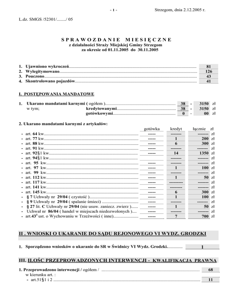 -1- Strzegom, dnia 2.12.2005 r. L.dz. SMGS /52301/......../ 05 SPRAWOZDANIE MIESIĘCZNE z działalności Straży Miejskiej Gminy Strzegom za okresie od 01.11.2005 do 30.11.2005 1. 2. 3. 4. Ujawniono wykroczeń................................................................................................................ Wylegitymowano......................................................................................................................... Pouczono...................................................................................................................................... Skontrolowano pojazdów........................................................................................................... 81 126 43 41 I. POSTĘPOWANIA MANDATOWE 1. Ukarano mandatami karnymi ( ogółem ).............................................................. kredytowanymi.................................................... w tym; gotówkowymi....................................................... 38 38 0 - 3150 zł 3150 zł 00 zł 2. Ukarano mandatami karnymi z artykułów: - art. 64 kw................................................................................... art. 77 kw................................................................................... art. 88 kw................................................................................... art. 91 kw................................................................................... art. 92§1 kw.............................................................................. art. 94§1 kw.............................................................................. art. 95 kw................................................................................. art. 97 kw................................................................................. art. 99 kw................................................................................. art. 112 kw................................................................................. art. 117 kw................................................................................. art. 141 kw................................................................................. art. 145 kw................................................................................. § 7 Uchwały nr 29/04 ( czystość )........................................... § 9 Uchwały nr 29/04 ( spalanie śmieci) ................................ § 27 lit. C Uchwały nr 29/04 (nie usuw. zaniecz. zwierz )...... Uchwał nr 86/04 ( handel w miejscach niedozwolonych ).... art.431 ust. o Wychowaniu w Trzeźwości ( inne)...................... gotówka --------------------------------------------------------------------- kredyt ------1 6 ------14 ------------1 ------1 ---------------6 1 ------1 ------7 łącznie ------200 300 ------1350 ------------100 ------50 ------------300 100 ------50 ------700 zł zł zł zł zł zł zł zł zł zł zł zł zł zł zł zł zł zł zł II . WNIOSKI O UKARANIE DO SĄDU REJONOWEGO VI WYDZ. GRODZKI 1. Sporządzono wniosków o ukaranie do SR w Świdnicy VI Wydz. Grodzki.............. 1 III. ILOŚC PRZEPROWADZONYCH INTERWENCJI - KWALIFIKACJA PRAWNA 1. Przeprowadzono interwencji / ogółem / …................................................................................... w kierunku art. : - art.51§1 i 2 ................................................................................................................................. 68 11 - art. 72 kw.................................................................................................................................... art. 77 kw................................................................................................................................... - art. 90 kw................................................................................................................................... - art. 97 kw.................................................................................................................................... - art.119 ........................................................................................................................................ - art.124 ........................................................................................................................................ - art.140 ....................................................................................................................................... - art. 145 kw.................................................................................................................................. - § 7 Uchwała 29/04 ( czystość ).................................................................................................. - Uchwała 86/04 ( handel w m. niedozwolonym) ...................................................................... - Ustawa o Wychowaniu w Trzeźwości........................................................................................ - Asysty ( Och. Środ, OPS, BERL, inni )...................................................................................... 1 10 5 1 2 1 6 3 17 1 2 8 Z dokonanej analizy przeprowadzonych interwencji przez patrole SM wynika, 9 miejskim przeprowadzono............................................................................................... 9 wiejskim przeprowadzono................................................................................................ 54 14 IV. ZABEZPIECZANIE IMPREZ MASOWYCH ( organizator ) : 9 w dniu 9 w dniu 9 w dniu V. 10.11.2005 r 11.11.2005 r 26.11.2005 r w godz. w godz. w godz. 6.00 - 17.00 9.30 - 12.30 17.00-21.00 Honor. Ob. Miasta gen .broni S. Targoszowi Zabezpieczanie procesji „Koncert Andrzejkowy” SCK UŻYTKOWANIE SAMOCHODU SŁUŻBOWEGO. Łącznie samochód służbowy przejechał........................................................................... 2257 km 9 obsługa konwojów ..............