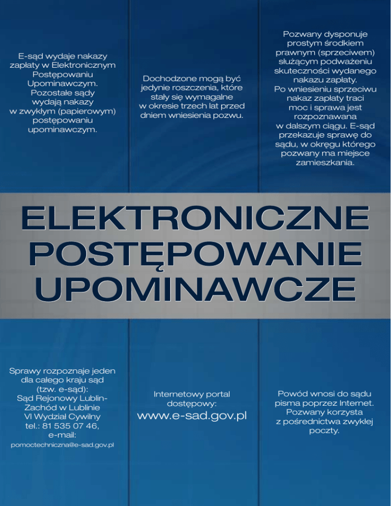 E-sąd wydaje nakazy zapłaty w Elektronicznym Postępowaniu Upominawczym. Pozostałe sądy wydają nakazy w zwykłym (papierowym) postępowaniu upominawczym. Dochodzone mogą być jedynie roszczenia, które stały się wymagalne w okresie trzech lat przed dniem wniesienia pozwu. Pozwany dysponuje prostym środkiem prawnym (sprzeciwem) służącym podważeniu skuteczności wydanego nakazu zapłaty. Po wniesieniu sprzeciwu nakaz zapłaty traci moc i sprawa jest rozpoznawana w dalszym ciągu. E-sąd przekazuje sprawę do sądu, w okręgu którego pozwany ma miejsce zamieszkania. Elektroniczne Postępowanie Upominawcze Sprawy rozpoznaje jeden dla całego kraju sąd (tzw. e-sąd): Sąd Rejonowy LublinZachód w Lublinie VI Wydział Cywilny tel.: 81 535 07 46, e-mail: [email protected] Internetowy portal dostępowy: www.e-sad.gov.pl Powód wnosi do sądu pisma poprzez Internet. Pozwany korzysta z pośrednictwa zwykłej poczty. Zapłacić powodowi kwotę wskazaną w nakazie zapłaty – sprawa zakończy się, a w razie gdyby powód wystąpił ponownie z takim samym żądaniem należy powołać się przed sądem na fakt uiszczenia zapłaty zgodnie z nakazem zapłaty. W sytuacji otrzymania nakazu zapłaty, po rozważeniu sprawy, według swojej oceny i uznania, należy zachować się w jeden ze wskazanych sposobów: Złożyć do e-sądu w ciągu 2 tygodni sprzeciw – wtedy nakaz zapłaty utraci moc i nie będzie wywoływał skutków prawnych. Sprawa zostanie przekazana z e-sądu do sądu, w którego okręgu pozwany ma miejsce zamieszkania i będzie rozpoznawana w innym postępowaniu. W razie niepodjęcia żadnej czynności – nakaz zapłaty uprawomocni się po 2 tygodniach od daty doręczenia. Sąd nada nakazowi z urzędu klauzulę wykonalności, a powód prawdopodobnie złoży do komornika wniosek o wszczęcie egzekucji. Komornik poucza dłużnika o możliwości wniesienia środka zaskarżenia na postanowienie o nadaniu klauzuli wykonalności oraz o treści regulacji dotyczących doręczeń i sprzeciwu. W przypadku jeśli bez swojej winy nie złożono w ciągu 2 tygodni sprzeciwu, pomimo takiego zamiaru – należy złożyć do e-sądu w ciągu tygodnia od ustania przyczyny uchybienia terminowi wniosek o przywrócenie terminu do wniesienia sprzeciwu, uprawdopodobniając okoliczności uzasadniające wniosek. Jednocześnie z wnioskiem koniecznie należy złożyć sprzeciw. Pozew zawiera dane osobowe powoda i pozwanego: adresy oraz numery PESEL lub inne stosowne numery identyfikacyjny (np. numer NIP). Sąd może skazać na grzywnę powoda, który w złej wierze lub wskutek niezachowania należytej staranności podał nieprawidłowe dane osobowe. Na wniosek strony sąd albo referendarz sądowy wydaje zaświadczenie, w którym stwierdza, że nakaz zapłaty został „uznany za doręczony” na oznaczony adres w razie niemożności rzeczywistego (tradycyjnego) doręczenia. Komornik zawiesza na wniosek dłużnika postępowanie, jeżeli dłużnik przedstawi takie zaświadczenie i wynika z niego, że nakaz zapłaty został doręczony na inny adres aniżeli miejsce zamieszkania dłużnika ustalone w postępowaniu egzekucyjnym. Zawieszenie postępowania egzekucyjnego nie wyłącza możliwości podejmowania przez komornika czynności mających na celu wykonanie w przyszłości tytułu wykonawczego, nie wyłączając zajęcia majątku dłużnika. www.e-sad.gov.pl