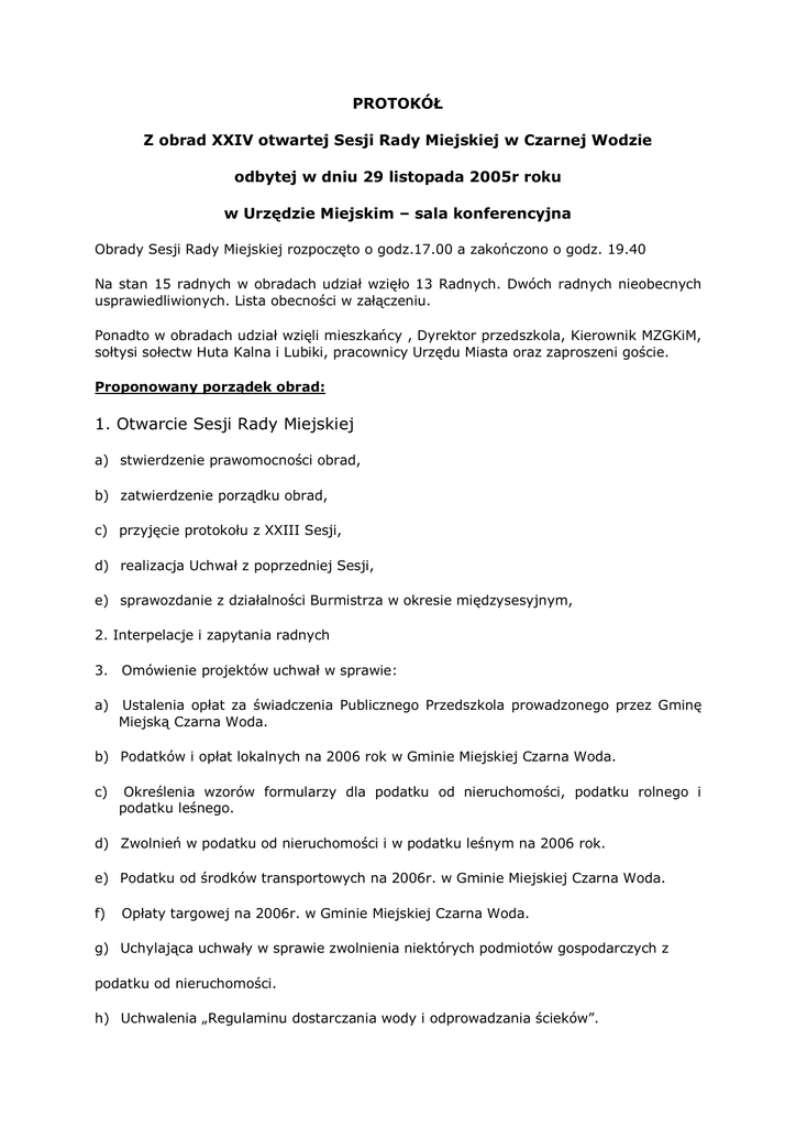 PROTOKÓŁ Z obrad XXIV otwartej Sesji Rady Miejskiej w Czarnej Wodzie odbytej w dniu 29 listopada 2005r roku w Urzędzie Miejskim – sala konferencyjna Obrady Sesji Rady Miejskiej rozpoczęto o godz.17.00 a zakończono o godz. 19.40 Na stan 15 radnych w obradach udział wzięło 13 Radnych. Dwóch radnych nieobecnych usprawiedliwionych. Lista obecności w załączeniu. Ponadto w obradach udział wzięli mieszkańcy , Dyrektor przedszkola, Kierownik MZGKiM, sołtysi sołectw Huta Kalna i Lubiki, pracownicy Urzędu Miasta oraz zaproszeni goście. Proponowany porządek obrad: 1. Otwarcie Sesji Rady Miejskiej a) stwierdzenie prawomocności obrad, b) zatwierdzenie porządku obrad, c) przyjęcie protokołu z XXIII Sesji, d) realizacja Uchwał z poprzedniej Sesji, e) sprawozdanie z działalności Burmistrza w okresie międzysesyjnym, 2. Interpelacje i zapytania radnych 3. Omówienie projektów uchwał w sprawie: a) Ustalenia opłat za świadczenia Publicznego Przedszkola prowadzonego przez Gminę Miejską Czarna Woda. b) Podatków i opłat lokalnych na 2006 rok w Gminie Miejskiej Czarna Woda. c) Określenia wzorów formularzy dla podatku od nieruchomości, podatku rolnego i podatku leśnego. d) Zwolnień w podatku od nieruchomości i w podatku leśnym na 2006 rok. e) Podatku od środków transportowych na 2006r. w Gminie Miejskiej Czarna Woda. f) Opłaty targowej na 2006r. w Gminie Miejskiej Czarna Woda. g) Uchylająca uchwały w sprawie zwolnienia niektórych podmiotów gospodarczych z podatku od nieruchomości. h) Uchwalenia „Regulaminu dostarczania wody i odprowadzania ścieków”. i) l) Zmian budżetu Gminy Miejskiej Czarna Woda na 2005 rok. j) Postępowania o udzielenie zamówienia publicznego na wykonywanie obsługi bankowej budżetu Gminy Miejskiej Czarna Woda. k) Uchylenia Uchwały Nr XXIX/236/2001 z dnia 6 listopada 2001r. w sprawie powołania „Sztabu Akcji Zimowej”. Programu i trybu współpracy Gminy Miejskiej Czarna Woda z organizacjami pozarządowymi oraz podmiotami prowadzącymi działalność pożytku publicznego na 2006 rok. 4. Wolne wnioski. 5. Zakończenie obrad. PUNKT 1 Otwarcia obrad XXIV – otwartej Sesji Rady Miejskiej dokonał Przewodniczący Rady Miejskiej – J. Bochenek. a) Powitał Radnych , gości i pozostałe osoby biorące udział w Sesji . Stwierdził prawomocność obrad. Na stan 15 radnych obecnych było 13. Lista obecności stanowi załącznik do protokołu. b) Przewodniczący Rady Miejskiej odczytał proponowany porządek obrad Sesji. Radni nie wnieśli uwag do proponowanego porządku obrad i przyjęli go jednogłośnie. c) Przewodniczący Rady oświadczył, że protokół z obrad XXIII Sesji został przez niego sprawdzony . Radni w wyniku głosowania przyjęli protokół 11 głosami przy 2 głosach wstrzymujących się. d) Przewodniczący przedstawił informację z realizacji Uchwał podjętych na ostatniej Sesji. Informacja z realizacji Uchwał stanowi załącznik do protokołu. e) Burmistrz Miasta złożył sprawozdanie z realizacji zadań jakie wykonał w okresie międzysesyjnym. Sprawozdanie jest załącznikiem do protokołu. PUNKT 2 Interpelacje i zapytania radnych Radna Maria Sobczak zapytała w jaki sposób powoływane są komisje wyborcze? Burmistrz odpowiedział – Komitety Wyborcze zgłaszają kandydatów do komisji spośród tych osób powoływane są komisje, w każdej komisji jest jedna osoba odpowiedzialna z urzędu powołana przeze mnie. To nie my ustalamy kto jest w komisji, o tym mówi ordynacja wyborcza. Sebastian Schmidt zadał pytanie – kto zleca posypywanie piaskiem ulic i chodników? Odpowiedział Kierownik MZGKiM Andrzej Gąsiorowski – jeżeli jest potrzeba wysyłamy na ulicę pług a następnie posypujemy piaskiem ulice i chodniki Burmistrz dopowiedział jeżeli jest taka konieczność (ślisko) należy posypywać wcześniej piaskiem ulice i chodniki. Radna Maria Sobczak poruszyła sprawę stomatologa, którego od jakiegoś czasu nie ma w Czarnej Wodzie Burmistrz odpowiedział – nie ma stomatologa ponieważ są trudności z pozyskaniem takiego lekarza. Wcześniej zwracaliśmy się w tej sprawie z pismem do „Polmedu” i taką właśnie otrzymaliśmy odpowiedź. Jeżeli są chętni stomatolodzy, którzy chcieliby prowadzić tu działalność powinni skontaktować się z Prezesem „Polmedu”. PUNKT 3 a) projekt uchwały w sprawie ustalenia opłat za świadczenia Publicznego Przedszkola prowadzonego przez Gminę Miejską Czarna Woda omówiła Dyrektor przedszkola Maria Rekowska. W porozumieniu i za zgodą rodziców zwiększyliśmy o stopę inflacji proponowaną stawkę za pobyt dziecka w przedszkolu. Przewodniczący Rady odczytał wyciąg z protokołu w części dotyczącej omawianej informacji ze wspólnego posiedzenia komisji problemowych Rady Miasta. Wyciąg stanowi załącznik do protokołu. Uwag nie wniesiono. Przewodniczący Rady odczytał projekt Uchwały w sprawie ustalenia opłat za świadczenia Publicznego Przedszkola prowadzonego przez Gminę Miejską Czarna Woda Uchwałę poddano głosowaniu. Radni w wyniku głosowania Uchwałę podjęli jednogłośnie. Uchwała Nr XXIV/165/05 w sprawie ustalenia opłat za świadczenia Publicznego Przedszkola prowadzonego przez Gminę Miejską Czarna Woda stanowi załącznik do protokołu. b) projekt uchwały w sprawie podatków i opłat lokalnych na 2006 rok w Gminie Miejskiej Czarna Woda przygotowała Sabina Freitag. Przewodniczący Rady odczytał wyciąg z protokołu w części dotyczącej omawianej informacji ze wspólnego posiedzenia komisji problemowych Rady Miasta. Wyciąg stanowi załącznik do protokołu. Uwag nie wniesiono. Przewodniczący Rady odczytał projekt Uchwały w sprawie podatków i opłat lokalnych na 2006 rok w Gminie Miejskiej Czarna Woda Uchwałę poddano głosowaniu. Radni w wyniku głosowania Uchwałę przyjęli 7 głosami ZA przy 6 gł. wstrzymujących się. Uchwała Nr XXIV/166/05 w sprawie podatków i opłat lokalnych na 2006 rok w Gminie Miejs