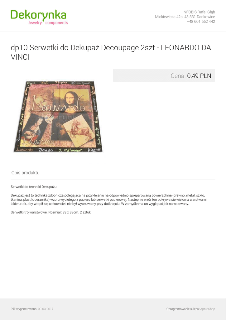 INFOBIS Rafał Głąb Mickiewicza 42a, 43-331 Dankowice +48 601 662 442 dp10 Serwetki do Dekupaż Decoupage 2szt - LEONARDO DA VINCI Cena: 0,49 PLN Opis produktu Serwetki do techniki Dekupażu. Dekupaż jest to technika zdobnicza polegająca na przyklejaniu na odpowiednio spreparowaną powierzchnię (drewno, metal, szkło, tkanina, plastik, ceramika) wzoru wyciętego z papieru lub serwetki papierowej. Następnie wzór ten pokrywa się wieloma warstwami lakieru tak, aby wtopił się całkowicie i nie był wyczuwalny przy dotknięciu. W zamyśle ma on wyglądać jak namalowany. Serwetki trójwarstwowe. Rozmiar: 33 x 33cm. 2 sztuki. Plik wygenerowano: 09-03-2017 Oprogramowanie sklepu: AptusShop INFOBIS Rafał Głąb Mickiewicza 42a, 43-331 Dankowice +48 601 662 442 Galeria Plik wygenerowano: 09-03-2017 Powered by TCPDF (www.tcpdf.org) Oprogramowanie sklepu: AptusShop