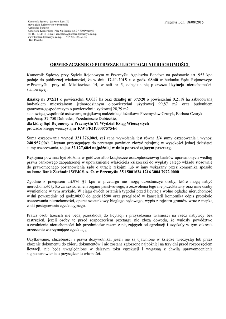 Komornik Sądowy (dawniej Rew.III) przy Sądzie Rejonowym w Przemyślu Agnieszka Bandosz Kancelaria Komornicza Plac Na Bramie 12, 37-700 Przemyśl tel. 16 - 6751413 e-mail: [email protected] www.komornikprzemysl.com.pl NIP 795-145-60-45 Km 1969/14 Przemyśl, dn. 18/08/2015 OBWIESZCZENIE O PIERWSZEJ LICYTACJI NIERUCHOMOŚCI Komornik Sądowy przy Sądzie Rejonowym w Przemyślu Agnieszka Bandosz na podstawie art. 953 kpc podaje do publicznej wiadomości, że w dniu 17-11-2015 r. o godz. 08:40 w budunku Sądu Rejonowego w Przemyślu, przy ul. Mickiewicza 14, w sali nr 5, odbędzie się pierwsza licytacja nieruchomości stanowiącej: działkę nr 372/21 o powierzchni 0,0038 ha oraz działkę nr 372/20 o powierzchni 0,2118 ha zabudowaną budynkiem mieszkalnym jednorodzinnym o powierzchni użytkowej 99,87 m2 oraz budynkiem garażowo-gospodarczym o powierzchni uzytkowej 28,29 m2 stanowiącą wspólność ustawową majątkową małżeńską dłużników: Przemysław Czuryk, Barbara Czuryk położoną: 37-750 Dubiecko, Przedmieście Dubieckie, dla której Sąd Rejonowy w Przemyślu VI Wydział Ksiąg Wieczystych prowadzi księgę wieczystą nr KW PR1P/00075754/6 . Suma oszacowania wynosi 321 276,00zł, zaś cena wywołania jest równa 3/4 sumy oszacowania i wynosi 240 957,00zł. Licytant przystępujący do przetargu powinien złożyć rękojmię w wysokości jednej dziesiątej sumy oszacowania, to jest 32 127,60zł najpóźniej w dniu poprzedzającym przetarg. Rękojmia powinna być złożona w gotówce albo książeczce oszczędnościowej banków uprawnionych według prawa bankowego zaopatrzonej w upoważnienie właściciela książeczki do wypłaty całego wkładu stosownie do prawomocnego postanowienia sądu o utracie rękojmi lub w inny wskazany przez komornika sposób: na konto Bank Zachodni WBK S.A. O. w Przemyślu 35 15001634 1216 3004 7972 0000 Zgodnie z przepisem art.976 §1 kpc w przetargu nie mogą uczestniczyć osoby, które mogą nabyć nieruchomość tylko za zezwoleniem organu państwowego, a zezwolenia tego nie przedstawiły oraz inne osoby wymienione w tym artykule. W ciągu dwóch ostatnich tygodni przed licytacją wolno oglądać nieruchomość w dni powszednie od godz.08:00 do godz.15:00 oraz przeglądać w kancelarii komornika odpis protokoło oszacowania nieruchomości, operat szacunkowy biegłego sądowego, wypis z rejestru gruntów wraz z mapką z akt postępowania egzekucyjnego. Prawa osób trzecich nie będą przeszkodą do licytacji i przysądzenia własności na rzecz nabywcy bez zastrzeżeń, jeżeli osoby te przed rozpoczęciem przetargu nie złożą dowodu, że wniosły powództwo o zwolnienie nieruchomości lub przedmiotów razem z nią zajętych od egzekucji i uzyskały w tym zakresie orzeczenie wstrzymujące egzekucję. Użytkowanie, służebności i prawa dożywotnika, jeżeli nie są ujawnione w księdze wieczystej lub przez złożenie dokumentu do zbioru dokumentów i nie zostaną zgłoszone najpóźniej na trzy dni przed rozpoczęciem licytacji, nie będą uwzględnione w dalszym toku egzekucji i wygasną z chwilą uprawomocnienia się postanowienia o przysądzeniu własności.