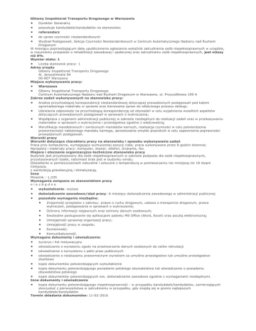 Główny Inspektorat Transportu Drogowego w Warszawie Dyrektor Generalny poszukuje kandydatek/kandydatów na stanowisko: referendarz do spraw czynności niestandardowych Wydział Postępowań, Sekcja Czynności Niestandardowych w Centrum Automatycznego Nadzoru nad Ruchem Drogowym W miesiącu poprzedzającym datę upublicznienia ogłoszenia wskaźnik zatrudnienia osób niepełnosprawnych w urzędzie, w rozumieniu przepisów o rehabilitacji zawodowej i społecznej oraz zatrudnianiu osób niepełnosprawnych, jest niższy niż 6%. Wymiar etatu: 1 Liczba stanowisk pracy: 1 Adres urzędu Główny Inspektorat Transportu Drogowego Al. Jerozolimskie 94 00-807 Warszawa Miejsce wykonywania pracy: Warszawa Analiza przychodzącej korespondencji niestandardowej dotyczącej prowadzonych postępowań pod katem zgromadzonego materiału w sprawie oraz kierowanie spraw do właściwego procesu obsługi; Udzielania odpowiedzi na przychodzącą korespondencję od obywateli w celu wyjaśnienia wszelkich aspektów dotyczących prowadzonych postępowań w sprawach o wykroczenia; Współpraca z organami administracji publicznej w zakresie niezbędnym do realizacji zadań oraz w przekazywaniu materiałów w sprawach o wykroczenia i przestępstwa zgodnie z właściwością; Główny Inspektorat Transportu Drogowego Centrum Automatycznego Nadzoru nad Ruchem Drogowym w Warszawie, ul. Przyczółkowa 109 A Zakres zadań wykonywanych na stanowisku pracy: Weryfikacja nieodebranych i zwróconych mandatów karnych, realizacja czynności w celu potwierdzenia prawomocności nałożonego mandatu karnego, sprostowania omyłek pisarskich w celu zapewnienia poprawności prowadzonych postępowań. Warunki pracy Warunki dotyczące charakteru pracy na stanowisku i sposobu wykonywania zadań Praca przy komputerze, wymagająca wymuszonej pozycji ciała; praca wykonywana przez 8 godzin dziennie; Narzędzia i materiały pracy: komputer, skaner, telefon, drukarka, fax. Miejsce i otoczenie organizacyjno-techniczne stanowiska pracy Budynek jest przystosowany dla osób niepełnosprawnych w zakresie podjazdu dla osób niepełnosprawnych, przystosowanych toalet, natomiast brak jest w budynku windy; Oświetlenie w pomieszczeniach naturalne i sztuczne z temperaturą w pomieszczeniu nie mniejszą niż 18 stopni Celsjusza, z wentylacją grawitacyjną i klimatyzacją. Inne Mnożnik : 1,335 Wymagania związane ze stanowiskiem pracy niezbędne wykształcenie: wyższe doświadczenie zawodowe/staż pracy: 6 miesięcy doświadczenia zawodowego w administracji publicznej pozostałe wymagania niezbędne: Znajomość przepisów z zakresu: prawo o ruchu drogowym, ustawa o transporcie drogowym, prawo wykroczeń, postępowania w sprawach o wykroczenia; Ochrony informacji niejawnych oraz ochrony danych osobowych; Swobodne posługiwanie się aplikacjami pakietu MS Office (Word, Excel) oraz pocztą elektroniczną; Umiejętność sprawnej organizacji pracy; Umiejętność pracy w zespole; Sumienność; Komunikatywność. Wymagane dokumenty i oświadczenia: życiorys i list motywacyjny kopie dokumentów potwierdzających wykształcenie oświadczenie o wyrażeniu zgody na przetwarzanie danych osobowych do celów rekrutacji oświadczenie o korzystaniu z pełni praw publicznych oświadczenie o nieskazaniu prawomocnym wyrokiem za umyślne przestępstwo lub umyślne przestępstwo skarbowe kopia dokumentu potwierdzającego posiadanie polskiego obywatelstwa lub oświadczenie o posiadaniu obywatelstwa polskiego kopie dokumentów potwierdzających ww. doświadczenie zawodowe zgodnie z wymaganiami niezbędnymi. Inne dokumenty i oświadczenia kopia dokumentu potwierdzającego niepełnosprawność - w przypadku kandydatek/kandydatów, zamierzających skorzystać z pierwszeństwa w zatrudnieniu w przypadku, gdy znajdą się w gronie najlepszych kandydatek/kandydatów Termin składania dokumentów: 11-02-2016 Miejsce składania dokumentów: Główny Inspektorat Transportu Drogowego Biuro Dyrektora Generalnego Al. Jerozolimskie 94 00-807 Warszawa z dopiskiem na kopercie i w liście motywacyjnym: BGD.110.07.2016.0308. Inne informacje: Liczy się data stempla pocztowego. Prosimy o napisanie w liście motywacyjnym, jakiego ogłoszenia dotyczy oferta–numer podany w „miejscu składania dokumentów”. Kandydaci zakwalifikowani zostaną powiadomieni o terminie postępowania rekrutacyjnego. Oferty przesłane drogą elektroniczną nie opatrzone bezpiecznym podpisem elektronicznym lub faksem lub otrzymane po terminie lub nie spełniające wymagań określonych w ogłoszeniu nie będą rozpatrywane. Oferty odrzucone zostaną komisyjnie zniszczone. Przyjmujemy tylko kserokopie dokumentów. W przypadku wpływu dużej liczby ofert, Urząd zastrzega sobie możliwość rozsyłania informacji o terminie postępowania rekrutacyjnego wyłącznie drogą e-mailową. W sytuacji braku dostępu kandydata do poczty elektronicznej, prosimy o zamieszczenie takiej informacji wraz z telefonem kontaktowym w liście motywacyjnym. Weryfikacja spełniania przez kandydatów wymagań formalnych dokonana zostanie na podstawie dokumentów wymienionych w części „wymagane dokumenty i oświadczenia”. Za kompletne oferty uznane będą oferty, zawierając wszystkie wymagane dokumenty i własnoręcznie podpisane oświadczenia. Prosimy o skorzystanie ze wzorów oświadczeń, które dostępne są na stronie internetowej Inspektoratu w zakładce Kariera pod adresem http://www.gitd.gov.pl/kariera/dokumenty-do-pobrania. Zachęcamy do zapoznania się z informacjami dotyczącymi zasad organizacji naboru, które są dostępne w zakładce Kariera na stronie internetowej Inspektoratu pod adresem http://www.gitd.gov.pl/kariera. Pod tym adresem znajduję się również formularz kontaktowy, umożliwiający bezpośredni kontakt z działem rekrutacji. Zachęcamy także do kontaktu mailowego na adres [email protected]. Do składania dokumentów zachęcamy również osoby niepełnosprawne, które spełniają wymagania okre