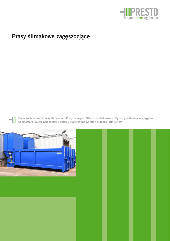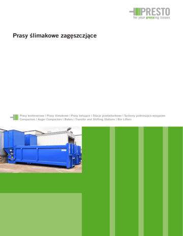 Prasy ślimakowe zagęszczjące Prasy kontenerowe | Prasy ślimakowe | Prasy belujące | Stacje przeładunkowe | Systemy podnosząco-wysypowe Compactors | Auger Compactors | Balers | Transfer and Shifting Stations | Bin Lifters Prasy ślimakowe zagęszczjące Uniwersalne i wydajne Proste i bezpieczne Prasy ślimakowe zagęszczające PRESTO to urządzenia zagęszczające wysokiej mocy, przeznaczone do użytkowania wszędzie tam, gdzie na niewielkim miejscu należy zagospodarować lub zutylizować duże ilości materiałów odpadowych względnie odpadów. Niezawodność funkcjonowania oraz łatwość obsługi charakteryzują wszystkie produkty PRESTO. Nie tylko w trakcie pracy, ale również w kontekście integrowania ze środowiskiem roboczym. Ułożyskowany jednostronnie i poziomo wał ślimakowy podczas swej pracy przesuwa i wciska materiał do kontenera PRESTO. Uzyskiwany stopień wypełnienia może być do 60 % wyższy niż w przypadku stosowania pras tłokowych. Zastosowanie urządzenia ślimakowego zagęszczającego PRESTO jest możliwe od razu po zamontowaniu maszyny na przeznaczonym dla niej fundamencie i przyłączeniu przewodu zasilającego w energię elektryczną. W trakcie przewożenia wypełnionego kontenera PRESTO jednostka prasująca pozostaje w miejscu użytkowania, co zwiększa użyteczny tonaż pojazdów. Utylizacja bez trosk Dostosowane do potrzeb klienta Ponowne wykorzystanie surowców wtórnych lub utylizacja odpadów stanowią bardzo istotne zadanie w działalności wielu przedsiębiorstw. Urządzenia ślimakowe zagęszczające PRESTO w miarodajnym stopniu przyczyniają się do minimalizacji kosztów tych prac. Prasy ślimakowe zagęszczające PRESTO znajdują zastosowanie do wykazujących silną ekspansywność surowców wtórych, uzyskiwanych np. w sieciach handlowych, jak również do innych specyficznych zadań. Wieloletnie doświadczenia w zakresie technik związanych z ochroną środowiska oraz stosowane przez nas nowoczesne metody opracowywania i produkcji urządzeń umożliwiają nam wytwarzanie takich produktów, które służą naszym klientom jako funkcjonalne i korzystne kosztowo ogniwo w obiegu materiałów poddawanych sprasowaniu względnie przeznaczonych do utylizacji. Bogaty wybór oprzyrządowania i możliwość dostosowania do miejscowych warunków umożliwiają spełnienie wszelkich indywidualnych życzeń naszych klientów. To naszym zadaniem jest udostępnienie indywidualnego i optymalnego rozwiązania dla stojących przed klientem zadań utylizacyjnych. Zwróć się do nas! Opis i korzyści Posiadający kształt stożka wał ślimakowy uzyskuje bardzo wysoki stopień zagęszczenia materiału, co pozwala na uzyskiwanie wysokiej masy pojemników wypełnionych sprasowanym materiałem. Waś ślimakowy zapobiega ponadto powstawaniu zatorów w przypadku zagęszczania materiałów ekspansywnych. Automatyczny układ smarowania eliminuje prace związane z utrzymaniem, nie jest narażony na zanieczyszczenia i zapewnia długi czas użytkowania urządzenia. Zależne od zagęszczanego materiału urządzenia doprowadzania materiału dokonują optymalnego wstępnego rozdrobnienia materiału i zapobiegają powstawaniu zatorów materiału. Gwarantowana wysoka wydajność Wytrzymała i wykonana z najwyższą starannością konstrukcja stalowa zapewnia długotrwałe i niezawodne użytkowanie urządzenia. Najwyższej jakości części i zespoły gwarantują niezawodne działanie, niewielkie nakłady na konserwację oraz cichą pracę urządzenia < 65 dB (A). Szczególny sposób zagęszczania materiału zapewnia bezproblemowe opróżnianie pojemników, gwarantując zarazem maksymalny stopień zagęszczenia oraz minimalizację potrzebnej powierzchni. Zastosowane lakiery są oczywiście wolne od ołowiu i chromianów, a jednocześnie klient ma możność wyboru koloru zamówionego urządzenia. Bezpiecznik nadmiernego obciążenia oraz automatyka zwrotna zapewniają długi okres użytkowania urządzenia. for your pressing issues Prasy ślimakowe zagęszczjące SP SPN 11 SPN 15 Długość (L) mm 1335 1510 1510 Szerokość (B) mm 1620 1620 1620 Szerokość bez urządzenia sprzegającego mm 1620 1620 1620 Wysokość (H) mm 1250 1250 1250 Miara A mm 1250 1250 1250 mm 1200 x 1380 1225 x 1380 1225 x 1380 14 15 15 Otwór wrzutowy Liczba obrotów ślimaka n/min Wielkość ślimaka w przekroju mm 800 / 500 800 / 500 800 / 500 Moment obrotowy znamionowy Nm 7484 7004 9550 kg 1800 2200 2200 KW 11 11 15 Masa maszyny Moc silnika Przyłącze elektryczne 3 L / N / PE; 400 V,50 Hz Zmiany techniczne zastrzeżone. Treść SPB 16 SPB 20 SPB 25 SPB 28 SPB 30 m³ 16 20 25 28 30 Długość (L) mm 4190 4730 5450 6000 6540 Szerokość (B) mm 2420 2420 2420 2420 2420 Wysokość (H) mm 2350 2350 2500 2500 2500 Poziom ryglowania (V) mm 2655 2925 3275 3555 3775 kg 2600 2800 3000 3100 3200 Masa maszyny Kontenery do załadunku bramowo-cięgnowego na zapytanie Bramidan S.A. Ul. Łowińskiego 9 | PL-31-752 Kraków Fon +48 (0) 12 680 8880 | Fax +48 (0) 12 680 63 10 [email protected] | www.bramidan.pl PRESTO GmbH & Co. KG Gewerbepark 4 I D-49196 Bad Laer Fon +49 5424 2927-0 I Fax +49 5424 2927-90 [email protected] I www.presto.eu 600350506 / R151102 / P151104 Pojemniki